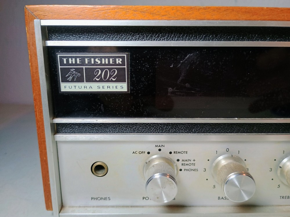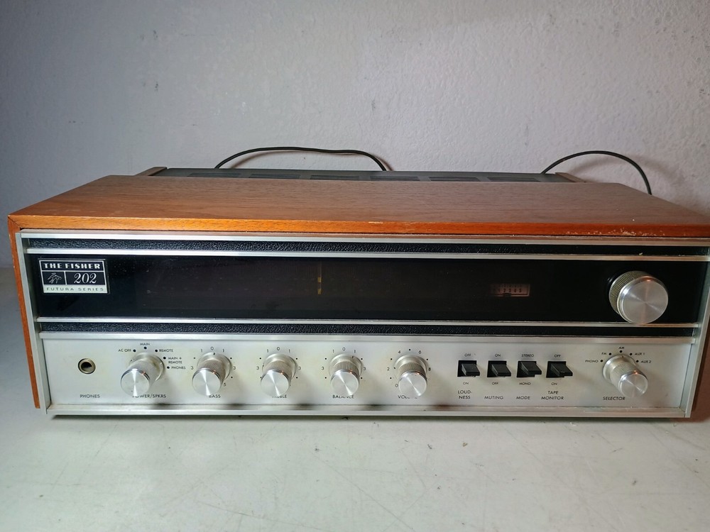 For sale is a vintage, Fisher brand AM/FM stereo receiver. The Fisher - Model 202 Futura Series I believe this is from the early 1970's The unit has been tested and works fine. Two major notes: 1) There is a large scratch in the wood on the top 2) When the volume is adjusted, there is cracking, but once you stop moving the dial, the crackling stops ------------------------------------------- Free standard shipping via USPS Parcel Select, UPS Saver or Fedex Saver to the continental US. SORRY, NO PO BOXES ALLOWED! Thank you for looking at my item. Purchase with confidence (see great feedback) I always deliver items to the shipping carrier within 24 business hours. I proudly repurpose boxes and packaging materials.