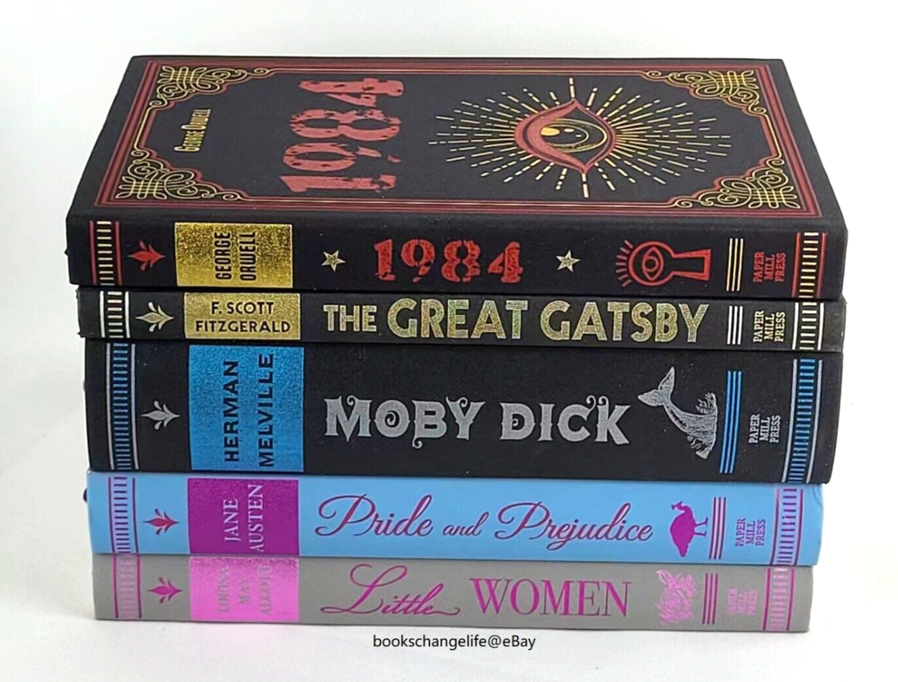 Set of 5 Faux leather bound Classics. This edition of classic novel features a suede-like custom cover with beautiful metallic foiling and a ribbon marker. Moby Dick 1984 The Great Gatsby Little Women Pride and Prejudice Brand New. Gift quality.
