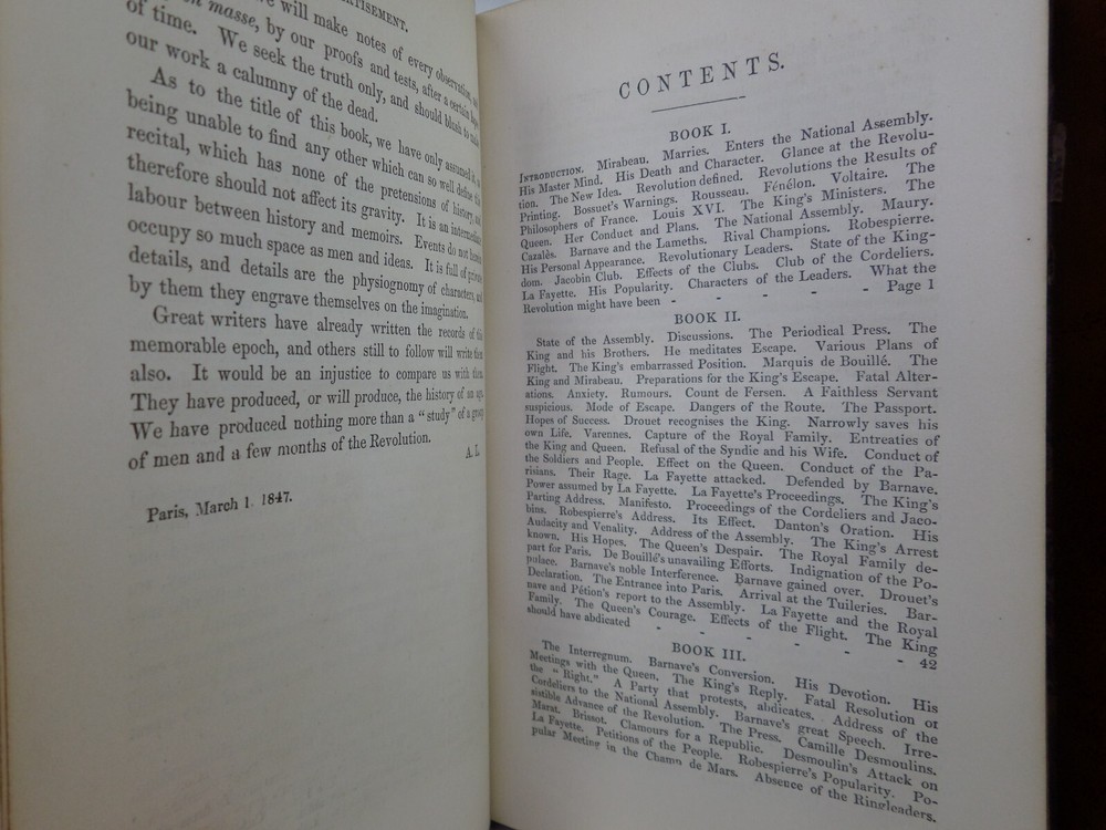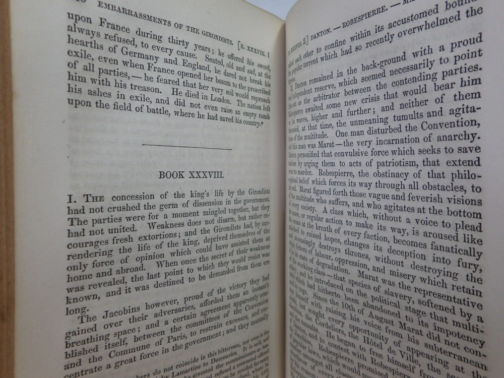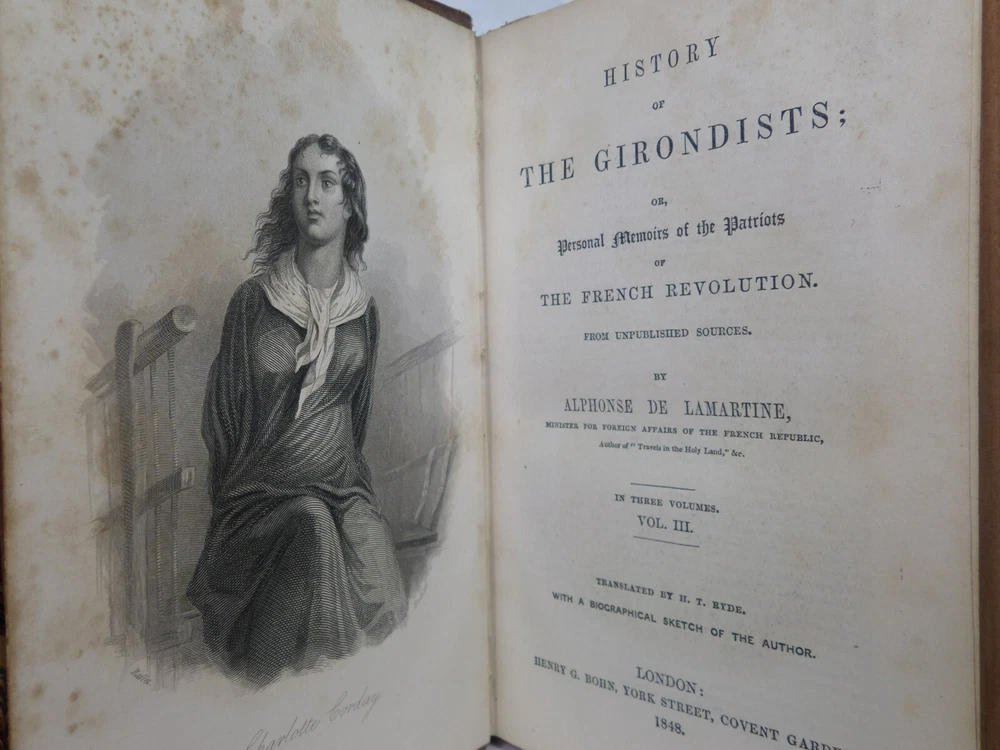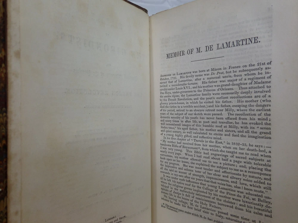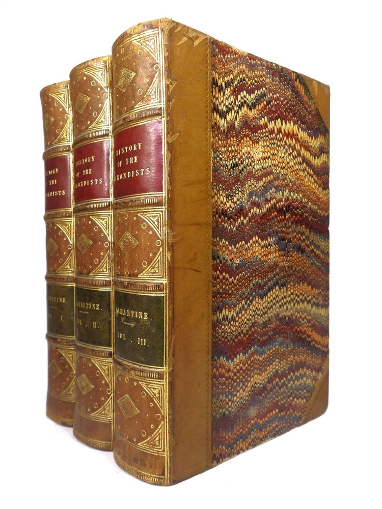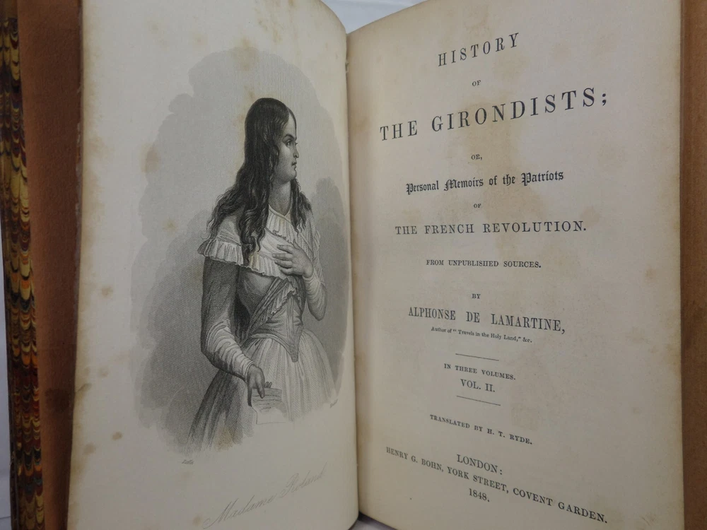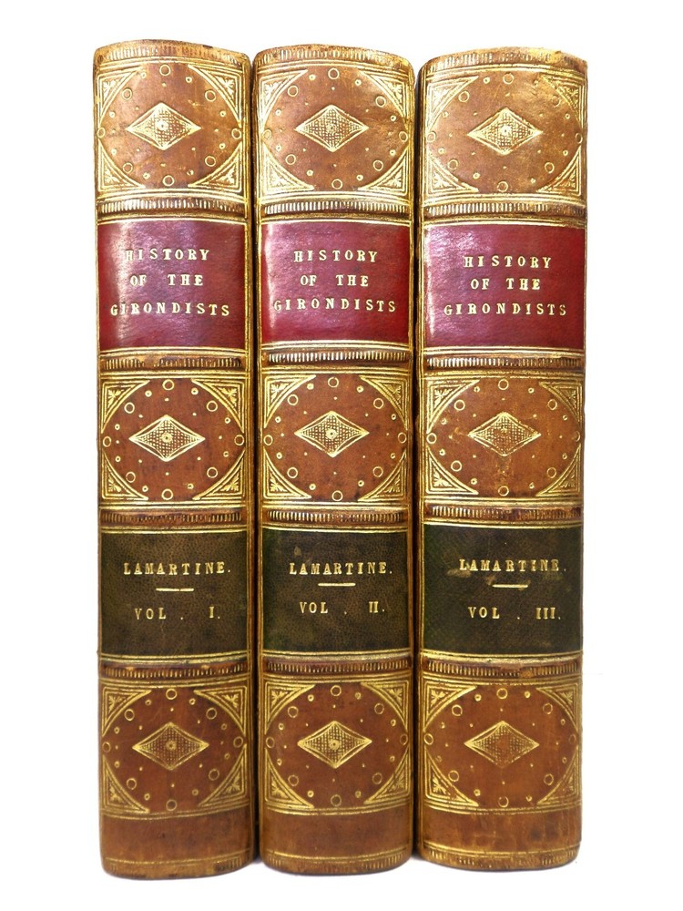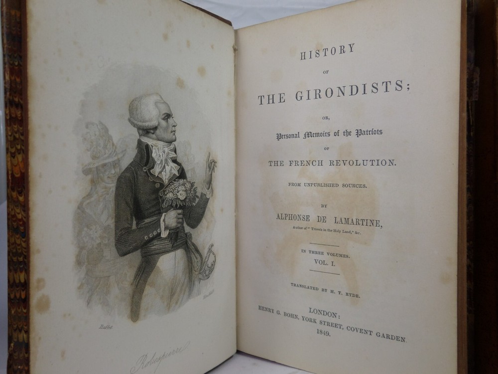 [LAMARTINE, Alphonse de (1790-1869)]. History of the Girondists; or, Personal Memoirs of the Patriots of the French Revolution from Unpublished Sources. Translated by H.T. Ryde. London: Henry G. Bohn, 1848-1849. Leather-bound. In three volumes. Hardcover. Octavo (185 x 115 mm.). Pp. viii, 520; viii, 520; xx, 555. English text, translated by H.T. Ryde. Handsomely bound in contemporary half-calf. Spines gilt in compartments with contrasting morocco lettering-pieces. Marbled boards. Red speckled page edges. Portrait frontispiece in each volume. Printed by Spottiswoodes and Shaw. Condition: VERY GOOD. Bindings tight and secure with the hinges and joints intact. Covers and contents very well-preserved with light foxing to frontispieces. A handsome set. Notes: An early edition in English of Lamartine’s history of the Girondists and their role in the French Revolution, with steelengraved frontispiece portraits. Alphonse de Lamartine served as diplomat and minister of foreign affairs during the Revolution of 1848. “He was a man of action as well as a creative writer—a statesman and a great orator” (Harvey & Heseltine, 390). While credited with quelling the insurrection of May 15th, 1848, he soon after fell out of favor and returned to literary work. History of the Girondists is considered his greatest prose work, which he followed with histories of the Restoration and Revolution. Lowndes, 1299. International tracked shipping - dispatched promptly and securely. Please view my other rare books.