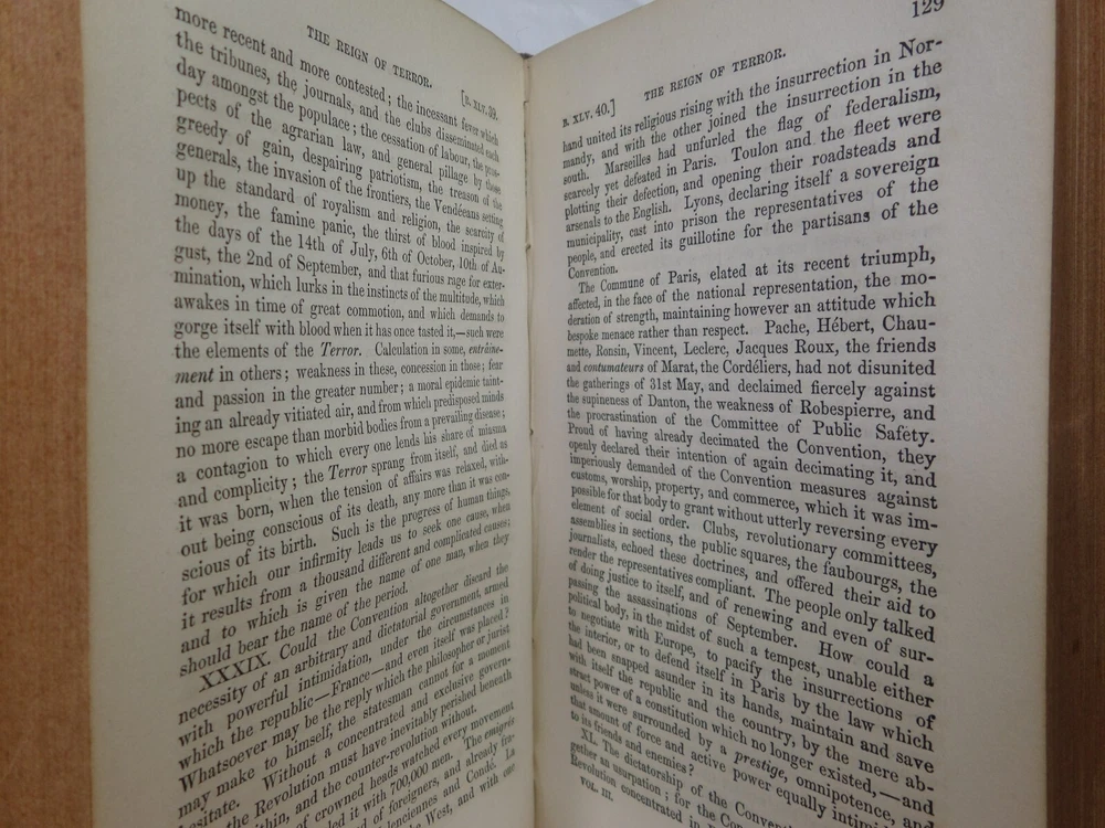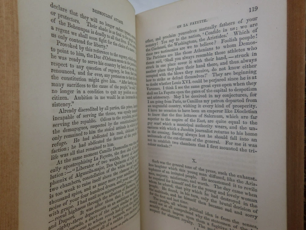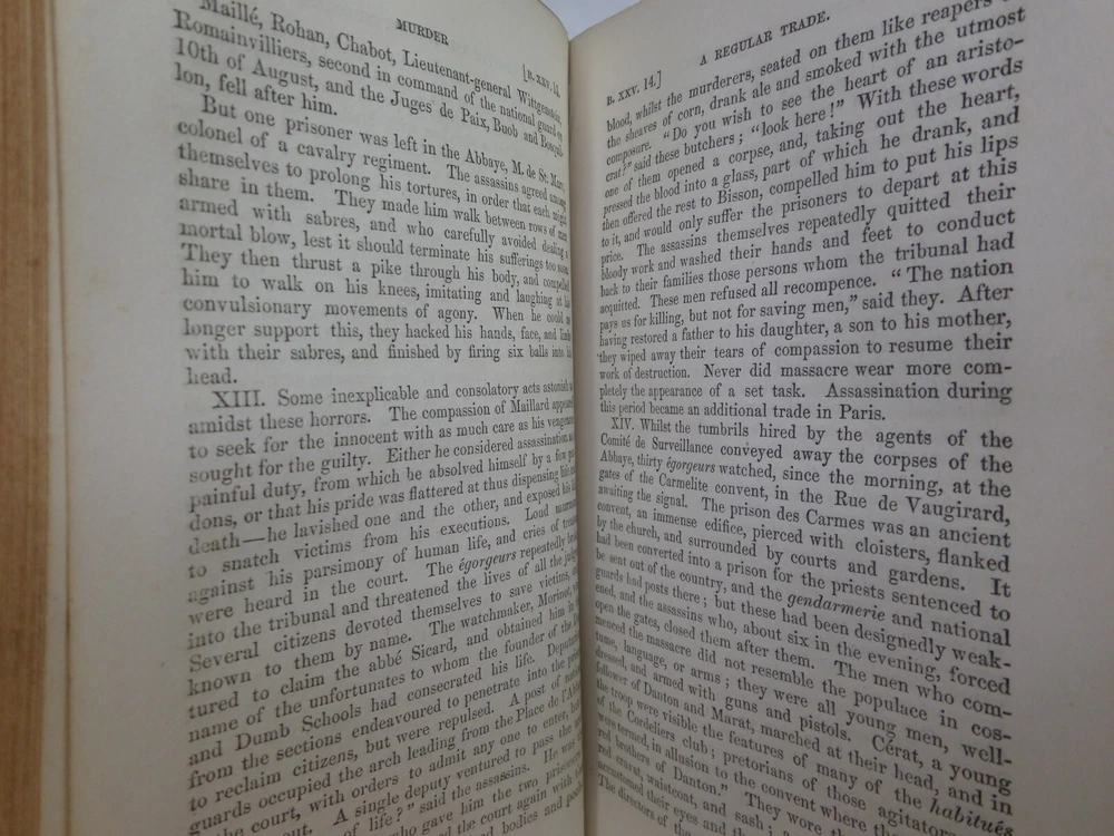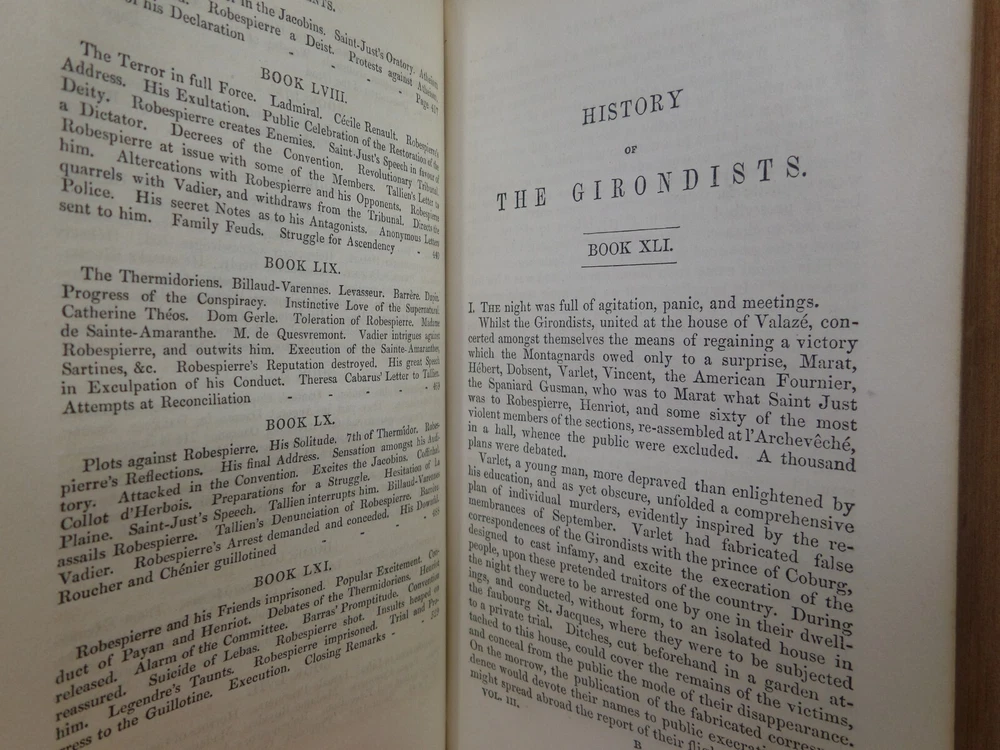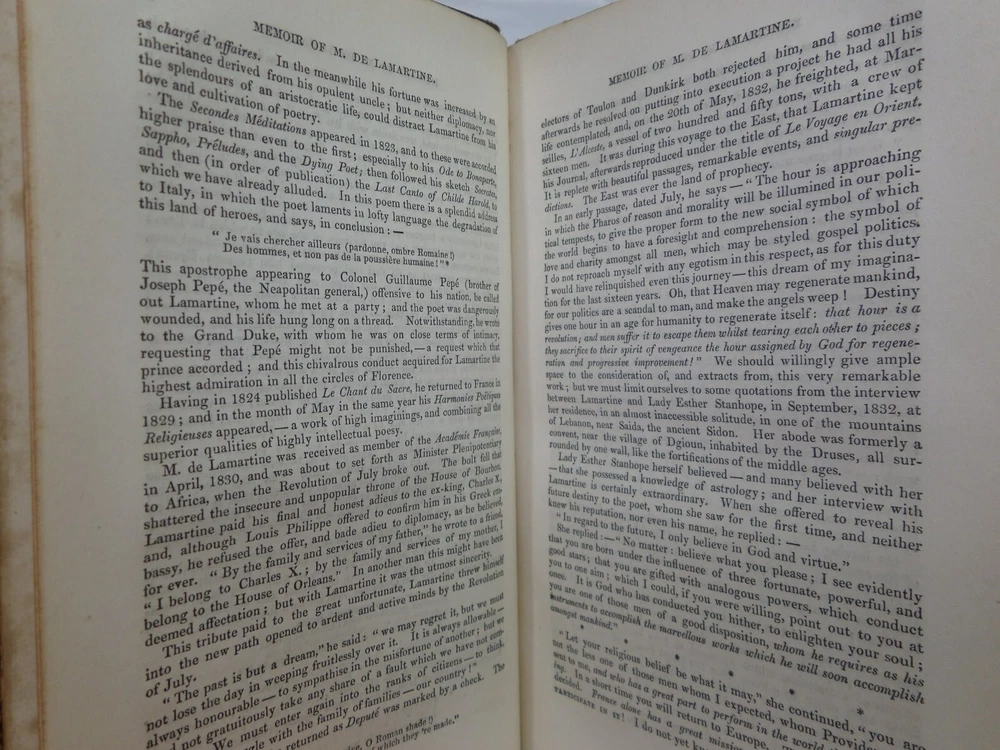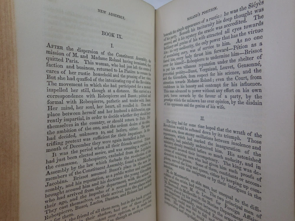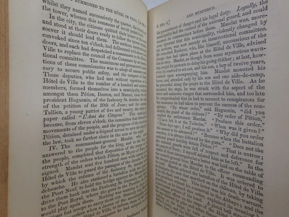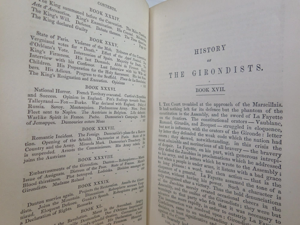 [LAMARTINE, Alphonse de (1790-1869)]. History of the Girondists; or, Personal Memoirs of the Patriots of the French Revolution from Unpublished Sources. Translated by H.T. Ryde. London: Henry G. Bohn, 1848-1849. Leather-bound. In three volumes. Hardcover. Octavo (185 x 115 mm.). Pp. viii, 520; viii, 520; xx, 555. English text, translated by H.T. Ryde. Handsomely bound in contemporary half-calf. Spines gilt in compartments with contrasting morocco lettering-pieces. Marbled boards. Red speckled page edges. Portrait frontispiece in each volume. Printed by Spottiswoodes and Shaw. Condition: VERY GOOD. Bindings tight and secure with the hinges and joints intact. Covers and contents very well-preserved with light foxing to frontispieces. A handsome set. Notes: An early edition in English of Lamartine’s history of the Girondists and their role in the French Revolution, with steelengraved frontispiece portraits. Alphonse de Lamartine served as diplomat and minister of foreign affairs during the Revolution of 1848. “He was a man of action as well as a creative writer—a statesman and a great orator” (Harvey & Heseltine, 390). While credited with quelling the insurrection of May 15th, 1848, he soon after fell out of favor and returned to literary work. History of the Girondists is considered his greatest prose work, which he followed with histories of the Restoration and Revolution. Lowndes, 1299. International tracked shipping - dispatched promptly and securely. Please view my other rare books.