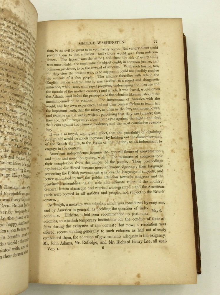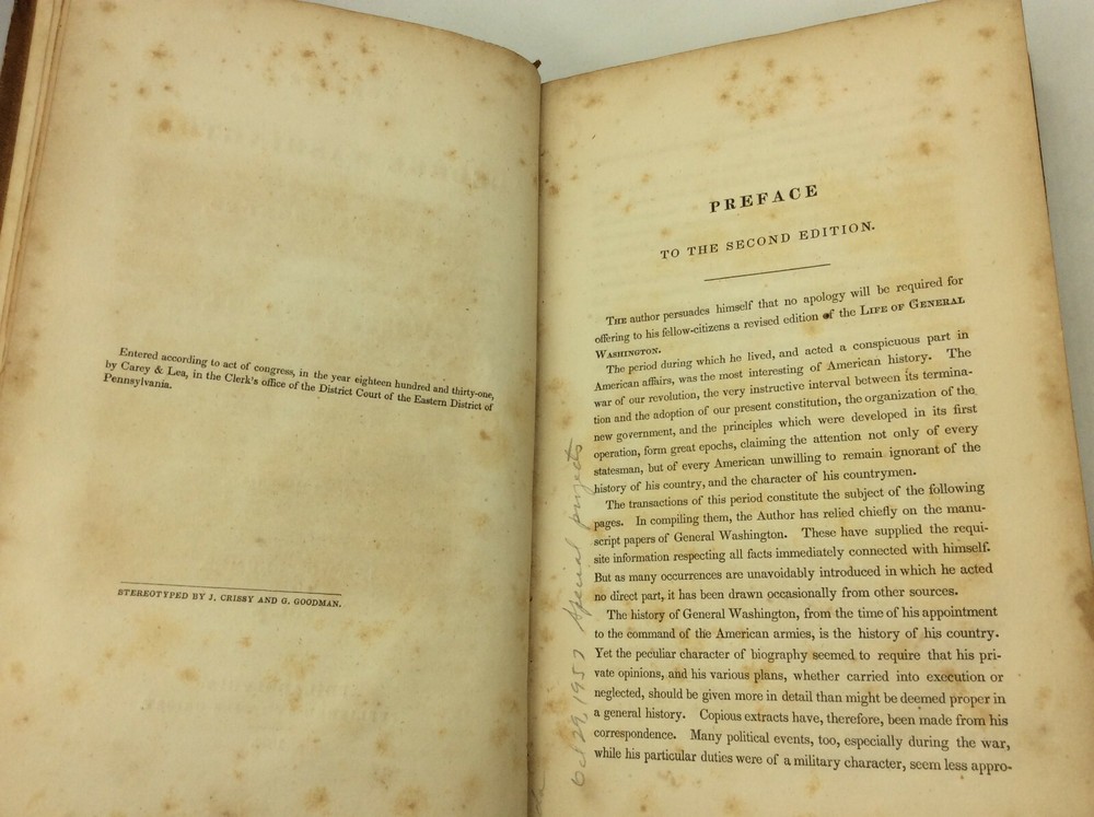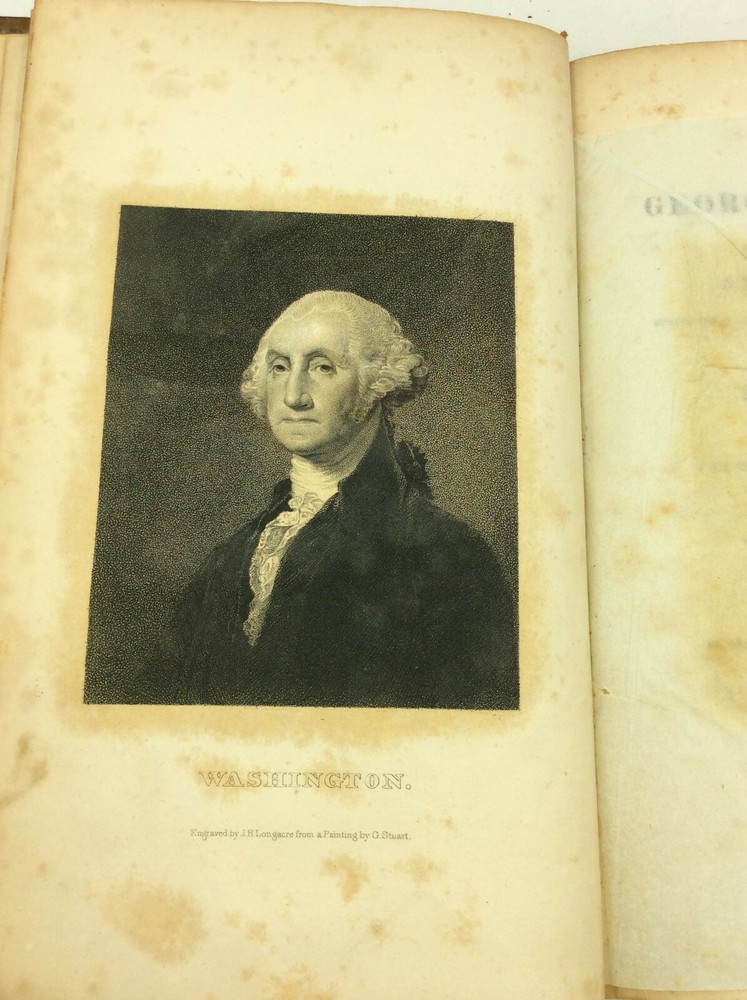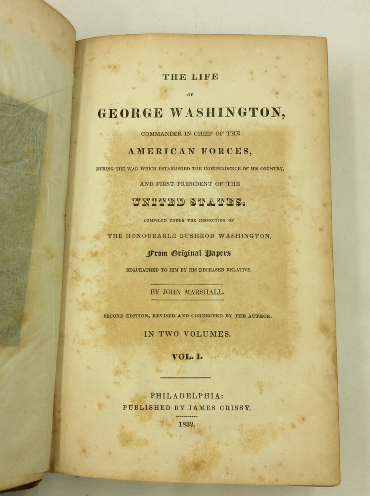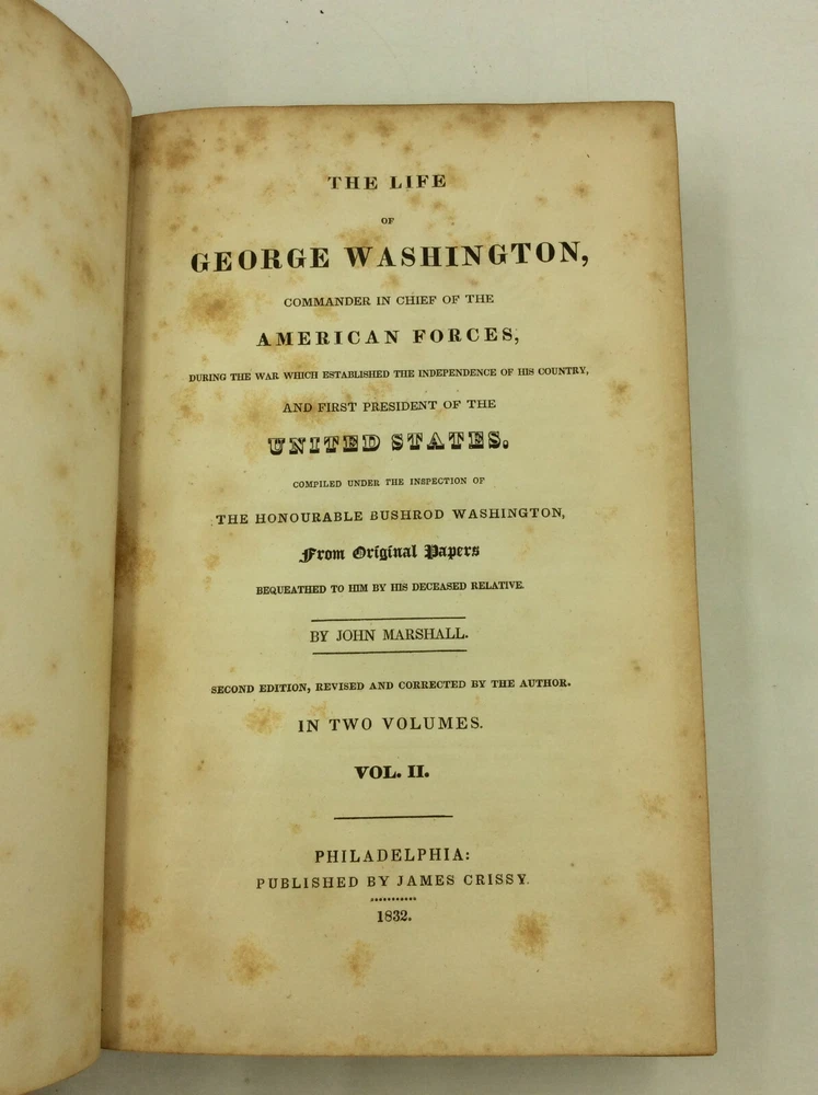 John Marshall THE LIFE OF GEORGE WASHINGTON Philadelphia: James Crissy, 1832. Second Edition. Leather bound. Marshall's classic biography of Washington in the revised and abridged second edition. This set contains the two text volumes but lacks the scarce atlas volume. Bound in full 19th century leather, lacking the spine labels. Scattered foxing throughout. Spines mildly rubbed and chafed. A set of hardcover books in good condition. Item #1245973 A famous history of the first president, written by the famed Supreme Court Chief Justice. The volumes are housed in a simple cardboard box made by a former owner.