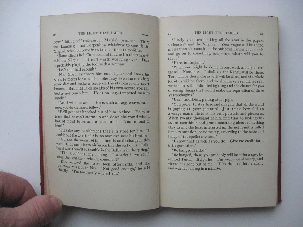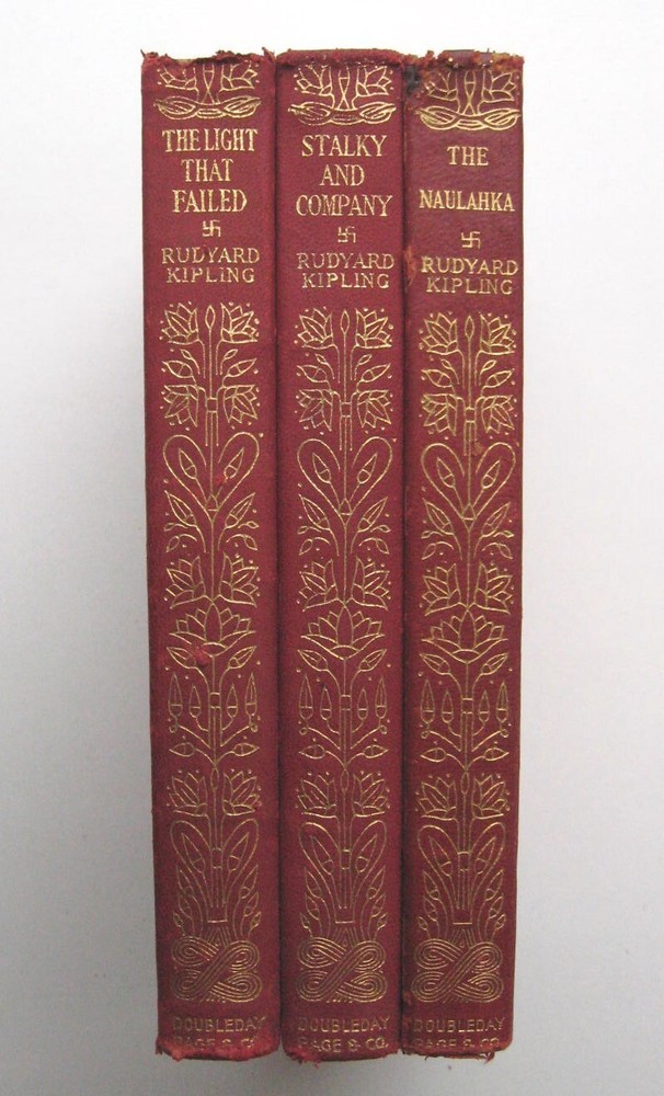 THE LIGHT THAT FAILED STALKY & COMPANY THE NAULAHKA by Rudyard Kipling Description Leather (flexible); 289, 310, 379 pages; Size Approx. 4 3/4 X 7 1/4. Published by Doubleday, Page & Company; 1922 & 1926. Details : These are three leatherbound volumes of Kiplings writings. Bound in red flex leather with gilt elephant on the front covers and gilt decorations and lettering on the spines. Also gilt upper page edges. A fine addition for your bookshelf! Condition : Some wear to the edges of the leather particularly at spine ends and corners, Stalky & Co. has a couple of creases/cracks to the rear inner cover where it has been bent, (see pictures), otherwise all are in good condition with solid bindings and clean pages. Note: The letter/number at the end of the title line for this listing is just an inventory code for locating the book. Shipping Free Domestic Economy Shipping! Check out my other items ! Be sure to add me to your favorites list ! About Us: Rivendell Antiquarian Books sells used rare, vintage and collectable books predominantly from pre 1970. We have been sellers of antiquarian books for over 20 years, and our experience helps ensure quality descriptions of our rare and collectable books. Be assured that we want your experience with Rivendell Antiquarian Books to be enjoyable and problem free. We believe that it is a travesty to simply throw away a used book when there is little or nothing wrong with it - we believe in giving each book the chance of finding a new home. We appreciate the impact a good book can have. We know the excitement of a new page turner, or the familiar joy of an old favorite, and we find satisfaction in putting older, and often scarce books in the hands of people who have the same love for old books that we do. Customer Service: Rivendell Antiquarian Books is committed to ensuring each customer is entirely satisfied with their puchase and our service. If you have any issues or concerns please contact us and we will be more than happy to help. Our books have been inspected carefully by hand by experienced book valuers to ensure the condition description is as accurate as possible for this exact copy pictured. If you have questions about the book before or after purchasing, please feel free to contact us! Packaging: We take pride in packaging our books for safe delivery, and if you check our feedback, you will see this reflected in the comments of many pleased customers. For nearly all of our books, we use a specially designed boxing system from IPS (Inovative Packaging Solutions) located in York, PA. These media shipping boxes are designed to conform to the size of the book, securing it and preventing it from bumping around during shipping. The end result is a box which provides a double thickness of cardboard covering the front and back of the book; actually almost like a box within a box. The outer layer of cardboard extends beyond the ends of the inner "box" which very efficiently protects the corners of the book from being bumped and damaged by the sometimes rough handling packages receive in transit. In addition we place the book in a plastic bag to help guard against moisture if a package is left out in the elements. Delivery: We aim to get all books shipped within 24 hours of order except on weekends. We can't control the delivery time once a book leaves our hands, but most of the time USPS is prompt in delivery, and the expected delivery time given by eBay is usually fairly accurate. Because we use media mail to keep costs down, it does take a little longer for delivery, and occasionally packages get delayed in the mail system. If for some reason your order has not arrived within the expected time frame, please get in contact with us so that we can try to help you.