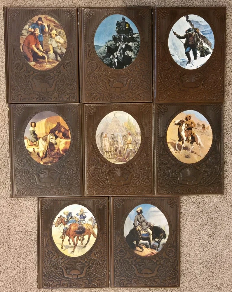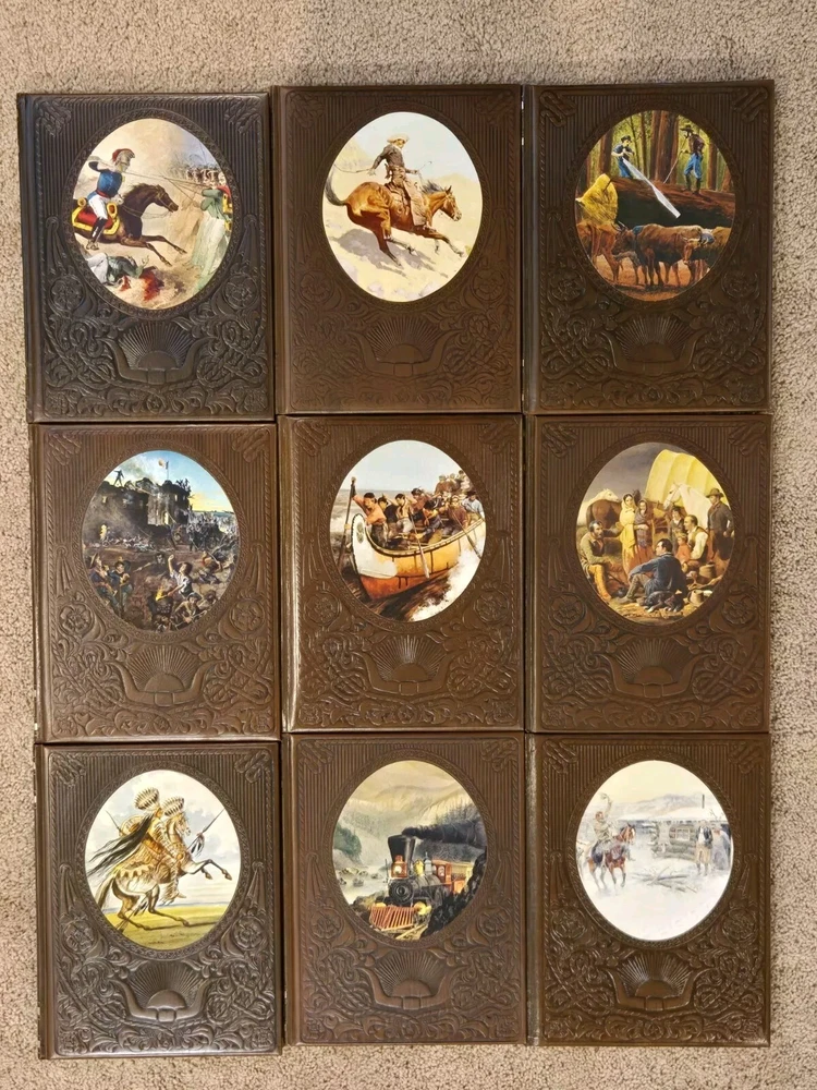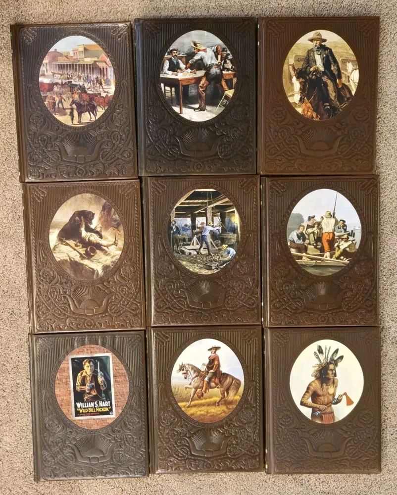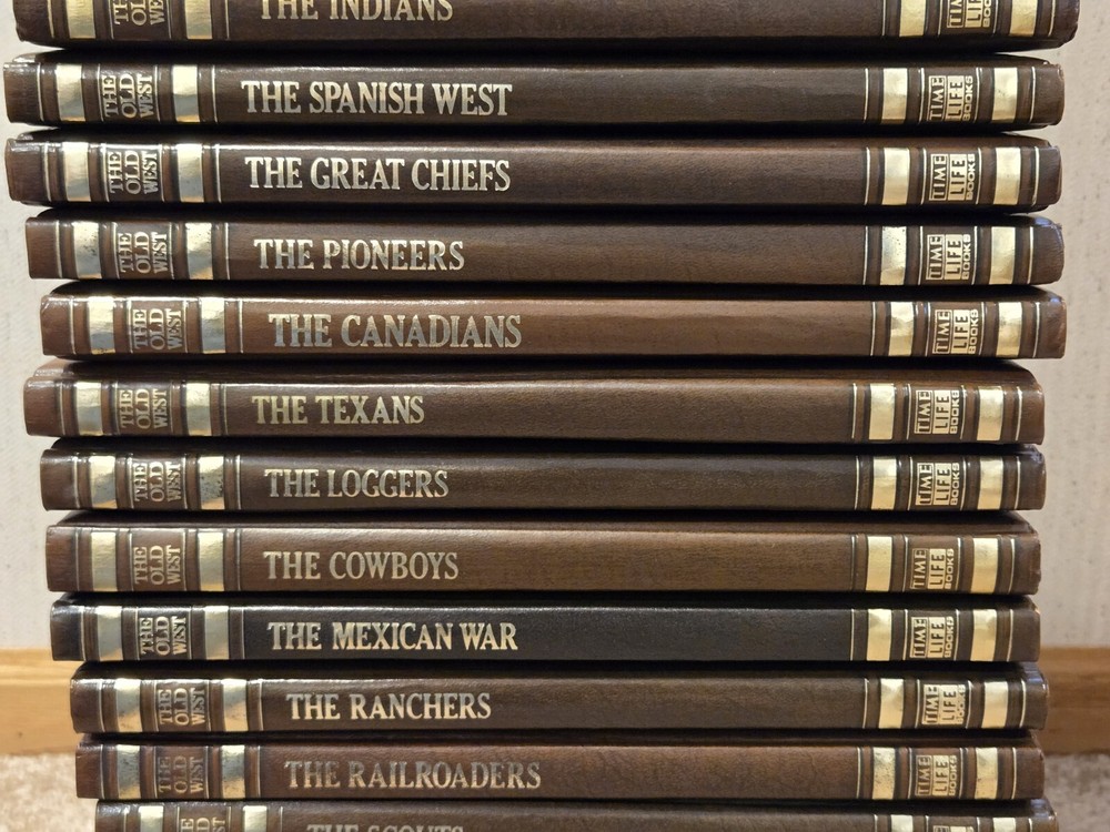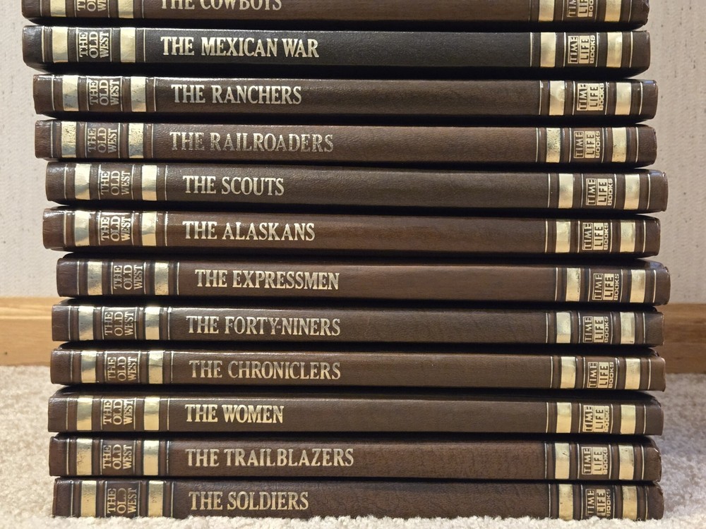 The product is a collection of 26 volumes titled "THE OLD WEST" by various authors, published by Time Life Books in the 1970's. The books are nonfiction, focusing on the history of America's Old West. They are hardcover, faux leather bound, and illustrated, providing a detailed look at this iconic era. A few books have previous owner name written in them. Overall very good condition. See photos.