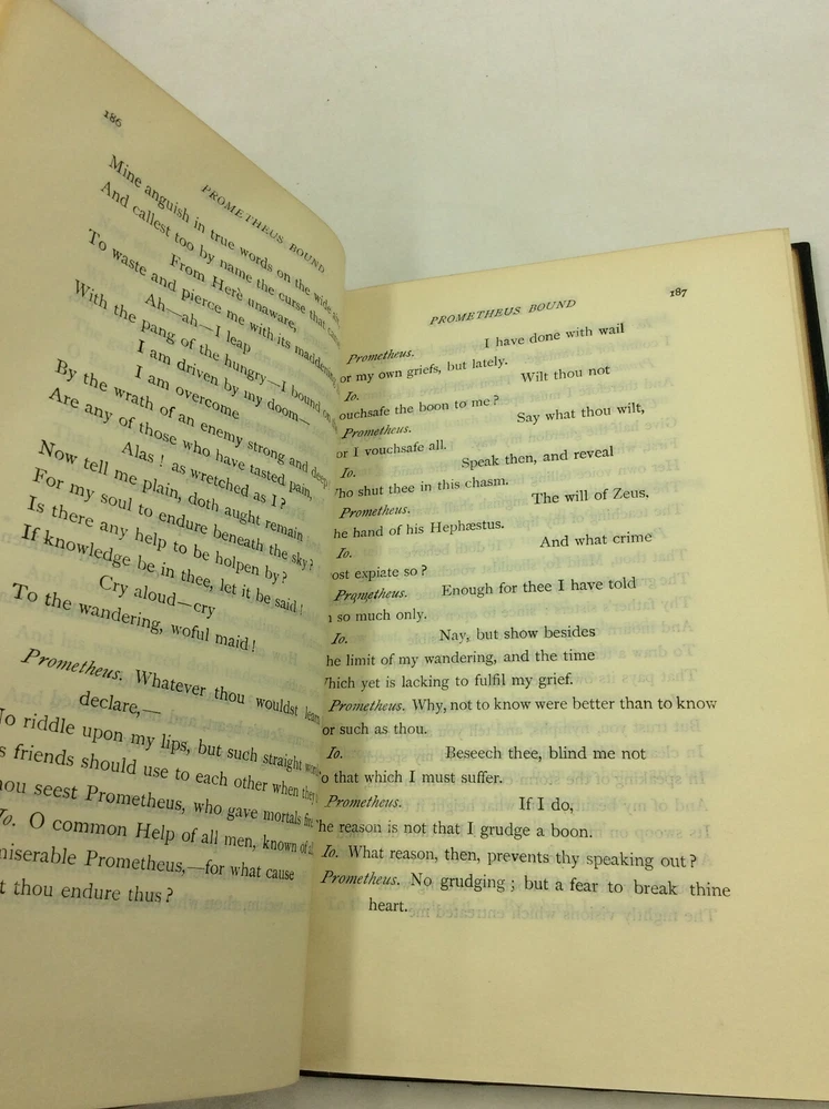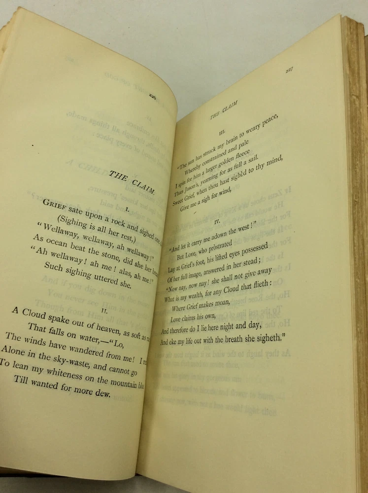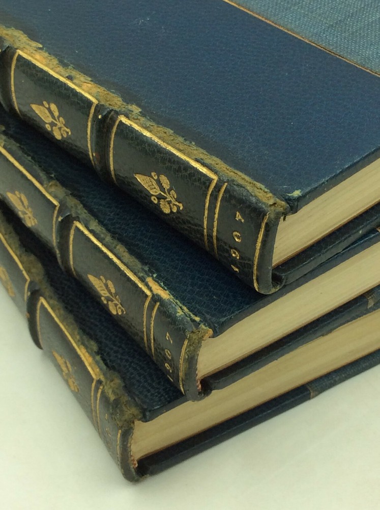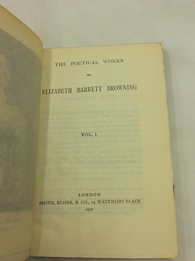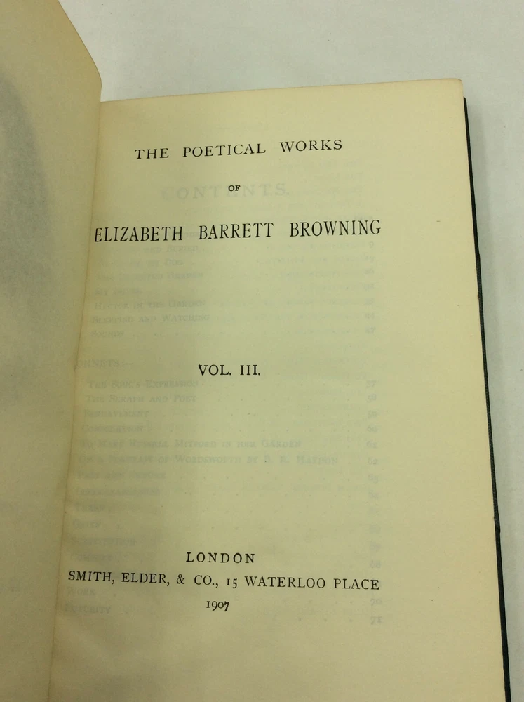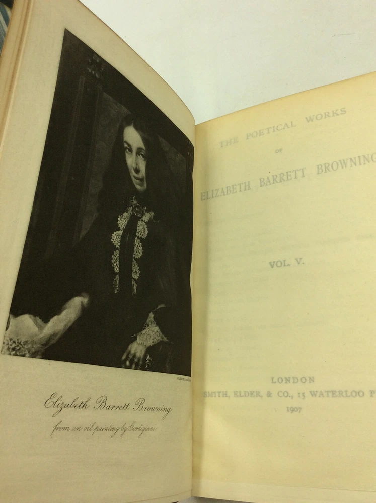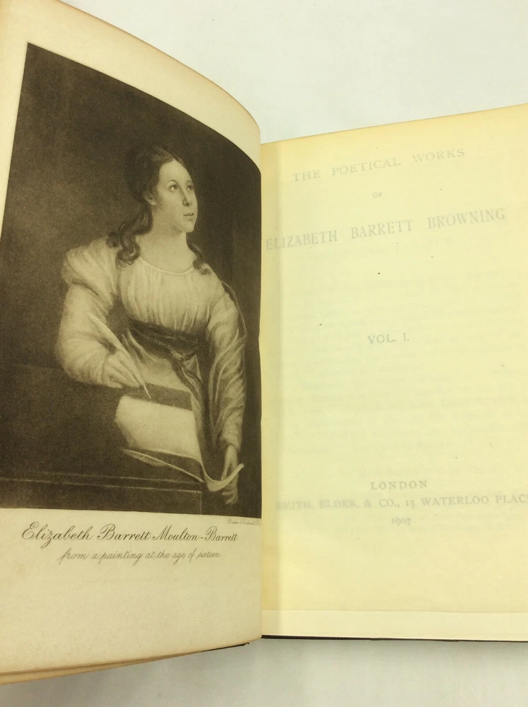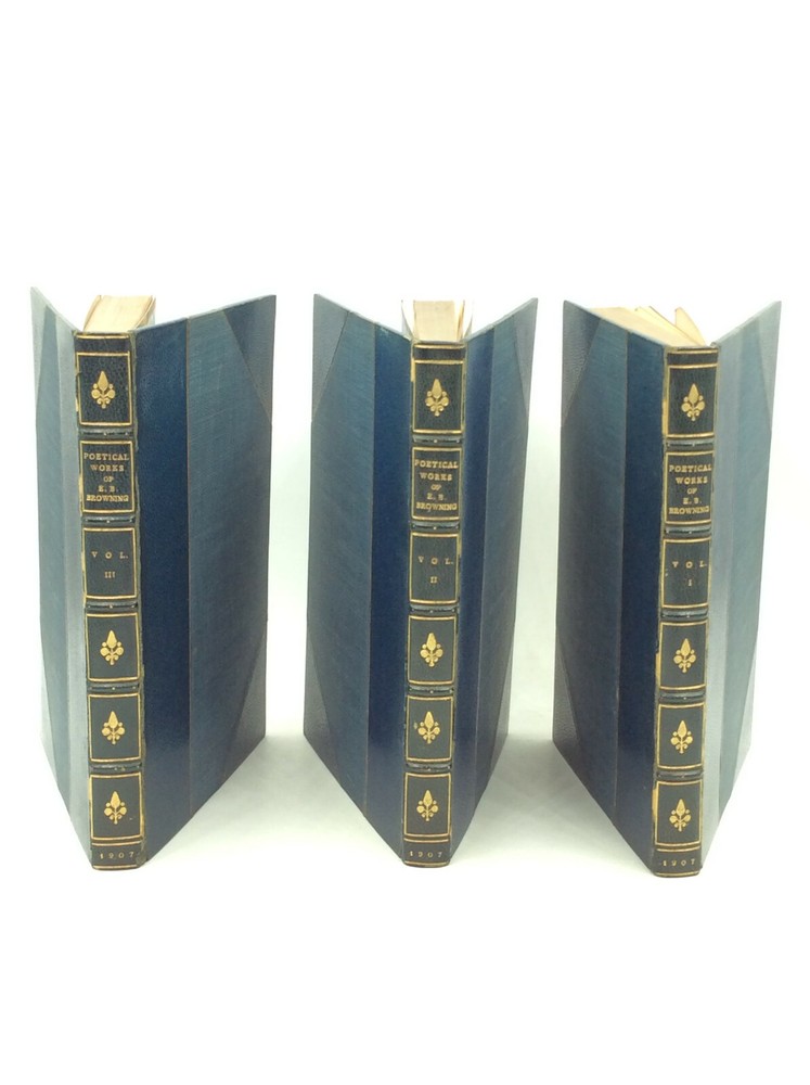 Elizabeth Barrett Browning THE POETICAL WORKS OF ELIZABETH BARRETT BROWNING, Volumes I-VI in 3 books London: Smith, Elder, & Co., 1907. Leather. 6 volumes in 3 books. A set of three small hardcover books bound in 3/4 blue leather with blue cloth boards and gilt-embellished spines. The endpapers are marbled and the top edges trimmed in gilt. Very good condition overall. Th edges of the spines are rubbed and the tips of the endpapers are tanned. Otherwise, the pages are clean and the binding secure across the set. Item #177070 Each volume measures approx. 6.75" x 4.5"
