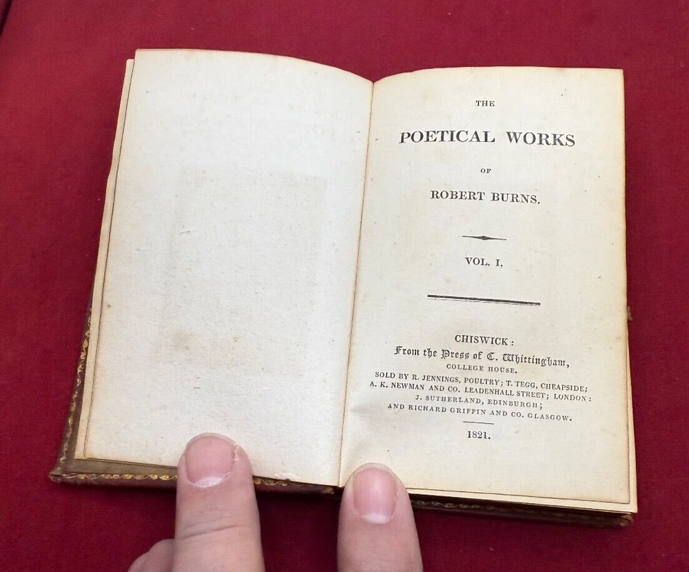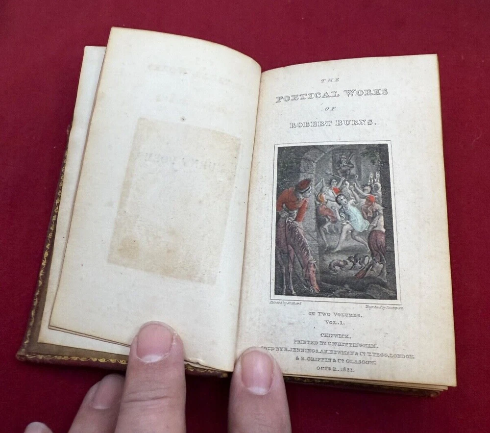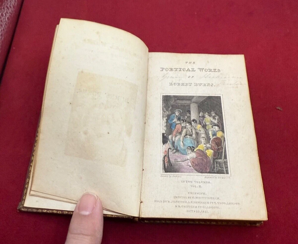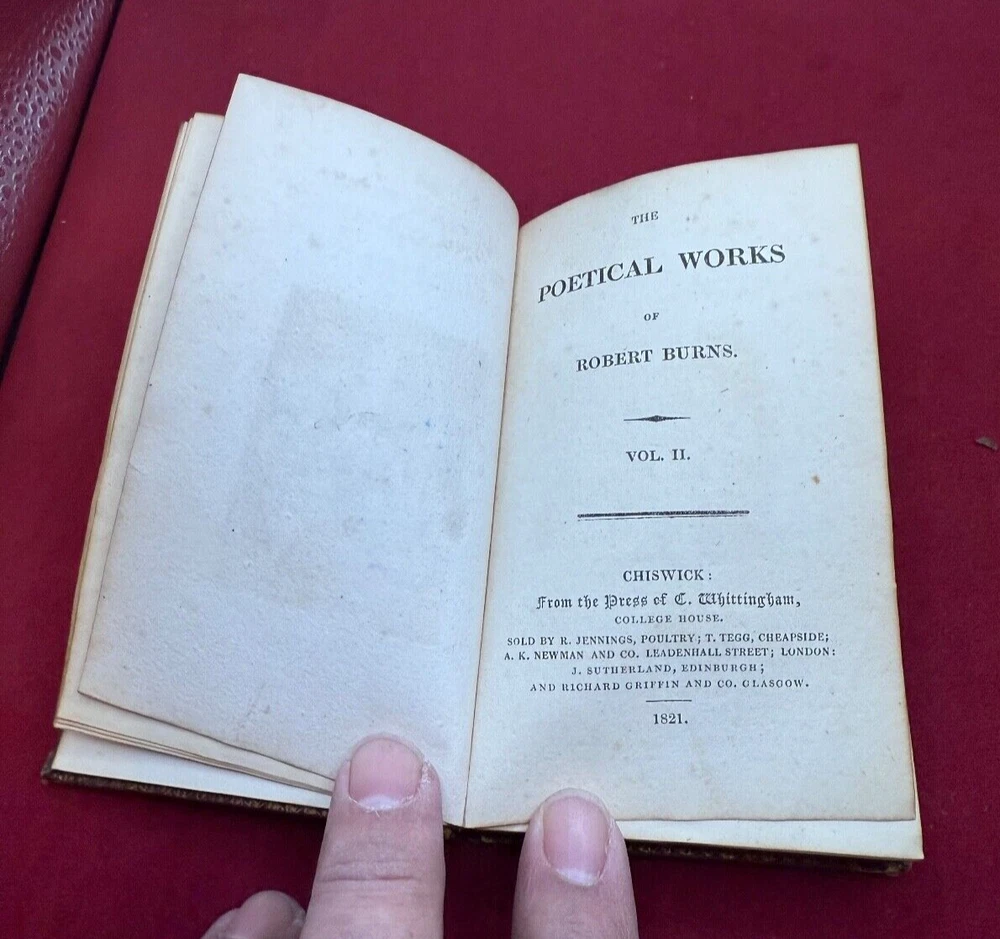 THIS LISTING IS FOR A BOOK TITLED THE POETICAL WORKS OF ROBERT BURNS IN TWO VOLUMES DATED 1821. VOLUME 1 CHISWICK PRINTED BY C. WHITTINGHAM SOLD BY R JENNINGS LONDON GLASGOW. OCT 11 1821. 212PGS VOLUME 2 -CHISWICK PRINTED BY C. WHITTINGHAM SOLD BY R JENNINGS LONDON GLASGOW OCT 22 1821 BOTH VOLUMES INTACT WITH HAND COLORED ENGRAVING ILLUSTRATION AT FRONT. BOOKS MEASURE ABOUT 3 1/4 BY 5 INCHES 9 NOTED IN PENCIL INSIDE CONTEMPORARY MORROCO THE PHOTOS SHOW THE ACTUAL CONDITION OF THE BOOK AND SELLER WILL LIST ADDITIONAL INFORMATION IF NEED BE. LIGHTING VARIES WITH EACH PHOTO AND SHADOWS OR DARK/LIGHT SPOTS MAY BE A RESULT OF CURRENT LIGHTING AT THE TIME OF PHOTO TAKING. THE SELLER ASKS THAT BIDDERS TAKE THE TIME TO EXAMINE THE PHOTOS CAREFULLY AS THEY SHOW THE ACTUAL CONDITION AND ASK QUESTIONS AS WELL IF YOU REQUIRE FURTHER INFORMATION. SOLD AS IS, NO RETURNS. ALL SALES FINAL . PLEASE MAKE CERTAIN TO VIEW ALL THE SELLERS OTHER LISTINGS INCLUDING THE "STORE". SELLER HAS RECENTLY ACQUIRED CONTENTS OF LOCAL LONG ISLAND, NY ESTATES ALONG THE NORTH SHORE MOSTLY HUNTINGTON TOWNS OF NORTHPORT,COLD SPRING HARBOR,LOCUST VALLEY ETC. MOST OF THE CONTENTS ARE VINTAGE TOYS/GAMES/COLLECTIBLES INCLUSIVE OF SPORTING,PAPER,POSTCARDS, LOCAL MEMORABILIA, US COINS, WORLDS FAIR ETC. SELLER WILL BE LISTING FOR QUITE SOME TIME SO IF THERE IS AN AREA OF INTEREST BE SURE TO SEND INQUIRY. THANK YOU!! .