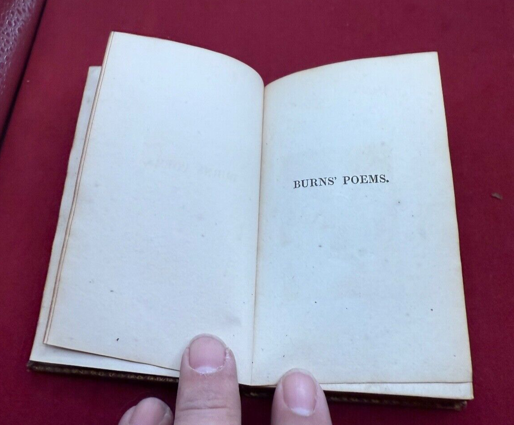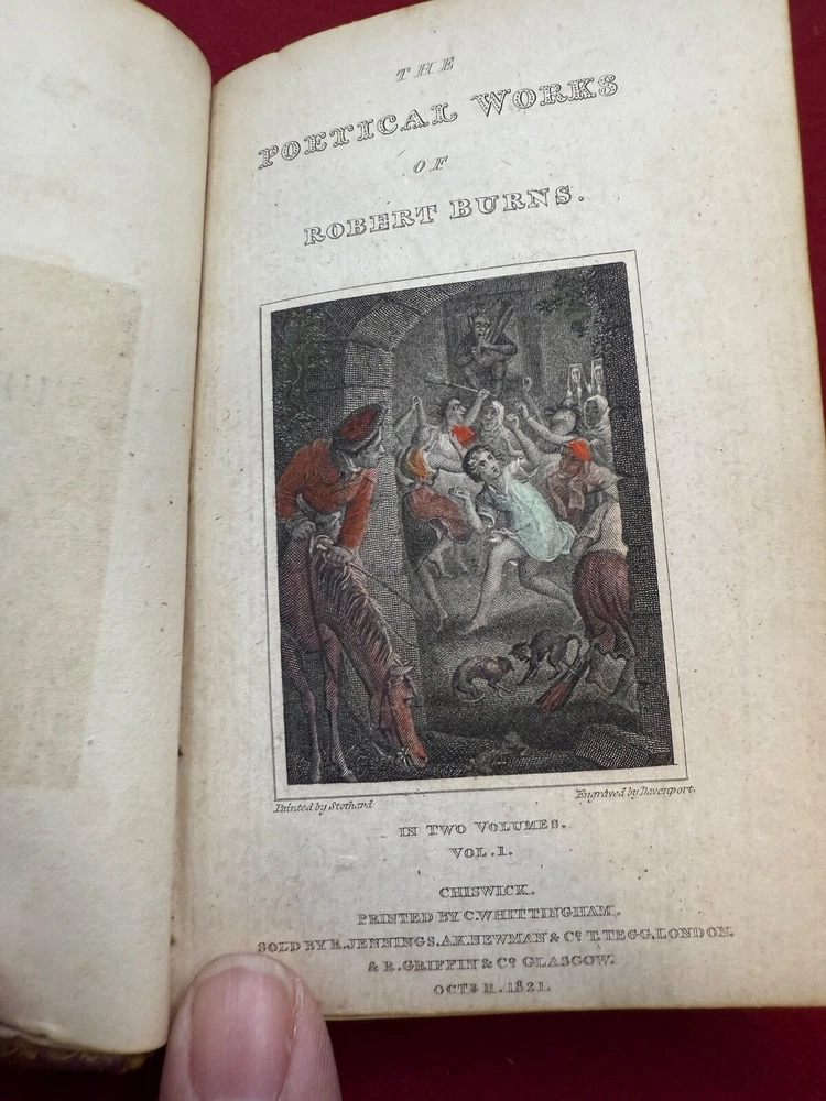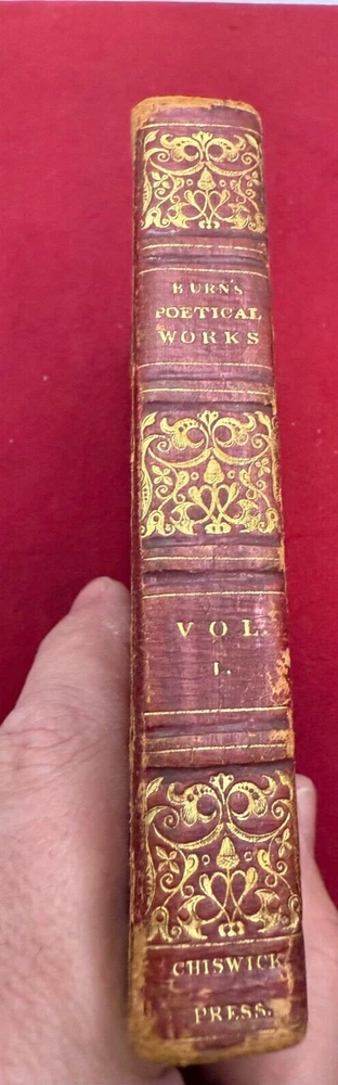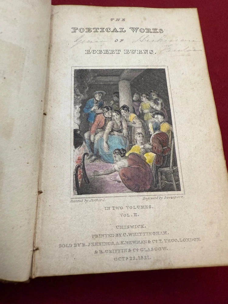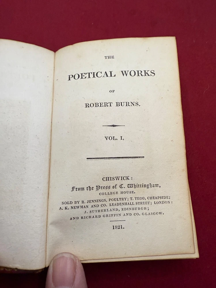 THIS LISTING IS FOR A BOOK TITLED THE POETICAL WORKS OF ROBERT BURNS IN TWO VOLUMES DATED 1821. VOLUME 1 CHISWICK PRINTED BY C. WHITTINGHAM SOLD BY R JENNINGS LONDON GLASGOW. OCT 11 1821. 212PGS VOLUME 2 -CHISWICK PRINTED BY C. WHITTINGHAM SOLD BY R JENNINGS LONDON GLASGOW OCT 22 1821 BOTH VOLUMES INTACT WITH HAND COLORED ENGRAVING ILLUSTRATION AT FRONT. BOOKS MEASURE ABOUT 3 1/4 BY 5 INCHES 9 NOTED IN PENCIL INSIDE CONTEMPORARY MORROCO THE PHOTOS SHOW THE ACTUAL CONDITION OF THE BOOK AND SELLER WILL LIST ADDITIONAL INFORMATION IF NEED BE. LIGHTING VARIES WITH EACH PHOTO AND SHADOWS OR DARK/LIGHT SPOTS MAY BE A RESULT OF CURRENT LIGHTING AT THE TIME OF PHOTO TAKING. THE SELLER ASKS THAT BIDDERS TAKE THE TIME TO EXAMINE THE PHOTOS CAREFULLY AS THEY SHOW THE ACTUAL CONDITION AND ASK QUESTIONS AS WELL IF YOU REQUIRE FURTHER INFORMATION. SOLD AS IS, NO RETURNS. ALL SALES FINAL . PLEASE MAKE CERTAIN TO VIEW ALL THE SELLERS OTHER LISTINGS INCLUDING THE "STORE". SELLER HAS RECENTLY ACQUIRED CONTENTS OF LOCAL LONG ISLAND, NY ESTATES ALONG THE NORTH SHORE MOSTLY HUNTINGTON TOWNS OF NORTHPORT,COLD SPRING HARBOR,LOCUST VALLEY ETC. MOST OF THE CONTENTS ARE VINTAGE TOYS/GAMES/COLLECTIBLES INCLUSIVE OF SPORTING,PAPER,POSTCARDS, LOCAL MEMORABILIA, US COINS, WORLDS FAIR ETC. SELLER WILL BE LISTING FOR QUITE SOME TIME SO IF THERE IS AN AREA OF INTEREST BE SURE TO SEND INQUIRY. THANK YOU!! .