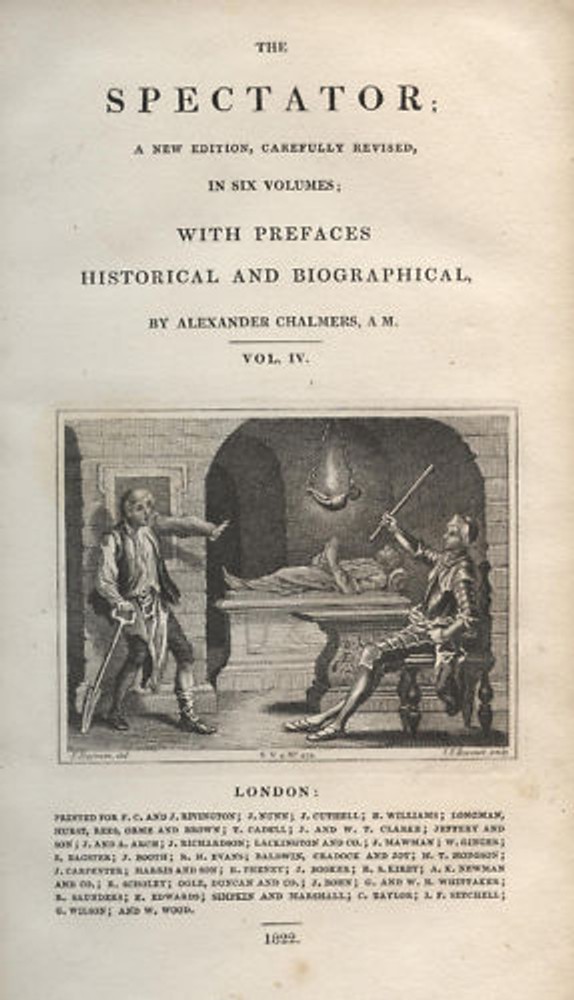 The Spectator Volume IV only (from a six volume set) Printed in 1822 by George Woodfall, Angel-Court, Skinner-Street, London This is an 1822 printing of THE SPECTATOR , the famous London daily publication of 1711, 1712, and 1714. The founders and main writers of THE SPECTATOR were Joseph Addison (1672-1719) and Richard Steele (1672-1729). This is a hardback book with leather spine and corners, 8 3/4" by 5 1/2", 538 pages. The cover and the endpages have a marbleized design, as do the edges of the pages. PLEASE NOTE: the front cover is detached. There is a 1" piece missing from the top of the spine. The edges of the corners are exposed. The back cover is somewhat loose, though still firmly attached. The pages are very nice, with no foxing and only light browning. The pages are uncreased, and t he edges are sharp . There is no handwriting or other markings. Aside from the defects noted above, t he book is in basically good condition: straight, flat, sturdy, still retaining some eye appeal, with some general wear. Shipping within the USA is FREE via usps media mail. If you have any questions, please feel free to contact us. ATTENTION international buyers: Please contact me for prices on international shipping.