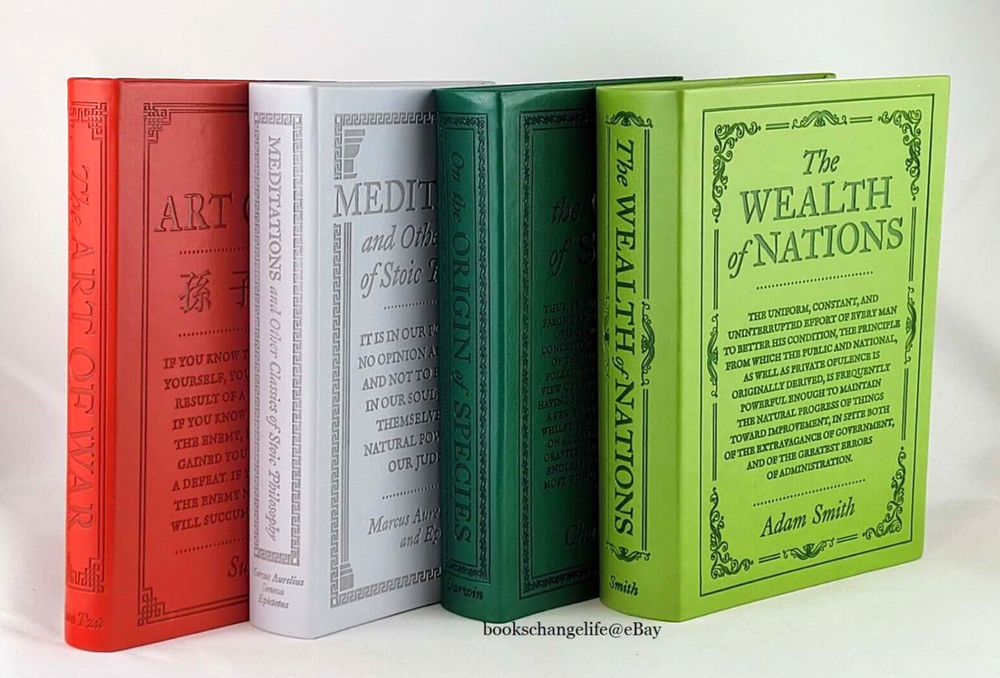 Set of 4 beautiful deluxe faux leather classics: The Wealth of Nations Meditations and Other Classics of Stoic Philosophy The Art of War On the Origin of Species Size of each book: 8.3"x5.4" Total wei...