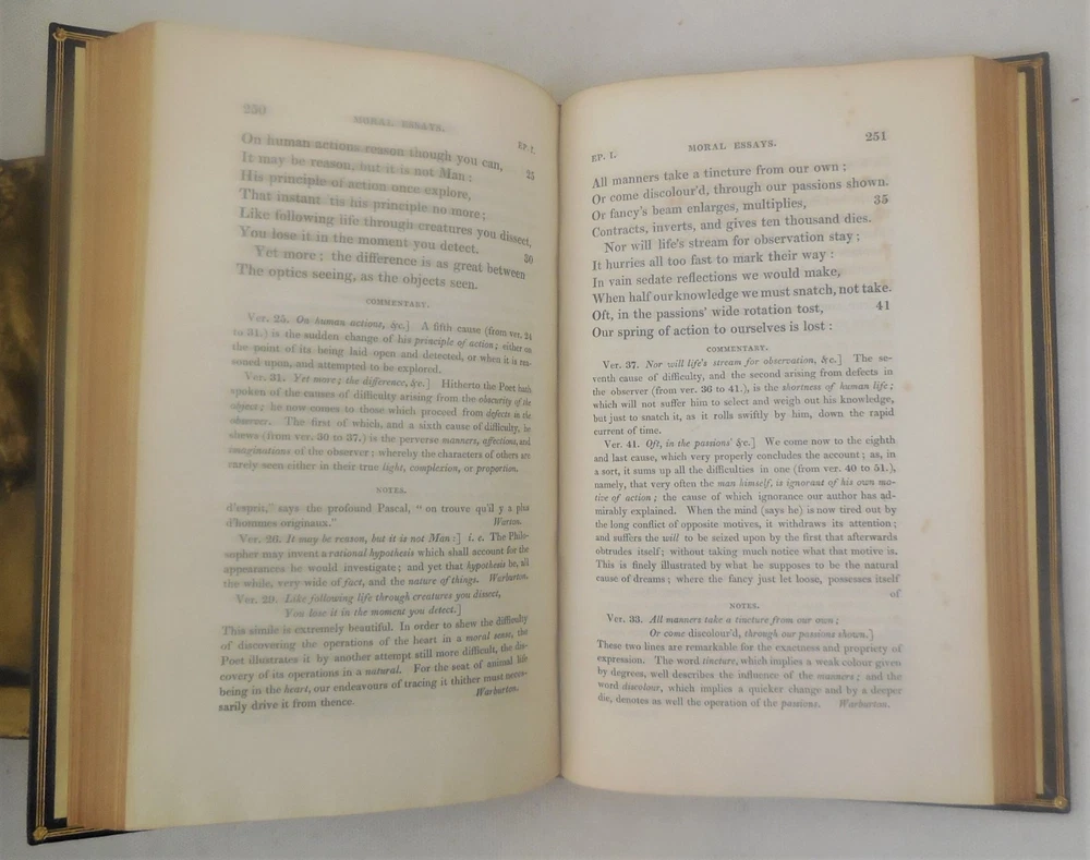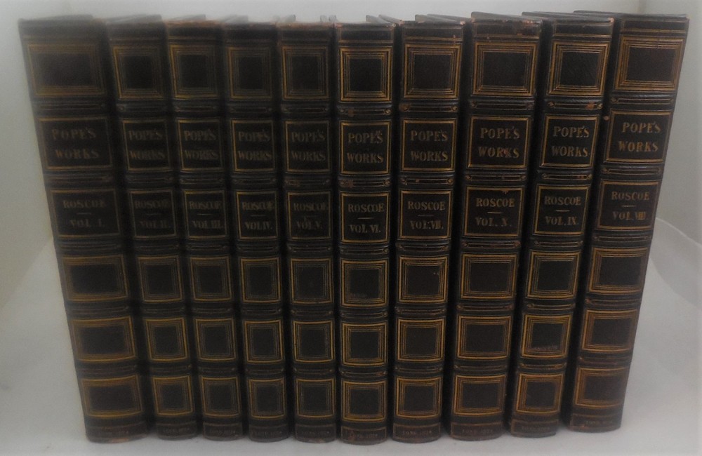 The Works of Alexander Pope by William Roscoe A priceless collection of ten volumes on the life and works of the great English poet. Featuring two engravings of the author, notes and remarks, as well as an estimate of his poetical character and writings, this lot is as much a biography as a compilation of Pope's works. Each volume includes a table of contents, and volume 1 includes a preface as well as a biography; while volume 2 contains an author's preface; volumes 3 to 7 his poetical works, his essays, his verse and prose writings, volume 7 including his Preface to Homer's Iliad and his Postscript to the same writer's Odyssey ; and volumes 8 to 10 a collection of his various letters. Volume 1 contains a fold-out facsimile of an original letter by Pope. 585 pages (vol 1) + 384 pages (vol 2) + 382 pages (vol 3) + 392 pages (vol 4) + 407 pages (vol 5) + 479 pages (vol 6) + 502 pages (vol 7) + 584 pages (vol 8) + 484 pages (vol 9) + 562 pages (vol 10). 5.5 x 8.5 inches. Ten volumes. Handsome 19th C custom leather binding with elaborate bright gilt trimming along all edges as well as textblock. Illustrated with engravings of the author. With fold-out facsimile of author's letter. Ex-libris sticker on front pastedown in all volumes. Published by: C. & J. Rivington, London, 1824. Hardbacks are overall in VERY GOOD condition. Volumes are in overall very good condition with minor commensurate wear on covers and interior. Leather covers feature decorative lines in gilt and some minimal overall rubbing, mostly to perimeters. Boards exhibit mild edgewear from rubbing, and occasional bumps and chips. Corners are gently rubbed. Spines have five raised bands and display text and decorations in gilt, with some rubbing to ends and raised bands. Binding is secure. Yellow endpapers display mild to moderate wear from occasional staining, fading and toning, and exhibit ex-libris sticker on front pastedowns. (See photos) Interior is gently age-toned with occasional scattered foxing especially to feps. Inside pages are free of writing and intentional marks. Some pages have corner creases, and edge foxing. Textblock has all edges gilt, with mild scuffing and creasing of pages occasionally visible. Volume 8 has a chip along lower edge of back cover, from more pronounced rubbing, as well as a small bump to fore edge of back cover. (See photos) Volume 10 exhibits more pronounced scuffing to foot of textblock and creasing of pages is visible. (See photos) Fold-out facsimile in volume 1 shows pronounced scattered foxing. Some books have a light scent upon thumbing. Book may exhibit additional minor signs of age or wear. SC20171212 AS IS! Please see photos. More photos available upon request. International first class shipping includes a handling charge to cover insurance. Domestic orders over $250 include a handling charge to cover signature confirmation. #panoplybooks #rarebooks #bookboutique #collectiblebooks #antiquebooks #vintagebooks #bookstore