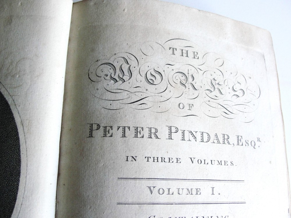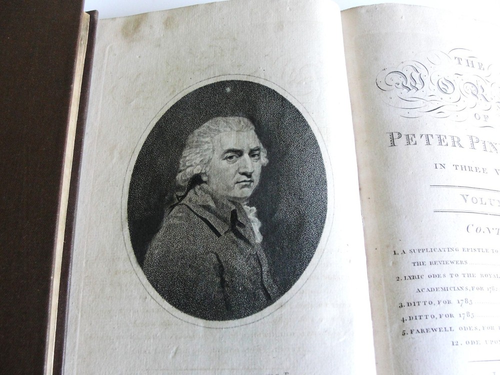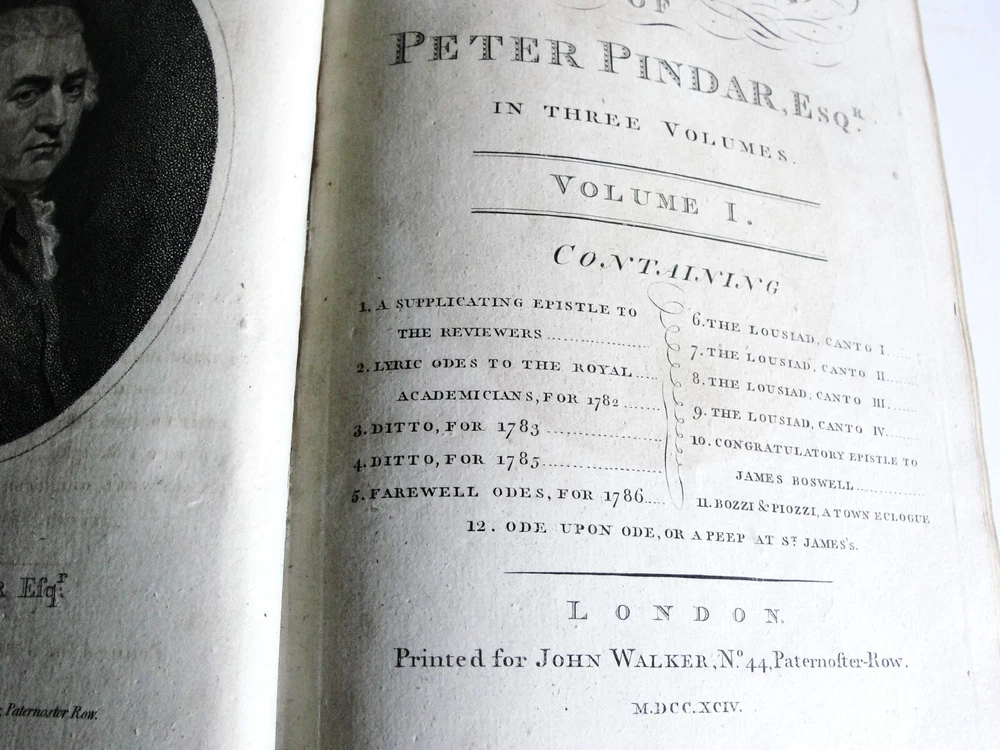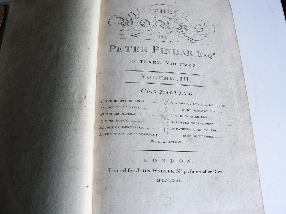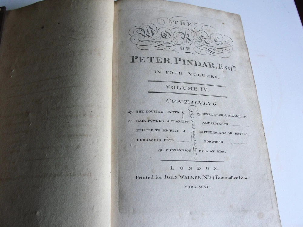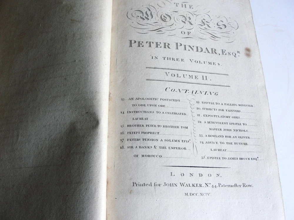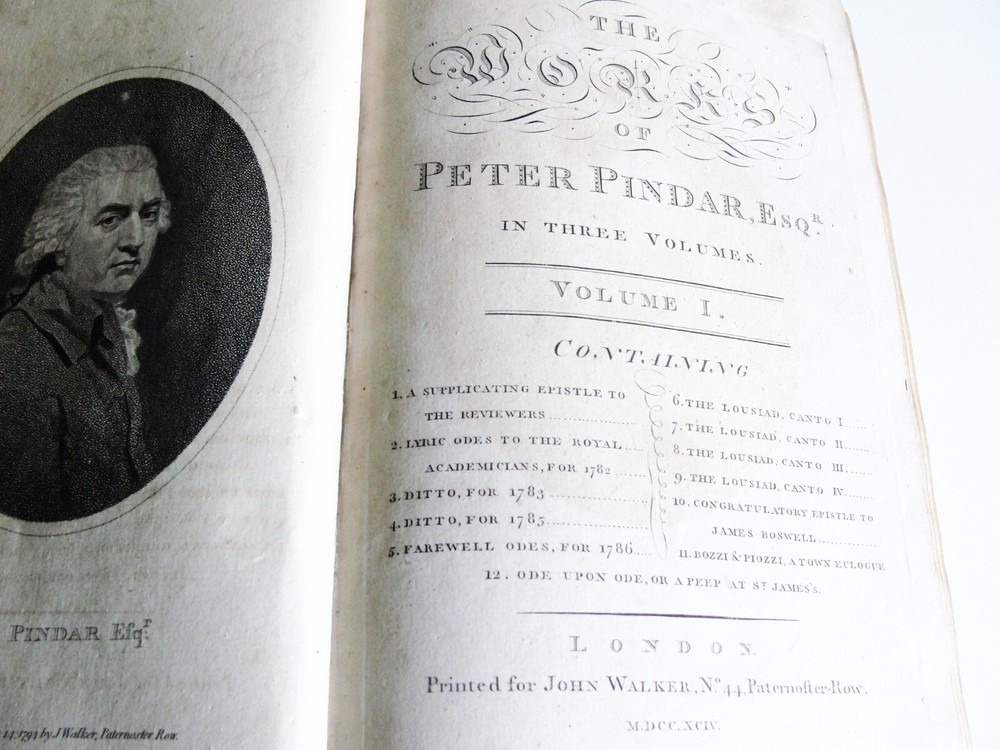 You are bidding on the: For your consideration is a Lovely, Vintage- THE WORKS OF PETER PINDAR, ESQ by WOLCOT, John , 1794[-1796]. Four octavo volumes set. 1794. [WOLCOT, John]. THE WORKS OF PETER PINDAR, ESQ. London: Printed for John Walker, 1794[-1796]. Four octavo volumes, of an eventual five published. Vol. 1 has an engraved portrait of Wolcot, identified only by his pseudonym Peter Pindar, and each volume has an engraved title-page. Peter Pindar was the pen-name of John Wolcot (1738-1819) a doctor from Truro who achieved some fame in the 1780s through his gift for comic verse, in particular, verse that poked fun at the foibles of the court and royal family. Wolcot's lasting legacy is his observation that George III said 'what what' a lot. John Wolcot (1738-1819) was a popular English poet and satirist of contemporary artists and writers, and of royalty in particular. (He is reported to have said that the king had been a good subject to him, and he a bad one to the king.) At the time of publication, this set marked the most complete collection of the poet's work. In 1793 Wolcot sold the copyright of his existing works to John Walker, the publisher, for an annuity; at that same time, it was stipulated that Walker should have the right of refusal for all of Wolcot's future work. The expanding nature of the edition is evident on the title pages of the volumes; Vols. 1-3 say "in three volumes," and Vol. 4 says "in four volumes." The fifth, and final, volume was eventually published by Walker in 1801. Size: 8.5' x 5.5' each book- 444+, 495+, 431+, 500+ Pages. Condition: Good with some vintage wear and staining on pages. Cosmetic condition is as clearly and accurately shown in the high-definition pictures provided. Please inspect all of them carefully. Overall, a rarity and very uncommon. A really great Vintage Book Set to add to any good collection.
