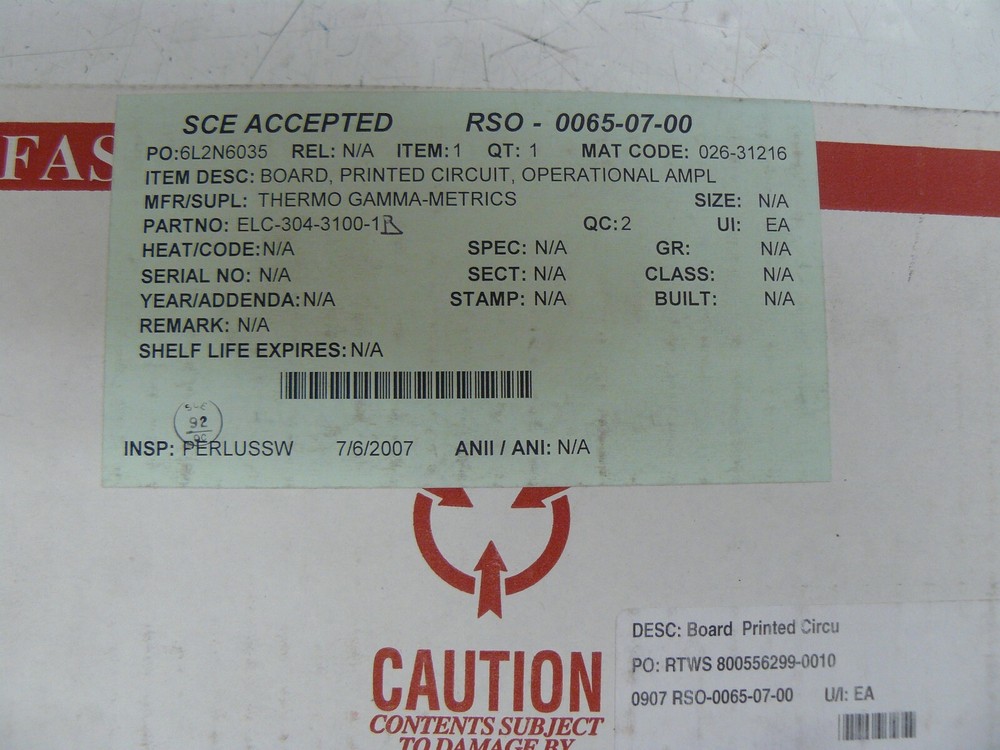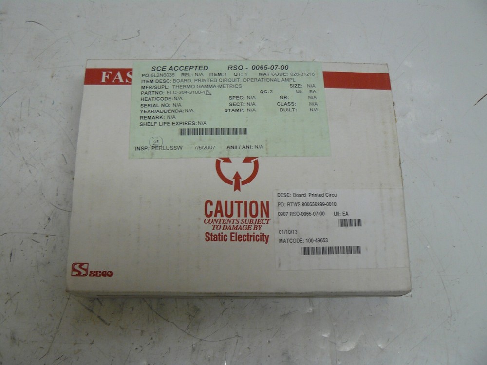 YOU ARE BUYING A NEW THERMO ELECTRON ELC304-3100-1B SUMMER AND OPERATIONAL AMPLIFIER REV. C. THIS IS NEW SHELF SURPLUS NOT IN ORIGINAL PACKAGING REMOVED FROM A WORKING SAN ONOFRE POWER GENERATING FACILITY AND IS GUARANTEED WORKING. IF YOU HAVE ANY QUESTIONS PLEASE HIT ASK THE SELLER A QUESTION. (MWHALL*11 BOTTOM SHELF X3) International Buyers Please Note: Import duties, taxes and charges are not included in the item price or shipping charges. These charges are the buyer's responsibility. Please check with your country's customs office to determine what these additional costs will be prior to bidding or buying. We do not mark merchandise values below value or mark items as "gifts" - US and International government regulations prohibit such behavior. Surplus Sam's Inc. is not an authorized distributor, reseller or representative of the products featured on this website. All product names, trademarks, brands and logos used on this site are the property of their respective owners. The depiction, description or sale of products featuring these names, trademarks, brands and logos is for identification purposes only and is not intended to indicate any affiliation with or authorization by any rights holder.