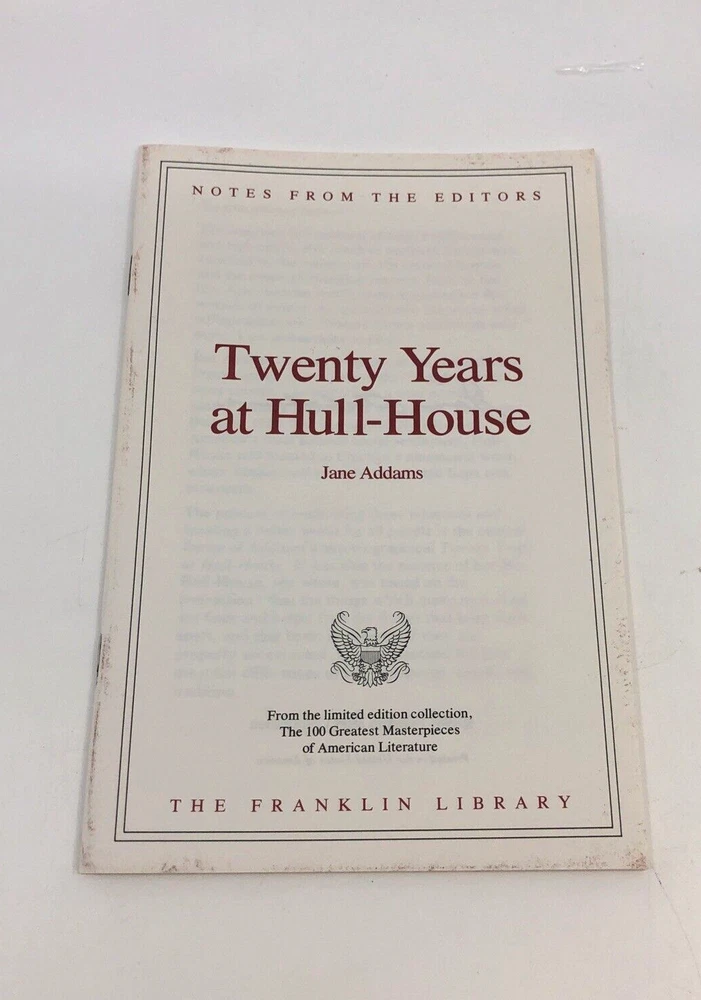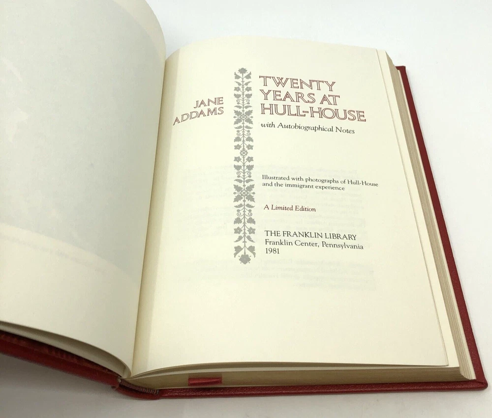 Please review photos for condition. Binding is tight as if unread. This limited edition book from 1981, titled "Twenty Years at Hull-House," is a must-have for any history enthusiast. Written by Jane Addams, the book discusses the experiences and events that occurred during her time at Hull-House. The book is bound in leather and contains beautiful illustrations throughout.
