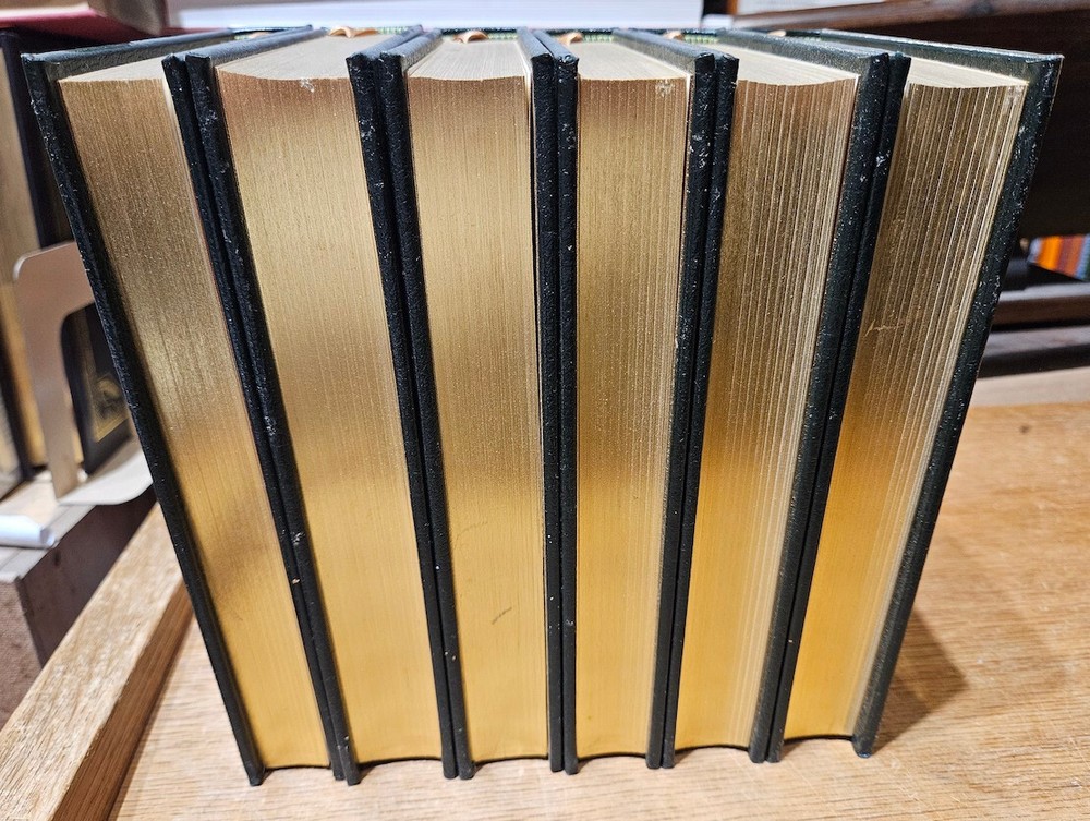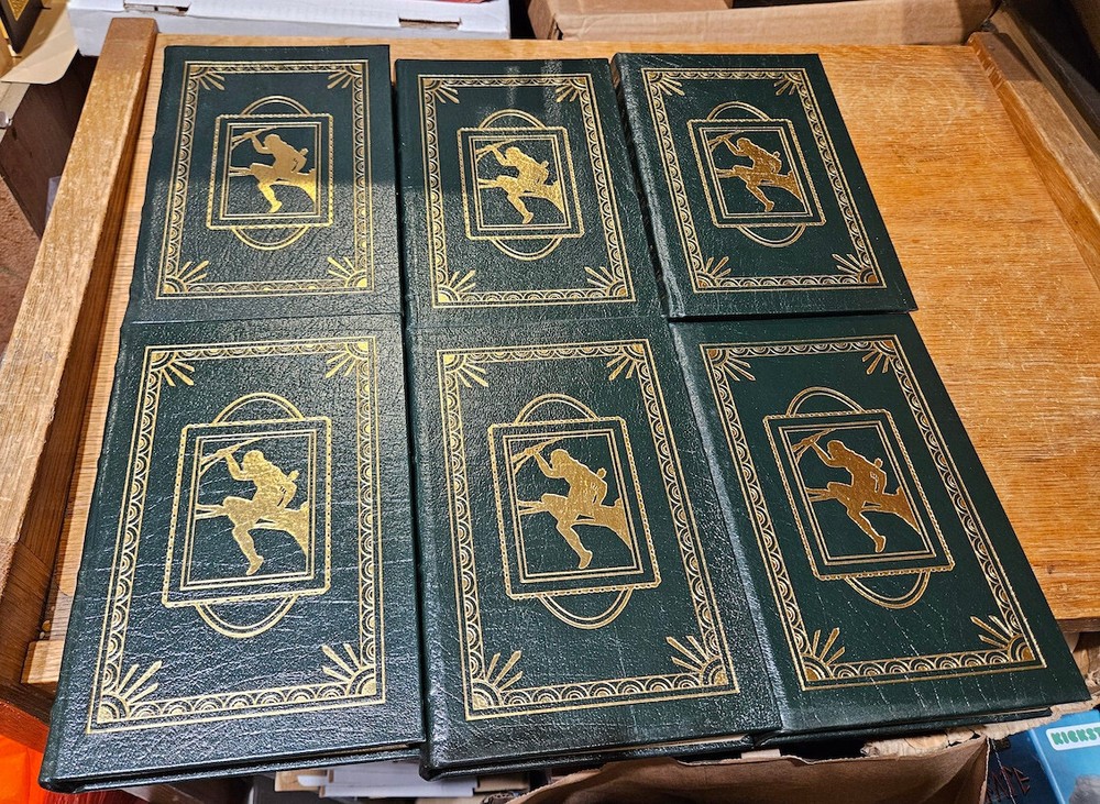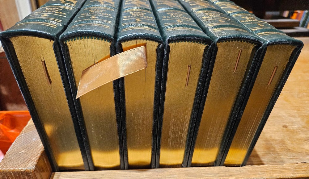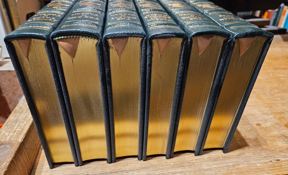 Tarzan set, 6 volumes : Tarzan of the Apes; the Return of Tarzan; The Beasts of Tarzan; The Son of Tarzan; Tarzan and the Jewels of Opar; Jungle Tales of Tarzan Near fine, except Son of Tarzan which is very good. Norwalk, CT.: Easton Press, 2004. Octavos (standard size). Slight wear to edges and corners of boards. The volumes have slight marks in the gilding at the top or the foredge of the textblocks. The SON OF TARZAN has a small bump in the leather on the back board. Green leather binding with gilt designs on spine and boards, along with a gilt silhouette of Tazan on spines and front boards. Gilt titling on spines. A lovely and uncommon set of the first 6 Tarzan books in a uniform binding. Near fine/Very good for Son of Tarzan. Green Leather 4 raised bands. --------------------------------- We package all items with protective packaging, insurance and tracking at our expense. If you have any questions, please contact us. We will respond quickly. Gene Alloway Motte & Bailey Booksellers Ann Arbor, Michigan "I heard his library burned down and both books were destroyed - and one of them hadn't even been colored in yet." - John Dawkins