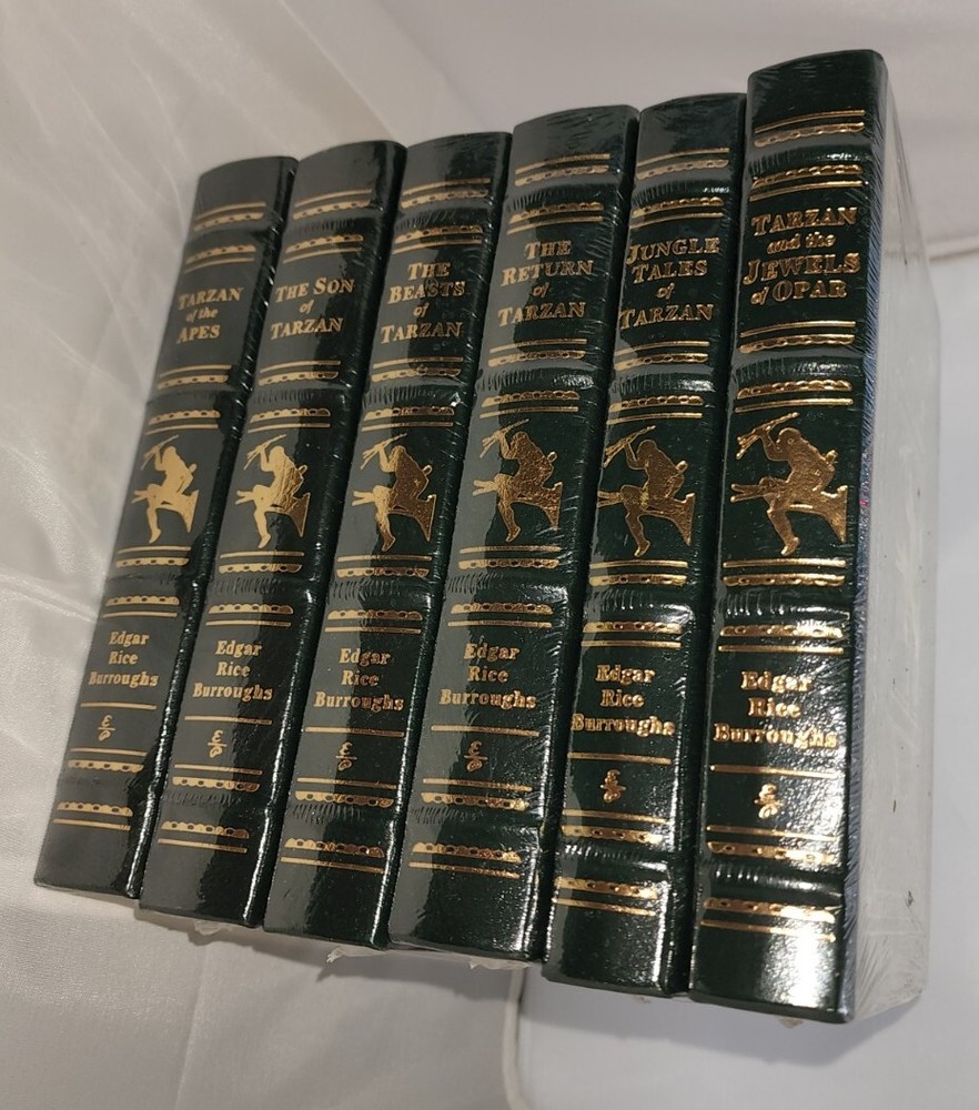 Up for your collection, the only full sealed set of Tarzan of the Apes Easton Press 6 volume collection. Beautiful books waiting for you to be the one to open them for the first time, or store away to retain their perfection. . Published in full green leather elaborately gilt stamped. All edges gilt. Silk marker ribbon. Includes Tarzan of the Apes Return of Tarzan Beast of Tarzan Son of Tarzan Tarzan and the Jewels of Opar Tarzan Jungle Tales