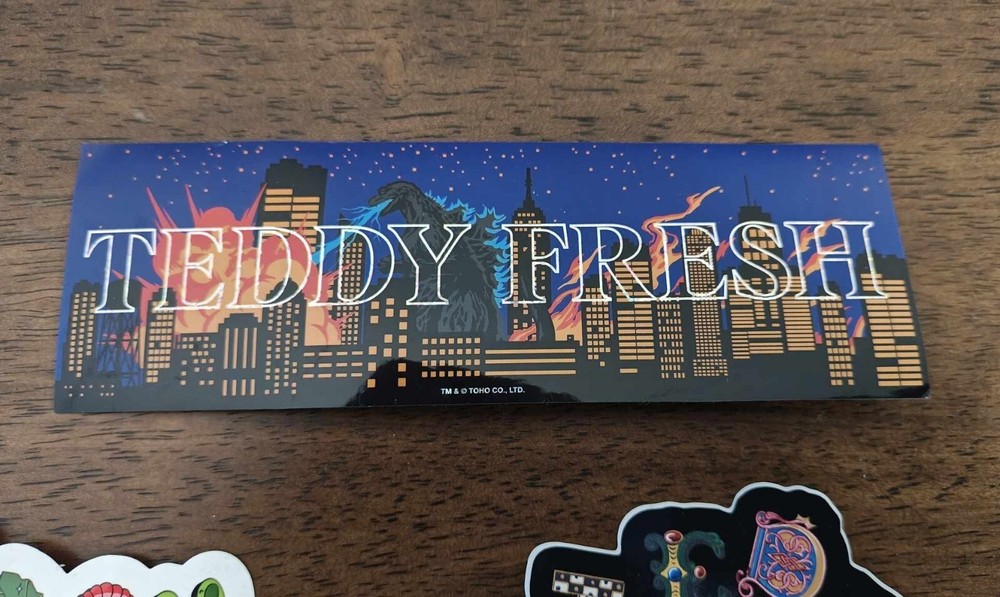 One rare Godzilla x Teddy Fresh sticker, one Elton John x Teddy Fresh sticker, one Rick & Morty x Teddy Fresh sticker, All new in great condition....