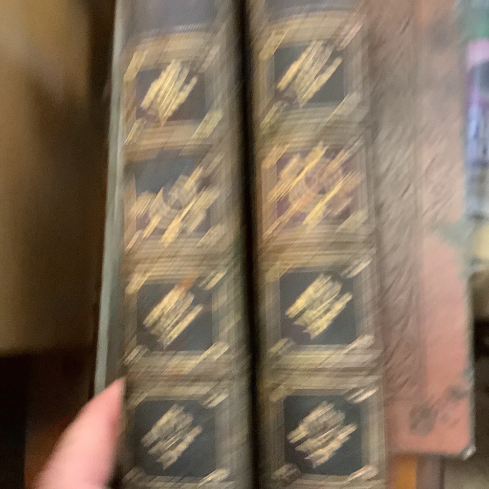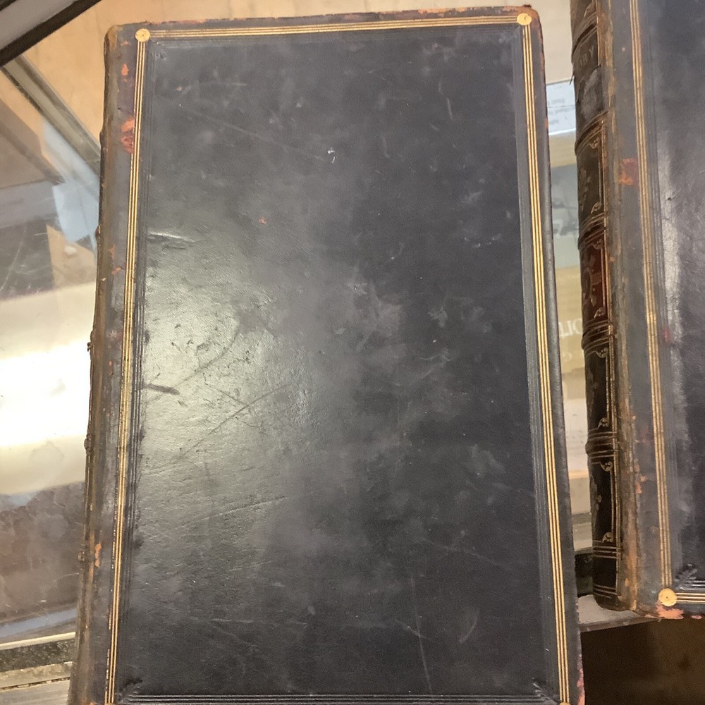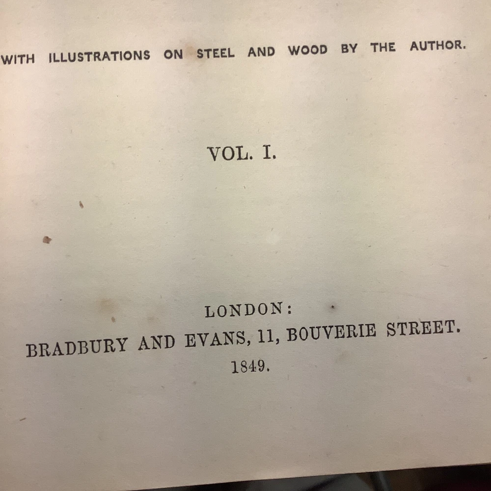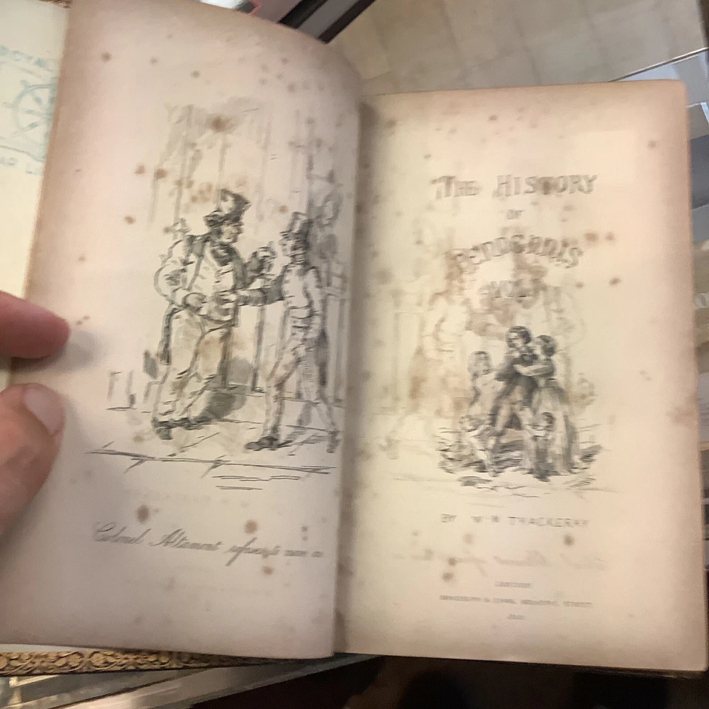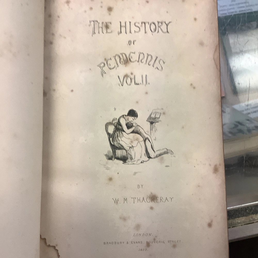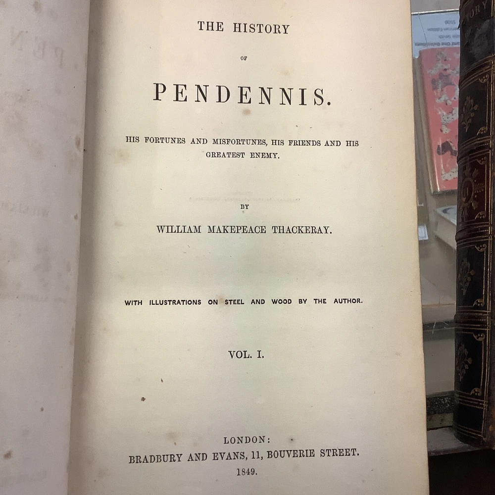 The History of Pendennis by William Makepeace Thackeray. Published by Bradbury & Evans in London 1849-50. 1849 on the title page of first volume, 1850 on title page of second volume. Full leather bindings. Two volume set. Heavily worn. Bindings missing pieces of leather on spines. Spotting and staining throughout. Illustrated.