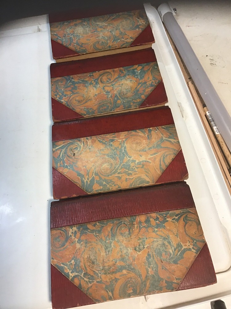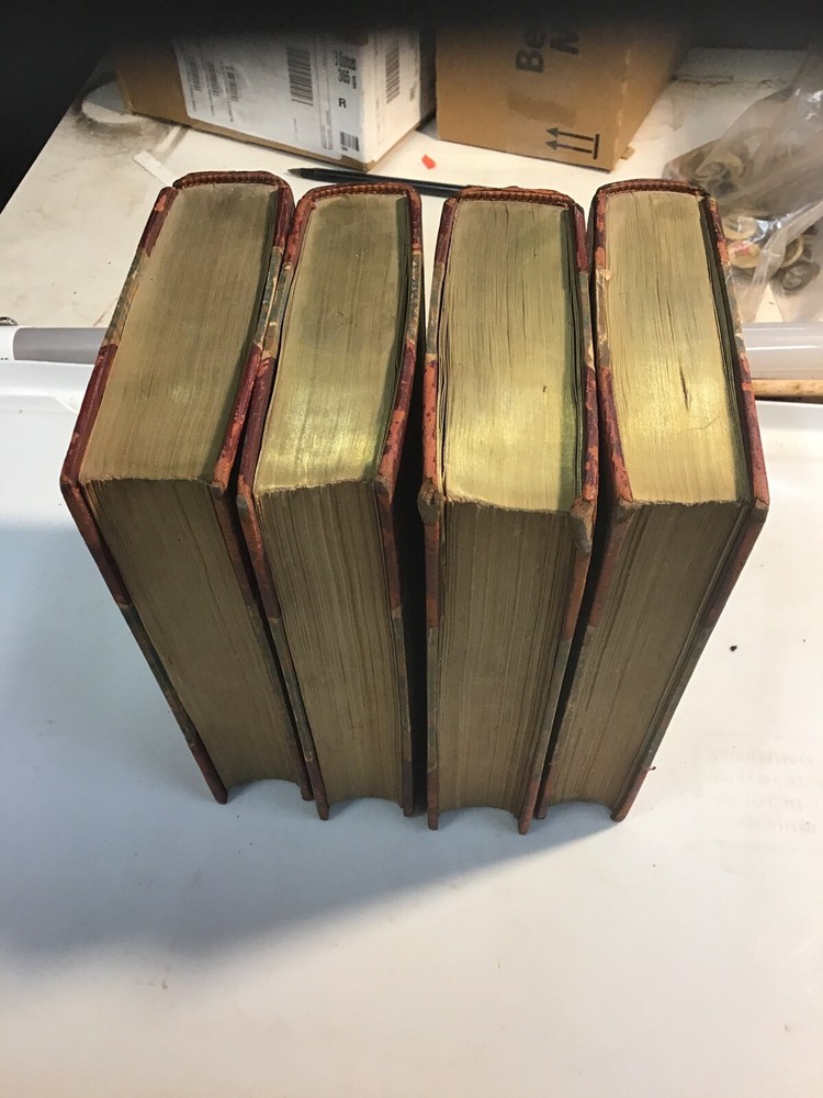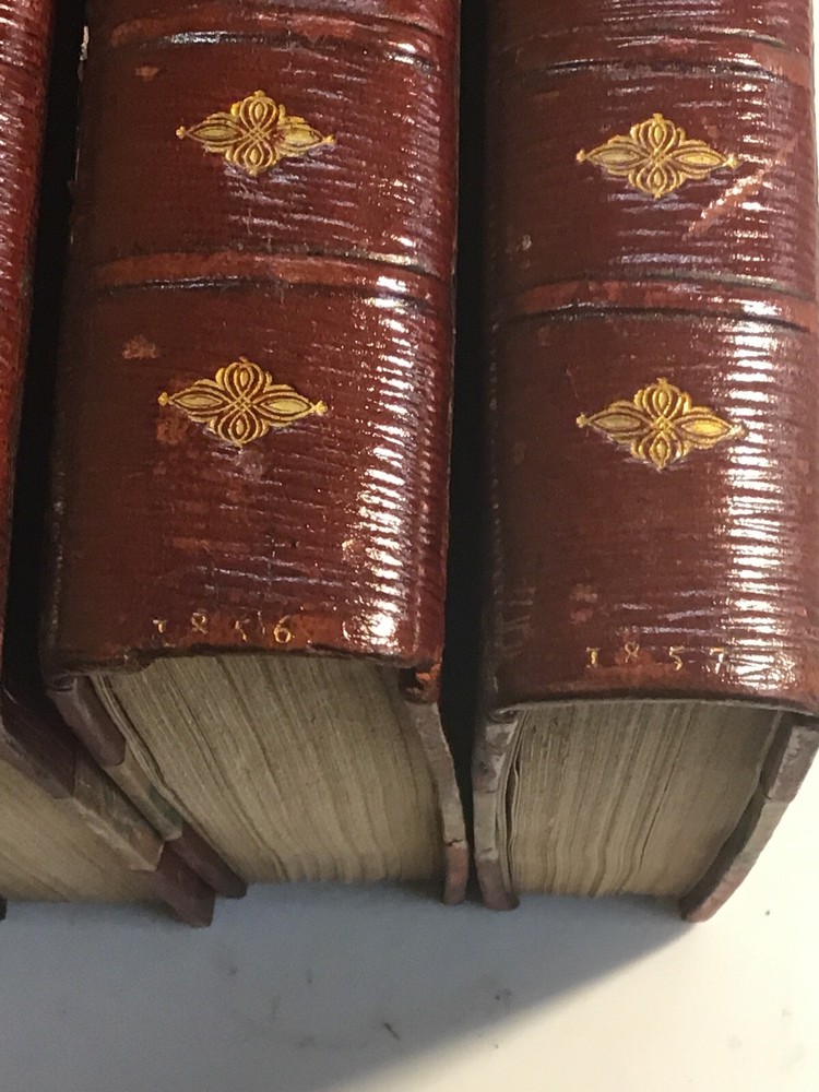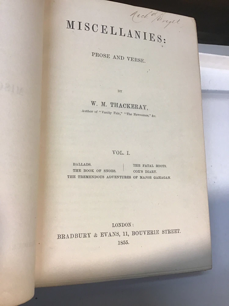 Thackeray, William Makepeace Miscellanies_ Prose and Verse 4 Volume Leather Complete Set 1855-57. A Victorian English novelist, William Makepeace Thackeray (1811-1863) was famous for his satirical works that portrayed English society. Thackeray only began writing when he lost his fortune in a banking crash, describing his journalism as writing for his life. However he was a popular writer and became known for his pieces in various magazines and is known to have popularised the word 'snob'. Here we have a collection of some of his best works that parody and attack high society, military prowess, and marriage and hypocrisy. Size. 7.5” x 5.5” Keep in mind the shipping price also covers handling fees, packaging materials & time, not just postage. See our eBay store for thousands of our other items. B12