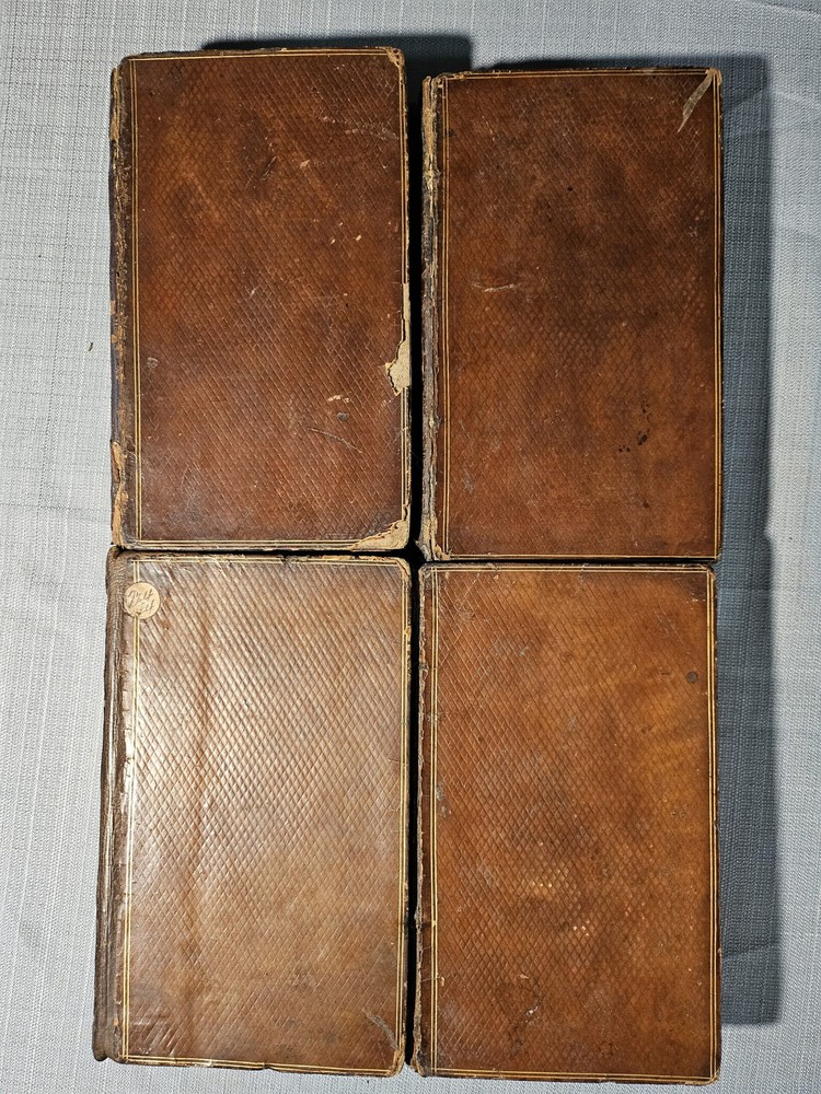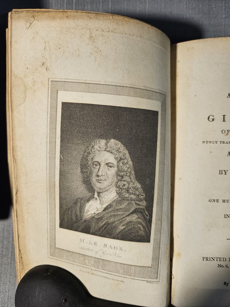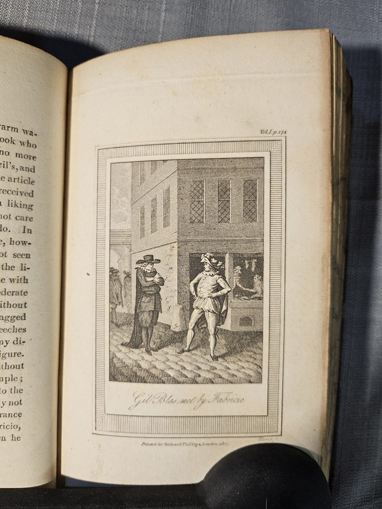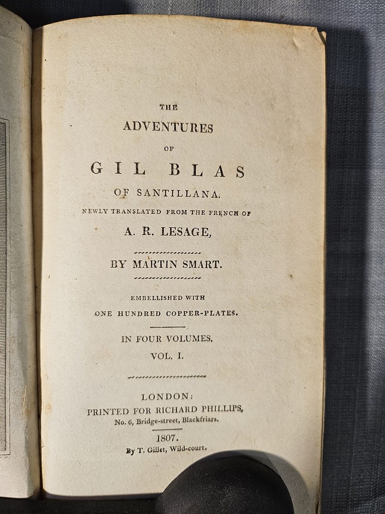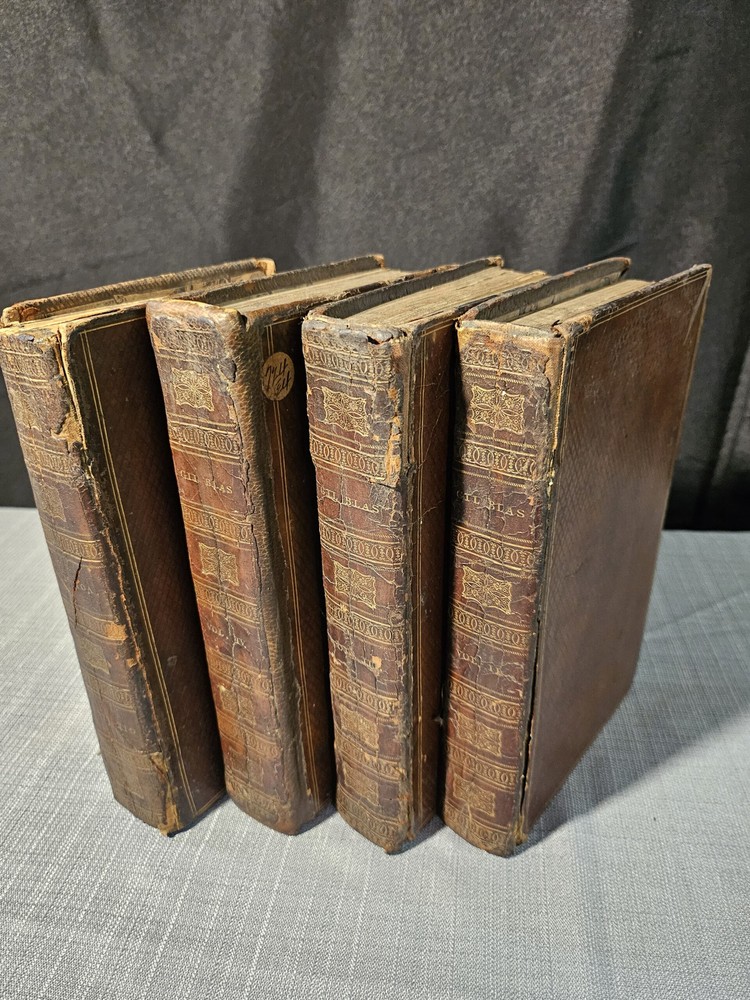 HGG Books presents ... The Adventures of Gil Glas of Santillana 4 volume complete set Author: Lesage, Alain-Rene; Smart, Martin [translator] Publisher: Richard Phillips; T Gillet Release Date: 1807 Seller Category: Literature Qty Available: 1 Condition: Collectible: Good Sku: gilblassmart Notes: The Adventures of Gil Glas of Santillana 4 volume complete set, early English translation. Embellished with full page copper plates, 52 of 100 present.Clean pages, copper plates crisp, text block tightly bound, hinges weak with volume I separating and volume IV with a repair, leather boards with bumping to corners, fade and crackling to leather spines Don't forget to check out other great deals in our eBay Store!!