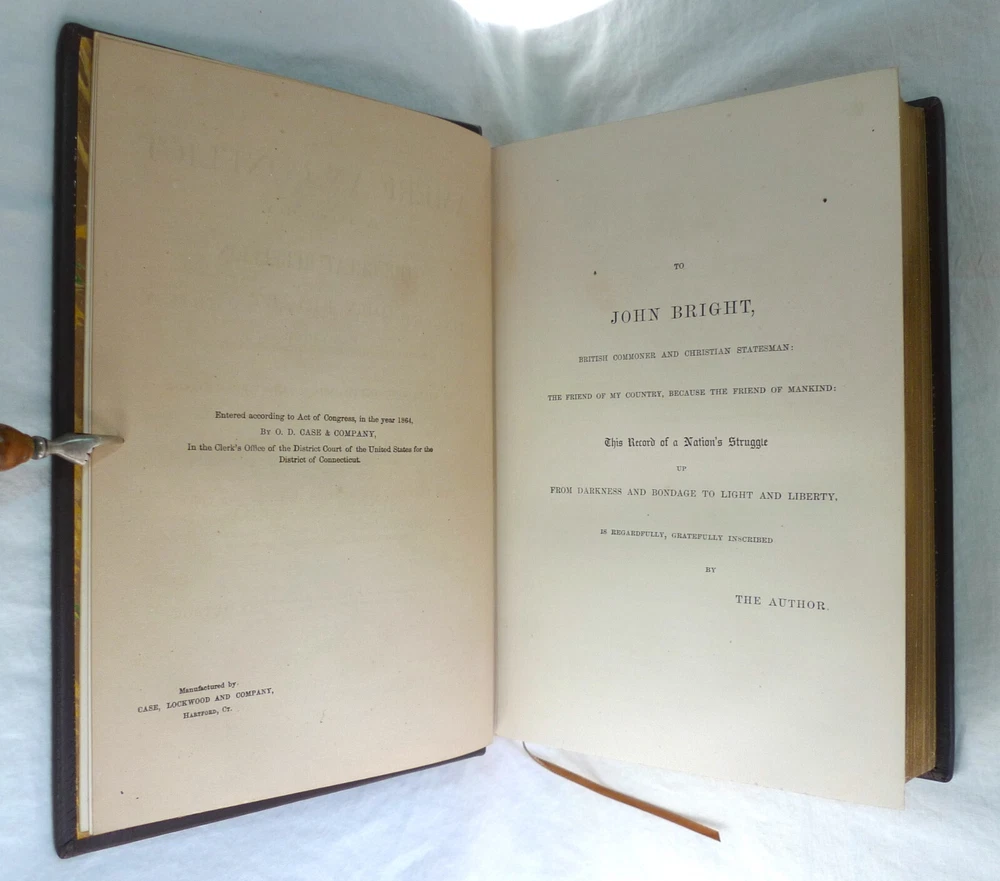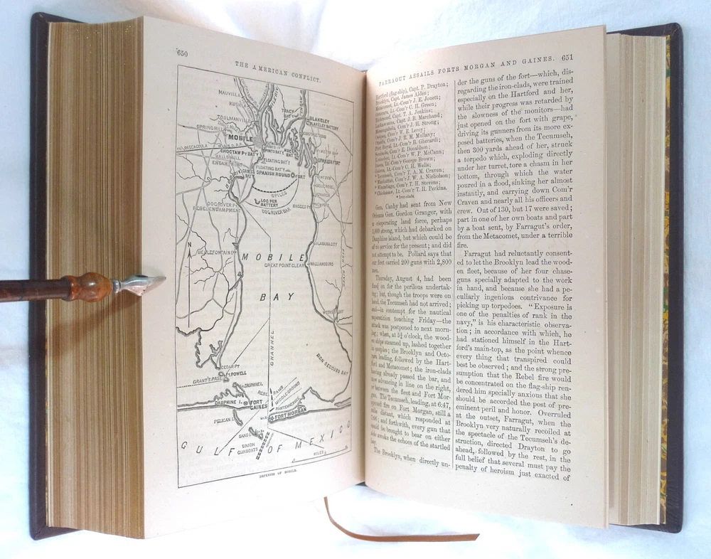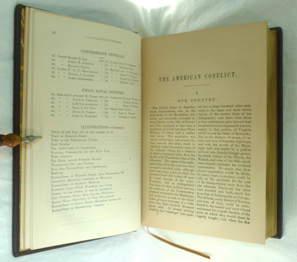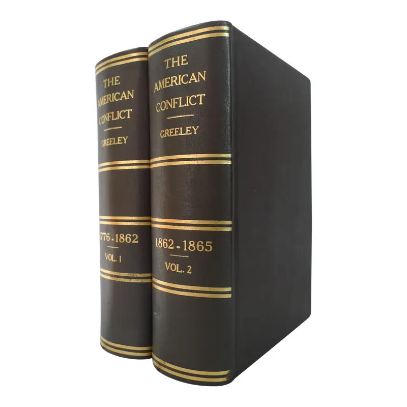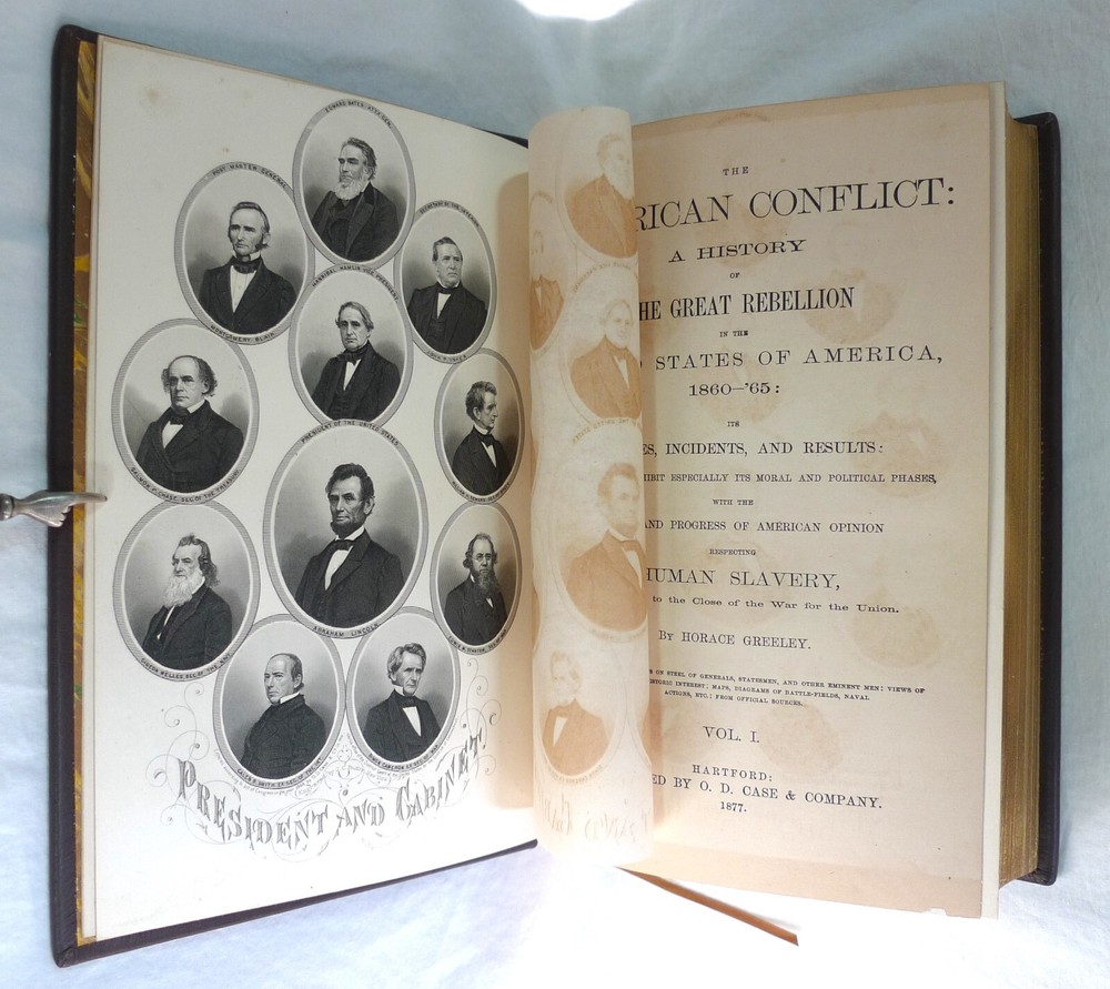 Title: The American Conflict: A History of the Great Rebellion in the United States of America, 1860-65: The Causes, Incidents, and Results: Intended to Exhibit Especially its Moral and Political Phases, with the Drift and Progress of American Opinion Respecting Human Slavery, From 1776 to the Close of the War for the Union. Author: Horace Greeley. Publisher: O.D. Case & Company. Origin: Hartford, Connecticut, USA. Publication date: 1876-1877. Description: 1430 Pp. [V1 (1776-1862); 648 p., V2 (1862-1865); 782 p.]. sm. 4to. Custom contemporary full brown leather hardcover, gilt title on spine covers, new red/yellow headband/tailband, full gilt leaf edges, silk ribbon markers, new marble/blank endpapers. Text illustrated by portraits on steel of generals, statesmen, and other eminent men, guarded by rice paper: views of places of historic interest: Maps, diagrams of battle-fields, naval actions, etc: From official sources. Measures: (2.5 (4.75 overall) W x 6.75 D x 9.25 H inches. About the author: Horace Greeley, (1811-1872), American newspaper editor who is known especially for his vigorous articulation of the North's antislavery sentiments during the 1850s. About the work: American Conflict is an important contemporary history of the Civil War steeped in the emphatic ideals of slavery and freedom. In the first of these two handsomely illustrated volumes, Greeley records his version of the entire history of the nation from 1776 to the second year of the Civil War. The second analyzes the final three years of the war and includes substantial material on emancipation and the crushing of the rebellion. Greeley traced the seeds of the war and included a large cache of primary sources to make his case; e.g. public documents and speeches. Failed compromise is the predominating theme. The work is particularly notable for the presentation of predictions about the years to come, in particular regarding the slavery question. The importance of Greeley's account of the Civil War is still considered important. In addition to offering extensive accounts of battlefield events, Greeley highlighted the troubled story of African Americans.