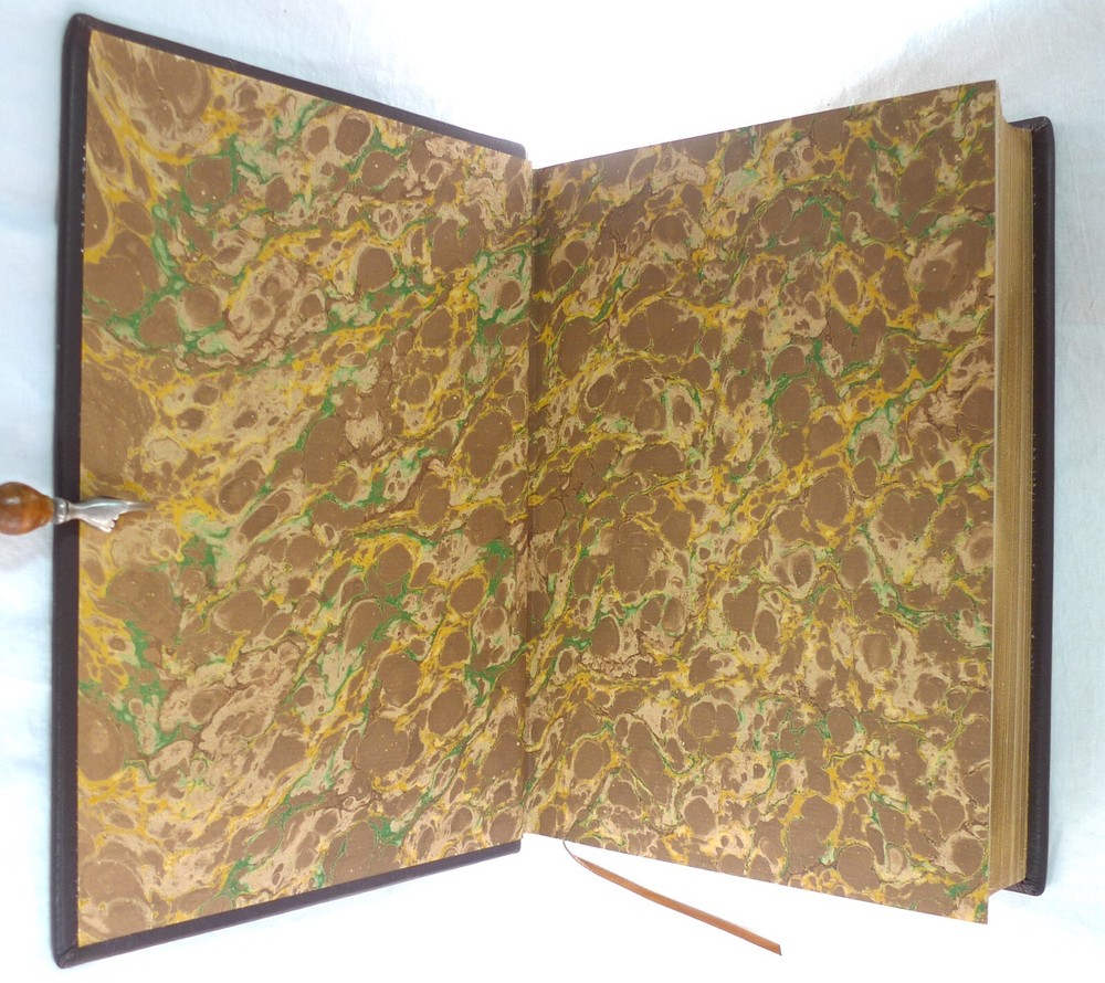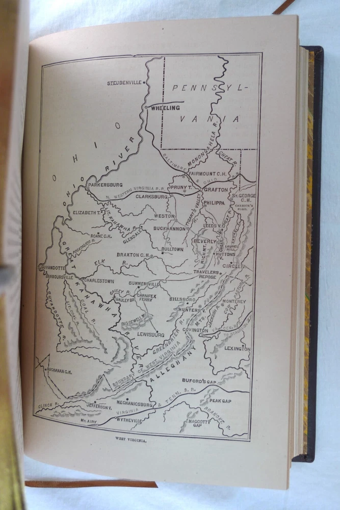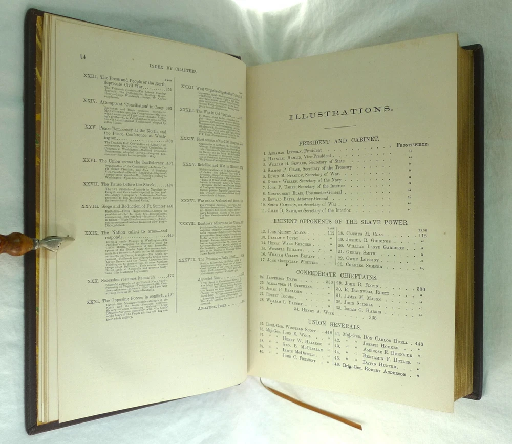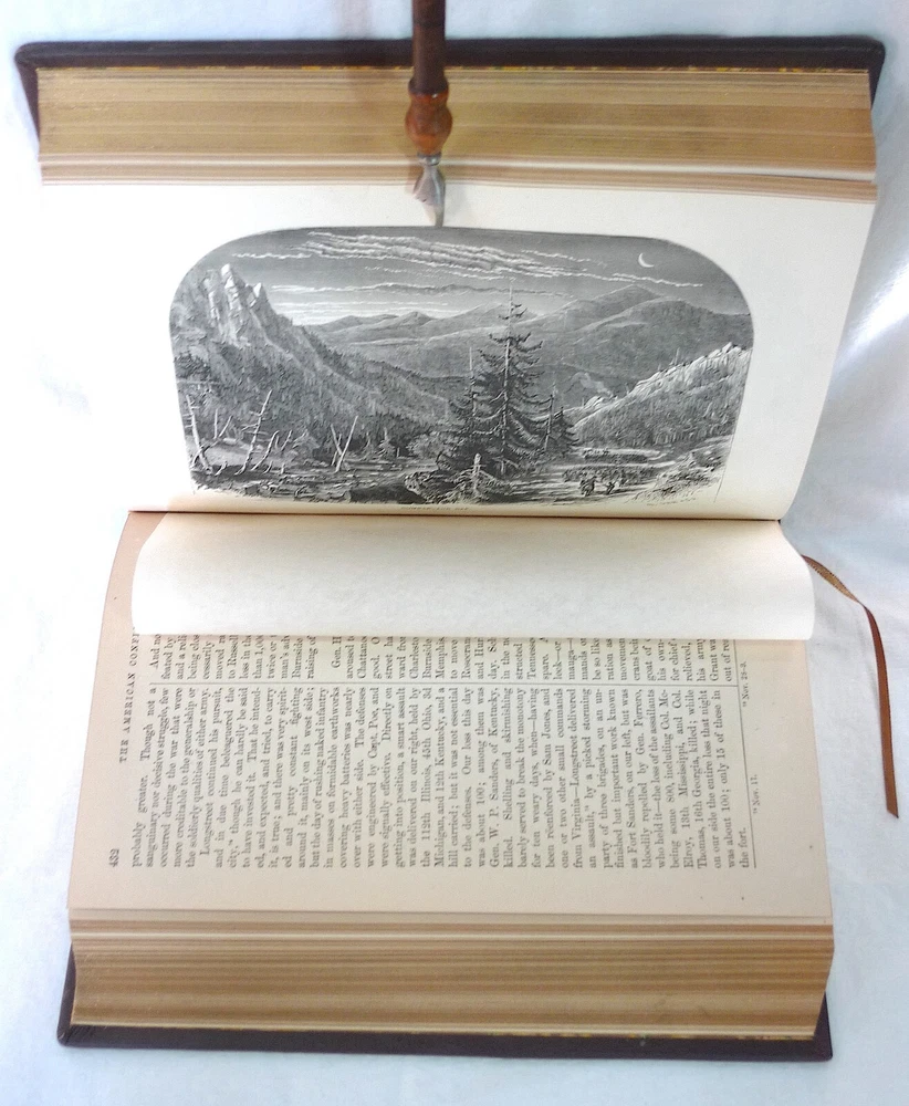 Title: The American Conflict: A History of the Great Rebellion in the United States of America, 1860-65: The Causes, Incidents, and Results: Intended to Exhibit Especially its Moral and Political Phases, with the Drift and Progress of American Opinion Respecting Human Slavery, From 1776 to the Close of the War for the Union. Author: Horace Greeley. Publisher: O.D. Case & Company. Origin: Hartford, Connecticut, USA. Publication date: 1876-1877. Description: 1430 Pp. [V1 (1776-1862); 648 p., V2 (1862-1865); 782 p.]. sm. 4to. Custom contemporary full brown leather hardcover, gilt title on spine covers, new red/yellow headband/tailband, full gilt leaf edges, silk ribbon markers, new marble/blank endpapers. Text illustrated by portraits on steel of generals, statesmen, and other eminent men, guarded by rice paper: views of places of historic interest: Maps, diagrams of battle-fields, naval actions, etc: From official sources. Measures: (2.5 (4.75 overall) W x 6.75 D x 9.25 H inches. About the author: Horace Greeley, (1811-1872), American newspaper editor who is known especially for his vigorous articulation of the North's antislavery sentiments during the 1850s. About the work: American Conflict is an important contemporary history of the Civil War steeped in the emphatic ideals of slavery and freedom. In the first of these two handsomely illustrated volumes, Greeley records his version of the entire history of the nation from 1776 to the second year of the Civil War. The second analyzes the final three years of the war and includes substantial material on emancipation and the crushing of the rebellion. Greeley traced the seeds of the war and included a large cache of primary sources to make his case; e.g. public documents and speeches. Failed compromise is the predominating theme. The work is particularly notable for the presentation of predictions about the years to come, in particular regarding the slavery question. The importance of Greeley's account of the Civil War is still considered important. In addition to offering extensive accounts of battlefield events, Greeley highlighted the troubled story of African Americans.