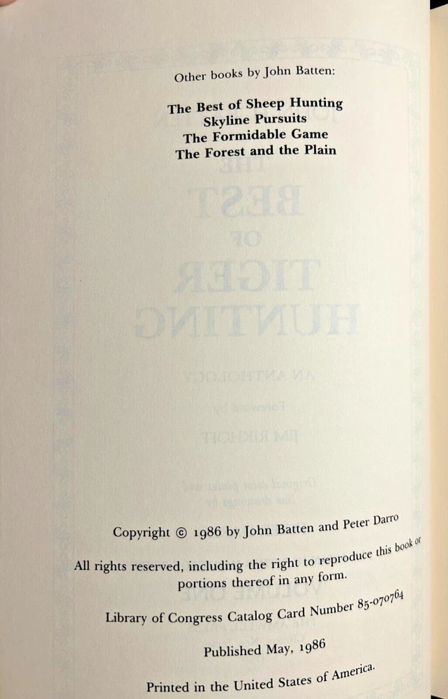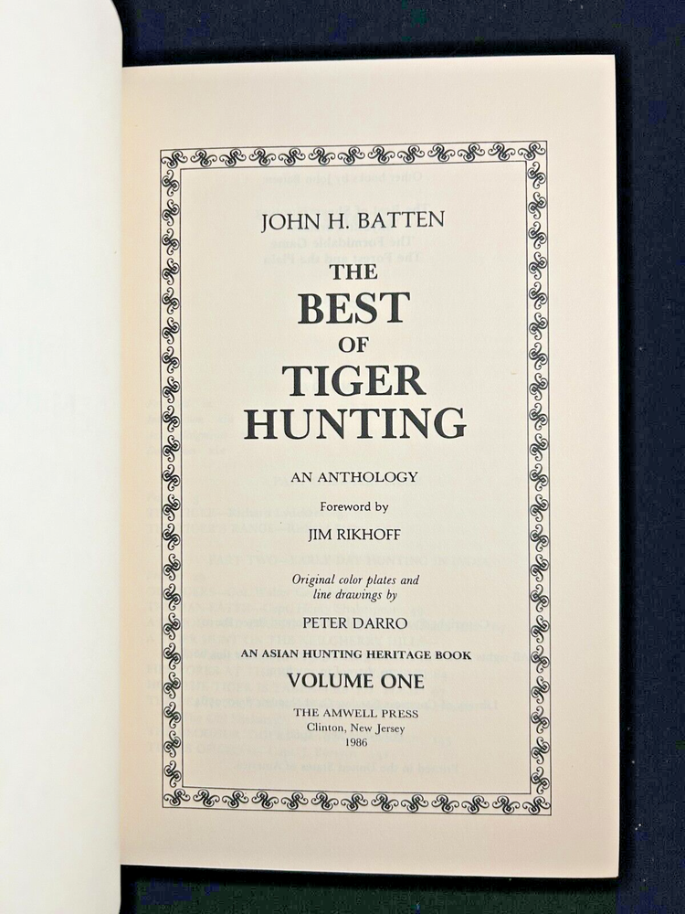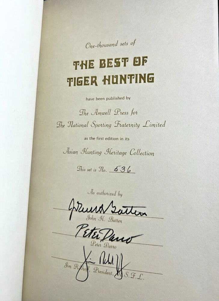 Title : The Best of Tiger Hunting (Volumes One & Two) Author : John H. Batten Illustrator : Peter Darro Publisher : The Amwell Press, Clinton, New Jersey Publication Year : 1986 Edition : First Edition Series : Asian Hunting Heritage Collection Binding : Full Leather, Gilt Edges, Decorative Tooling Limitation : Numbered Edition – Set No. 536 of 1,000 Signatures : John H. Batten (Author), Peter Darro (Illustrator), Jim Rikhoff (President, NSFL) 🔹 2-Volume Set | Fine Leather Binding | Limited to 1,000 Copies | SIGNED by Author, Artist & Publisher Step into the golden age of big game adventures with The Best of Tiger Hunting , a deluxe limited edition two-volume set by famed sportsman and author John H. Batten , magnificently illustrated by Peter Darro and published by The Amwell Press for the National Sporting Fraternity Limited (NSFL). This collector’s edition , No. 536 of only 1,000 copies , is signed by Batten, Darro, and NSFL president Jim Rikhoff —a hallmark of quality in fine sporting literature. Rare & Out of Print – Limited to 1,000 sets worldwide Signed by All Contributors – A must-have for fans of Batten and African/Asian hunting classics Beautiful Gift Edition – Ideal for display in a fine library or trophy room
