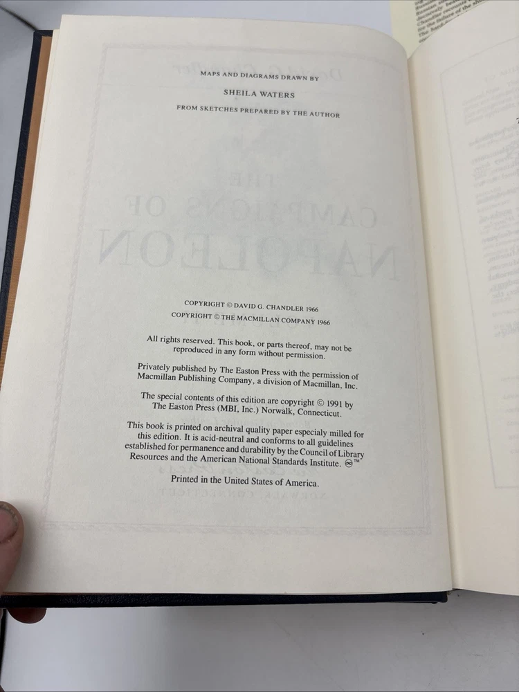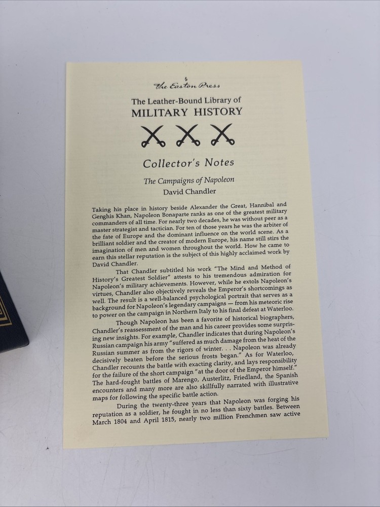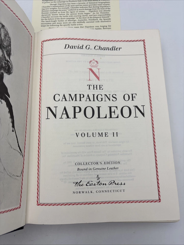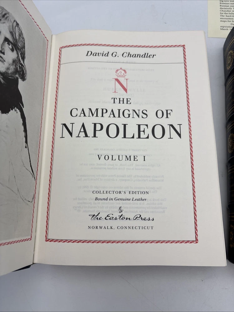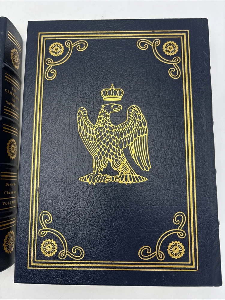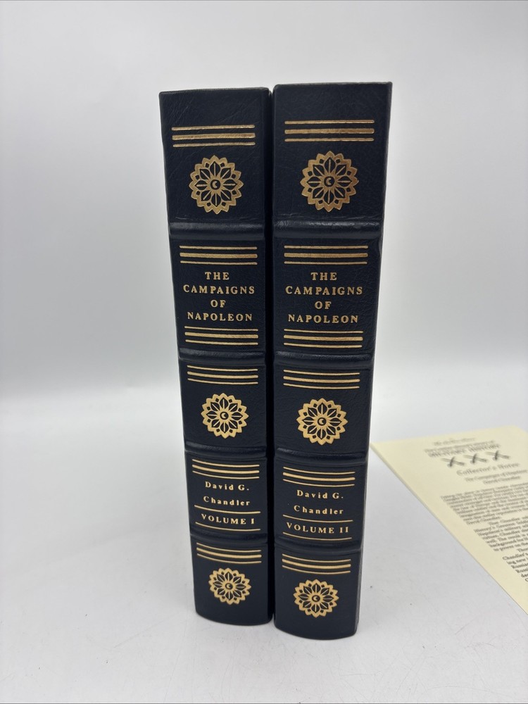 The Campaigns of Napoleon Volume 1 & 2 Set by Chandler - Easton Press - Military This set is in excellent condition as seen in photos. There are a couple of very small spots where the gold inlay has rubbed off as seen in the photos. There is no marking in the book. Check out my other Easton Press listings.