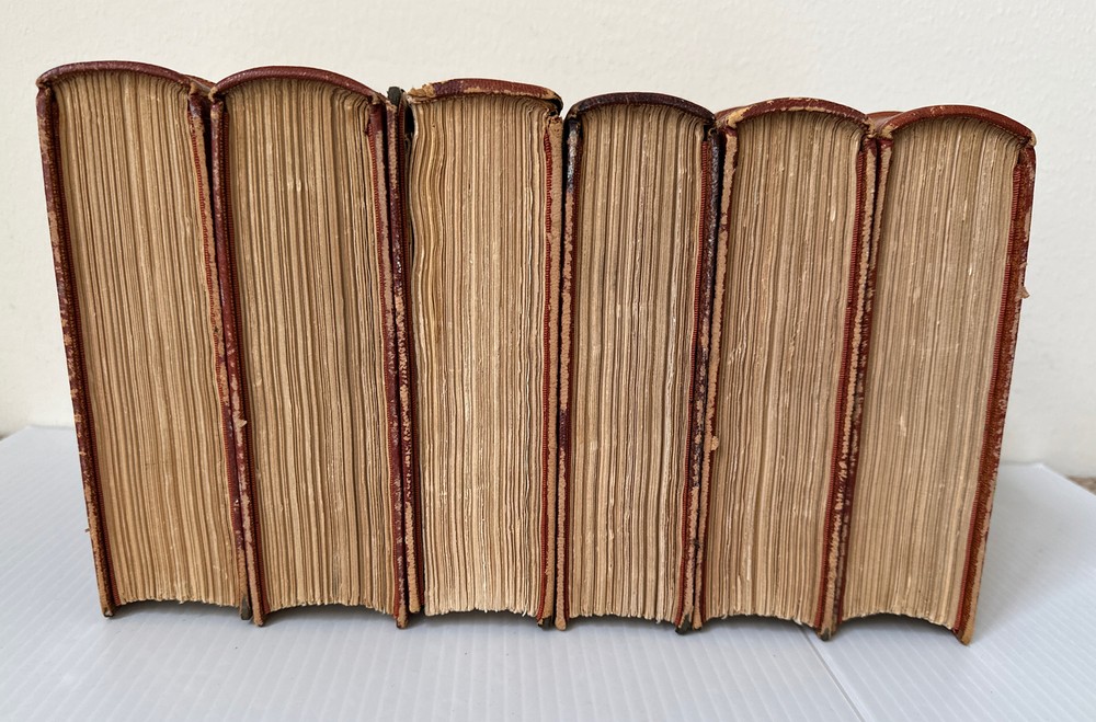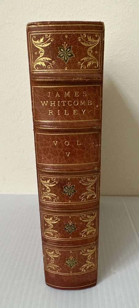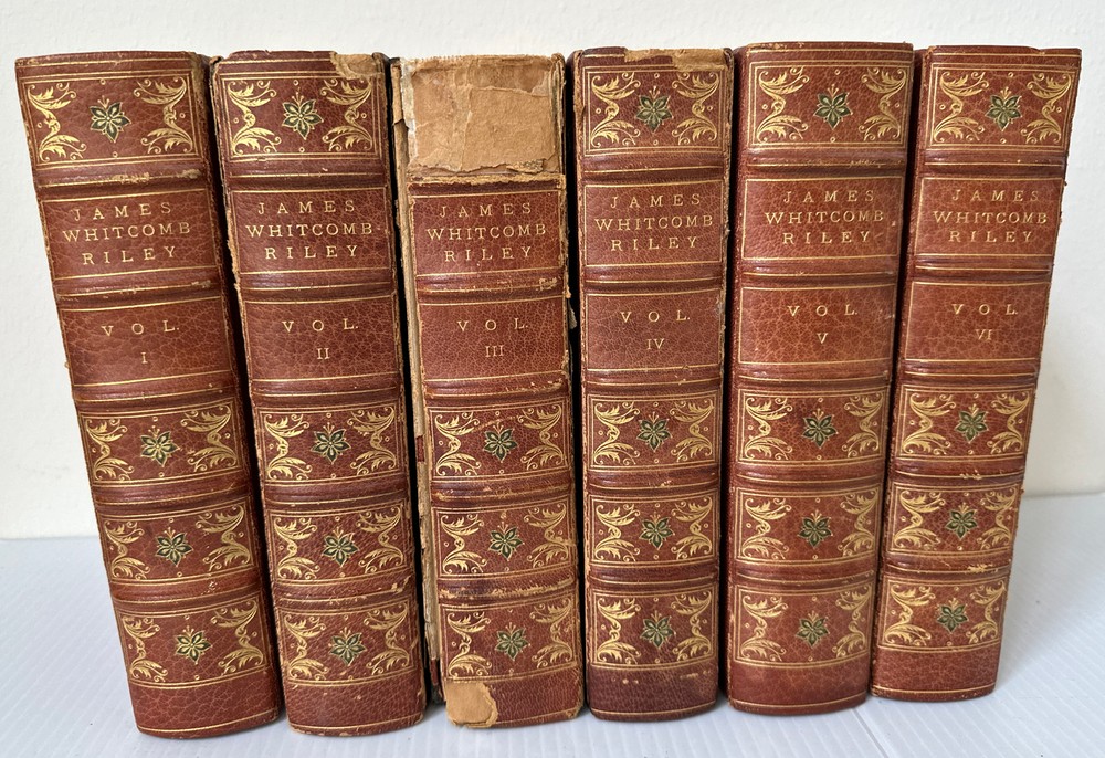 The Complete Works James Whitcomb Riley Elizabeth Marine Edition Signed 48/150 Signed by James Whitcomb Riley in Volume I Each volume signed by Publisher C.B. Randall on Limited Edition Page Limited, Numbered Edition XLVIII (48) of only 150 Published in 1913 Six volumes bound in full marbled calf leather Beautifully illustrated with plates and original watercolors and ornaments Spines are decoratively tooled and metered in gold gift with raised (rubbed) spines Beautiful Maroon moire endpapers (front and back) framed in leather with gold gilt decoration Top page edges gilt Each volume has a frontispiece with tissue guard Each volume measures 8.5" x 7" Illustrated with photographic and sepia plates throughout Volume III -back cover is off and spine is damaged Other volumes have tears on cover - see photos and video Please view all photos carefully. Requests for more photos are welcome. Originally owned by Josephine M. Yaryan given to her by her husband, Homer T. Yaryan. Her initials are on the cover of each volume. Mrs. Yaryan was socially prominent when she lived in Toledo, Ohio. Her husband developed the Yaryan heating system.