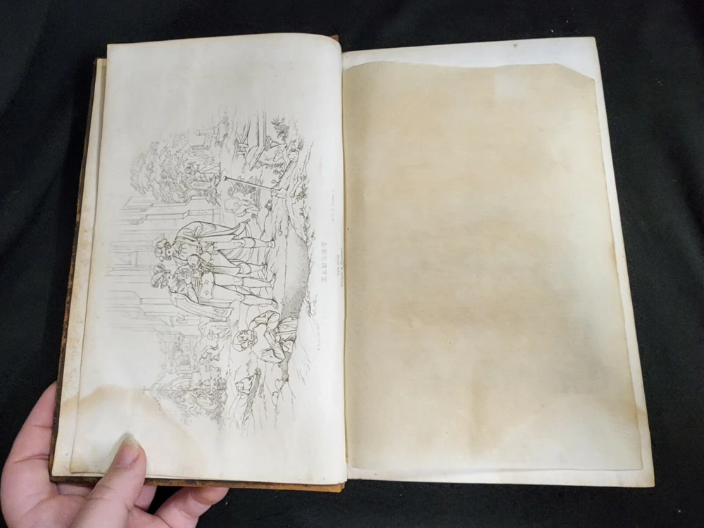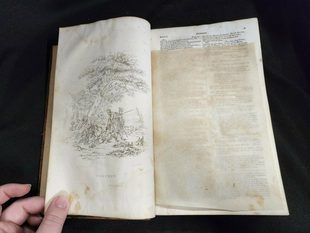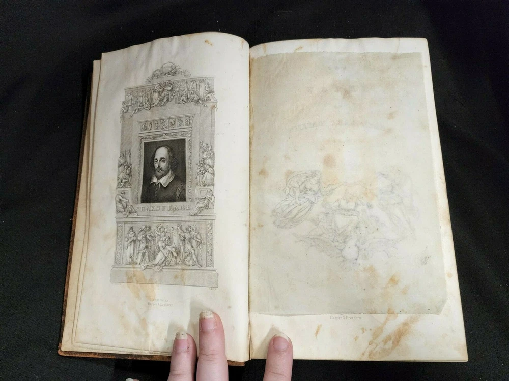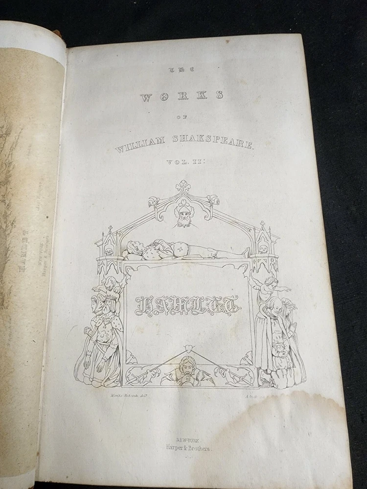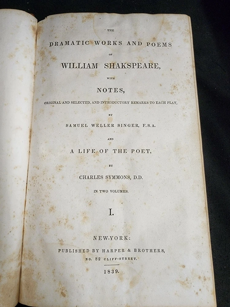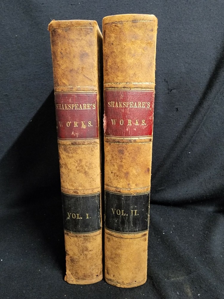 Welcome to Dark Star Books, home of Spooky The Dramatic Works and Poems of WILLIAM SHAKESPEARE with Notes original and selected, and introductory remarks to each play by Samuel Weller Singer and A LIFE OF THE POET by Charles Symmons in two volumes New York: Harper & Brothers 1839 522; 596 pages Two volumes, hardcovers, each 9.25 by 5.75 inches, bound in leather with black and red bands, gilt lettering and trim. Frontispiece and other illustrations, each with tissue guard. Marbled edges. This set is hard to find! Condition: Good overall condition. Solid bindings with rubbing and scuffing. Vol. I with some splitting at spine ends, back. Overall foxing, some damp-staining. Vol. II is missing part of rear endpaper. No loss of text. See photos. Shipping: We ship our orders through the US Postal Service (USPS). We are happy to combine shipping on multiple orders; If you want to buy more than one item, PLEASE put them in your cart and have us send you an invoice so we can combine the shipping. International orders. We are in the Global Shipping program but can sometimes opt out for a particular item if you contact us BEFORE BUYING the item. Global shipping is usually the least expensive option. Thank you! We welcome you to check out our eBay store as well as our lovely brick-and-mortar building in Yellow Springs, Ohio! We carry over 40,000 used books, back-issue comics, games, puzzles, and literary and geeky gifts. And no visit to Dark Star is complete without petting our store cat, Spooky! Dark Star Books & Comics 237 Xenia Ave. Yellow Springs, OH 45387 E9439 listed by Yvonne