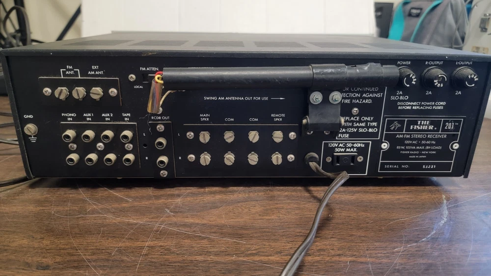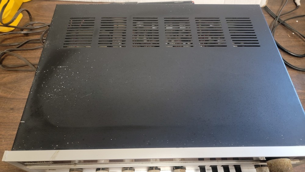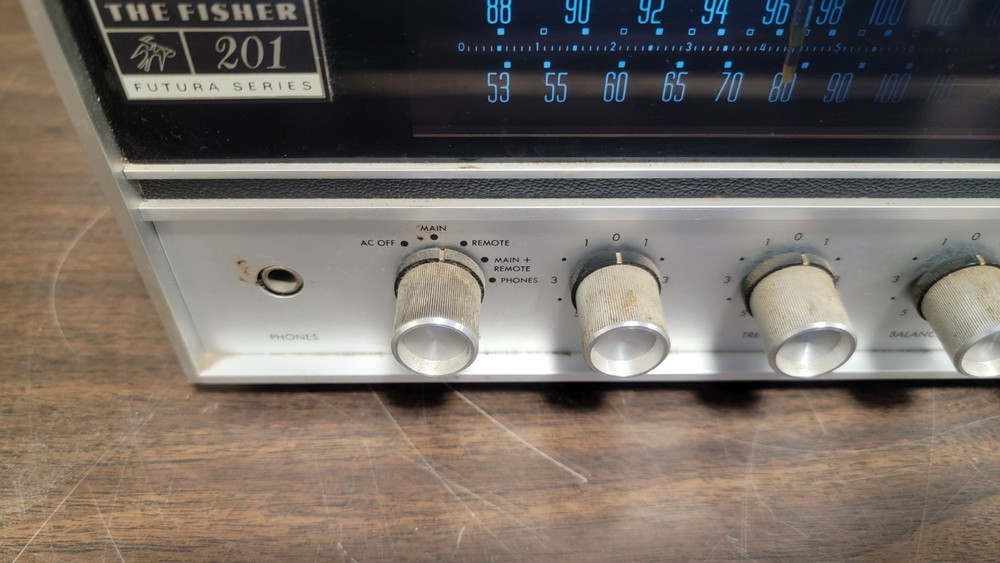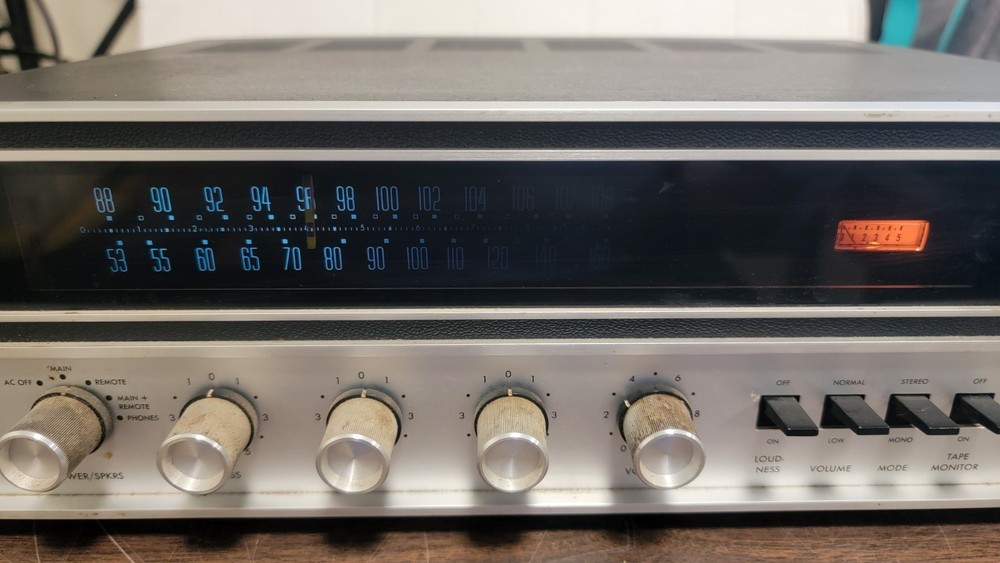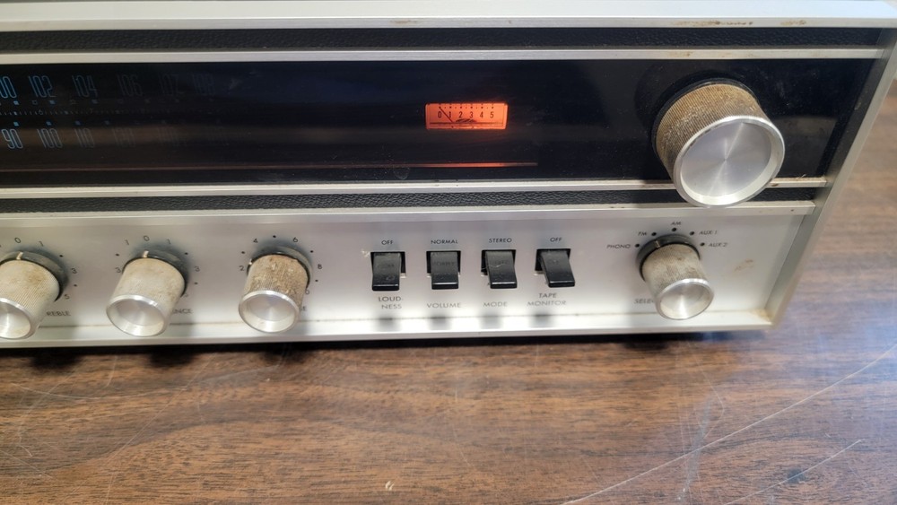 All the speakers work except the right side of the main speaker. No sound comes out the right side at all. Part of the light is out on the front, and the knobs could use a good cleaning. Please see the pictures for the condition. Selling as is.