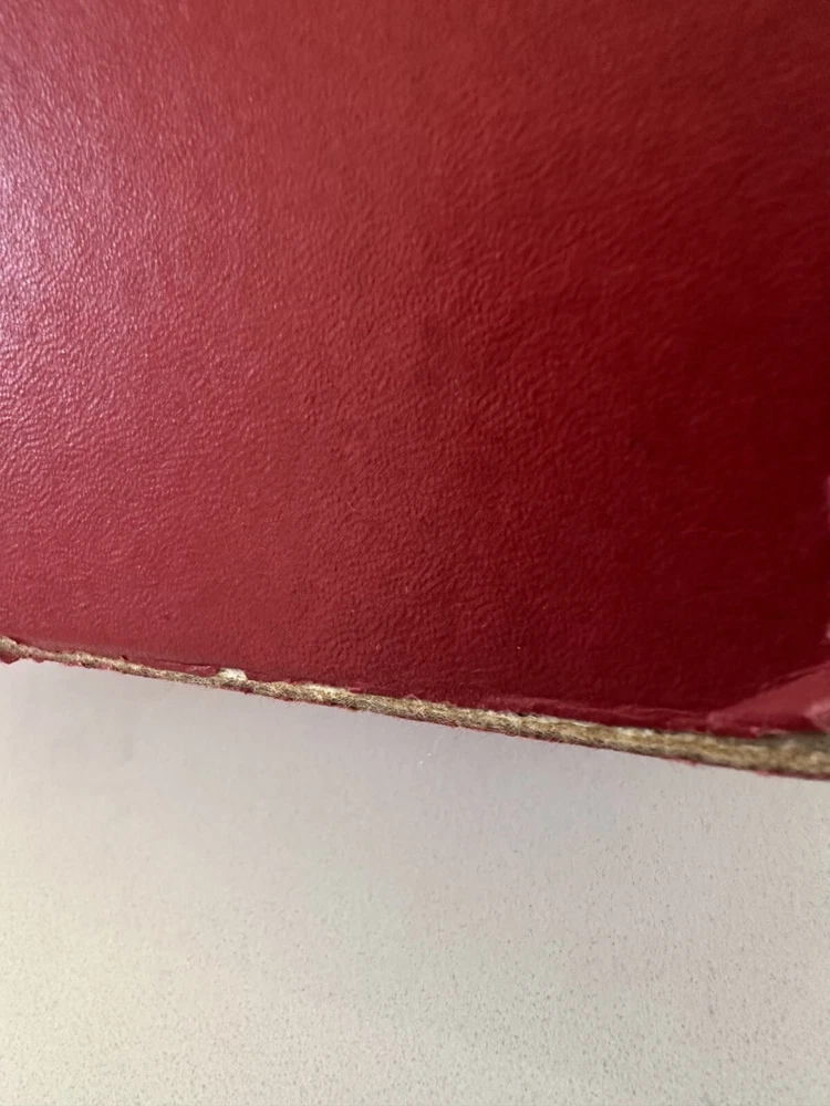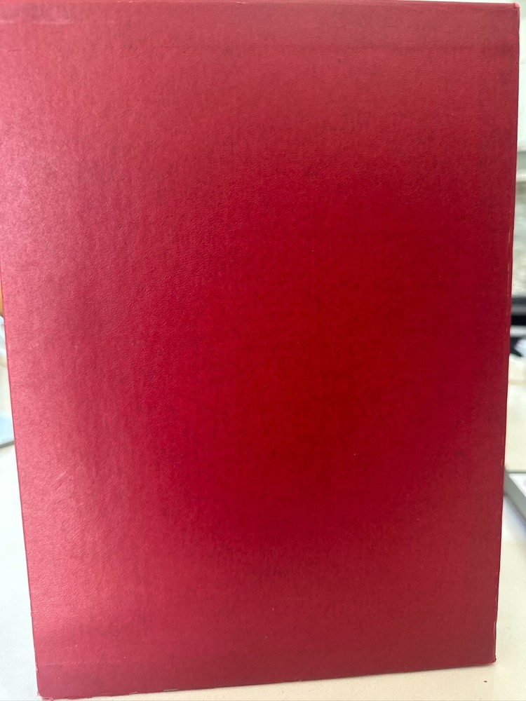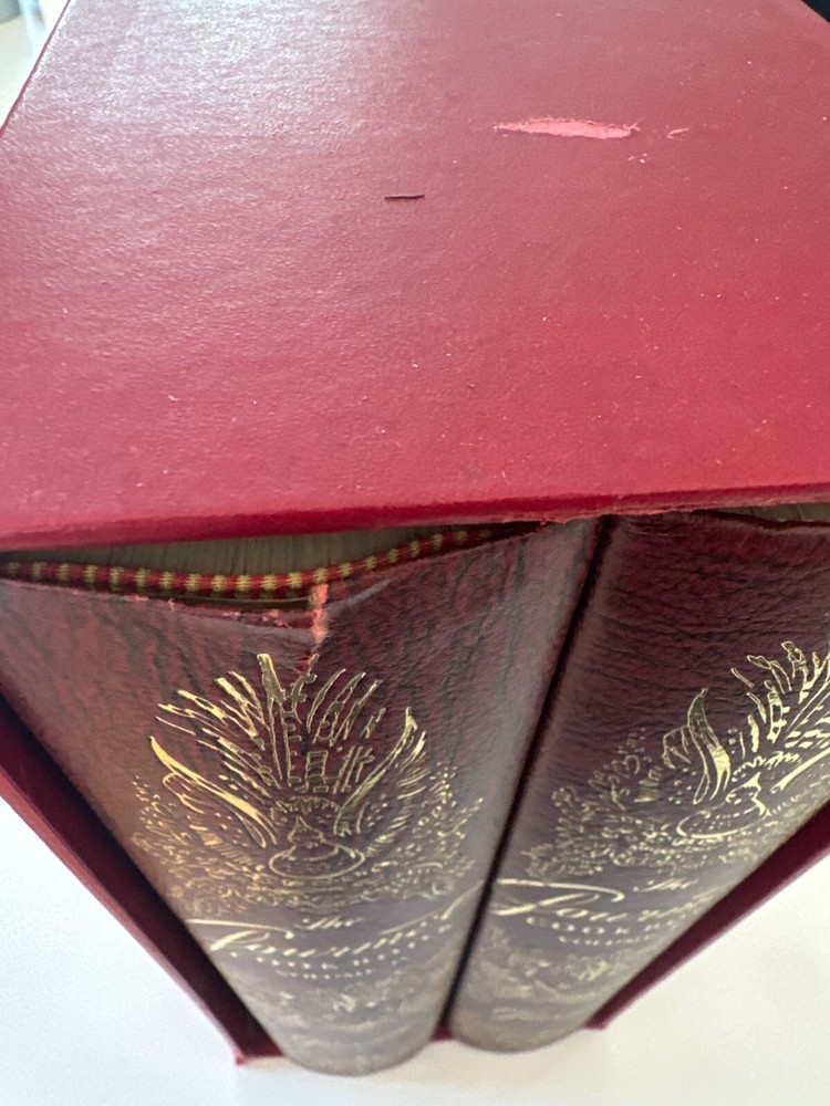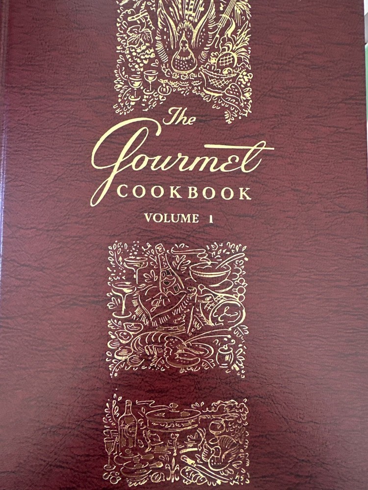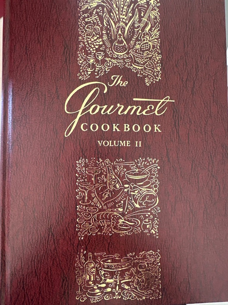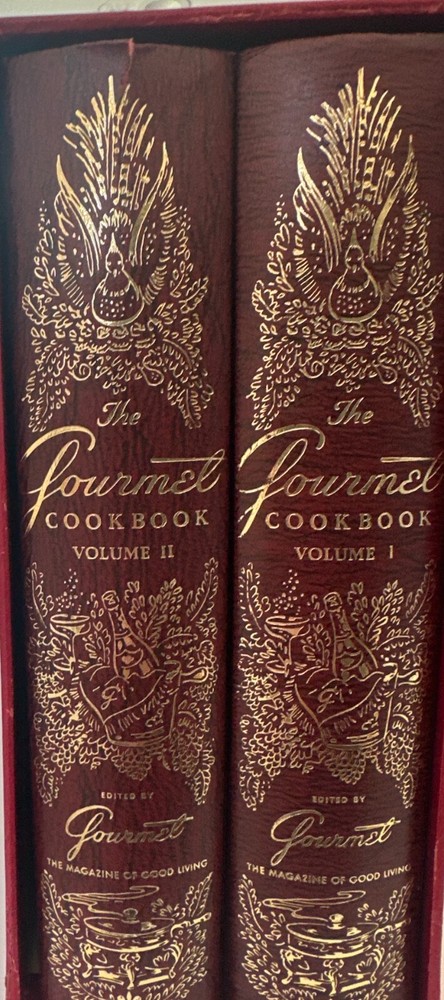 This is a beautifully preserved two-volume boxed set of The Gourmet Cookbook , edited by the editors of Gourmet: The Magazine of Good Living . Housed in the original red slipcase, both hardcovers are bound in richly textured faux leather with ornate gold-embossed designs featuring culinary motifs. The content includes thousands of recipes from around the world, drawn from the magazine's archives and renowned for both their sophistication and accessibility. Each volume is richly illustrated and organized for serious home cooks and collectors alike. This set makes an elegant addition to any kitchen library or vintage cookbook collection. While the slipcase shows signs of wear—including a visible gouge at the top and a slight split at the spine corner—the books themselves are in outstanding shape , showing minimal shelf wear.