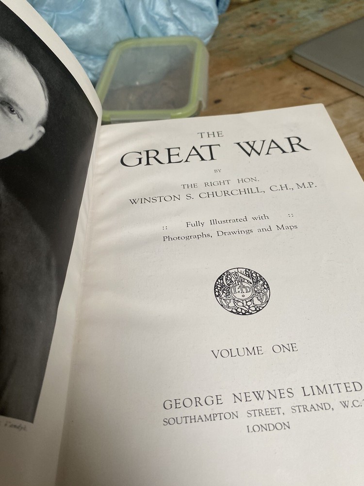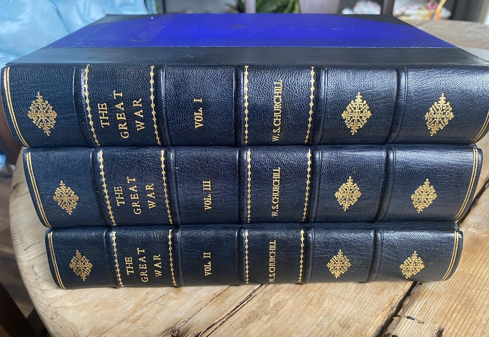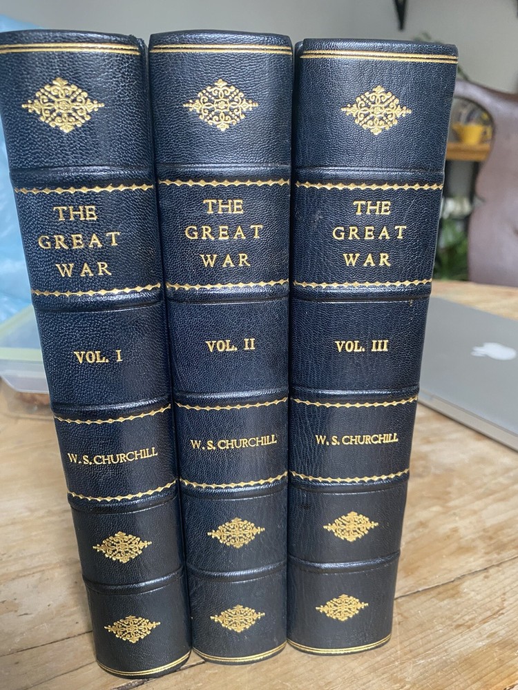 Beautiful First Edition 3 volume set of The Great War by Churchill. In flawless condition Black leather with blue cover. Very rare in this edition....