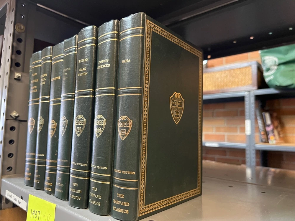 The product is a set of 8 deluxe registered edition books from The Harvard Classics, published by P.F. Collier & Son Corporation in 1937. These antique leather-bound hardcover books are in English and cover classic literature by multiple authors. The set includes a variety of topics within the classics genre and was manufactured in the United States. This particular edition is a collector's item, designed for those interested in classic literature and vintage book collections.