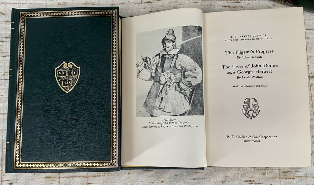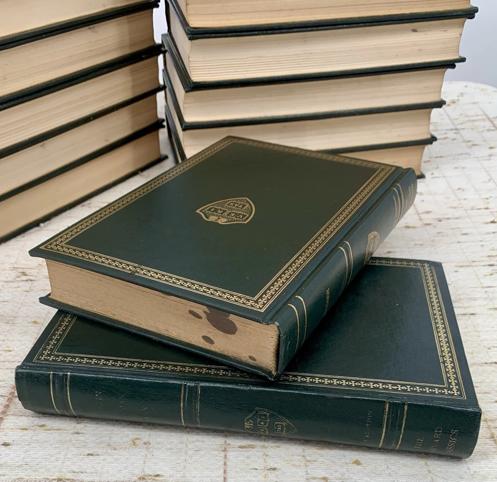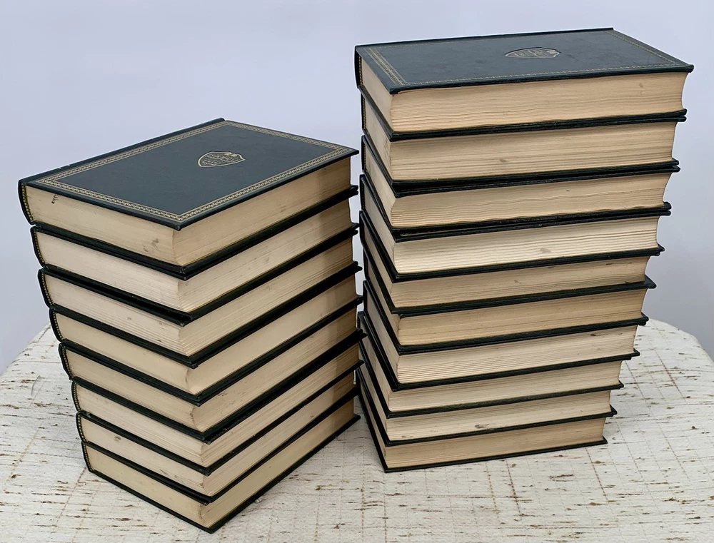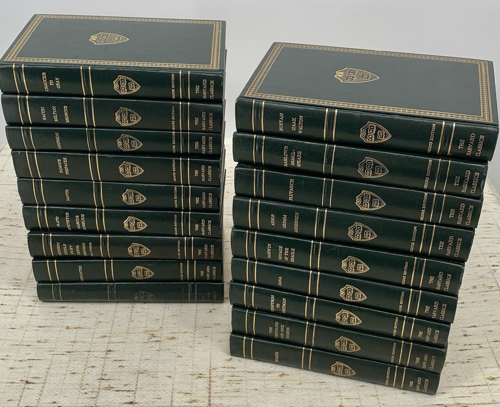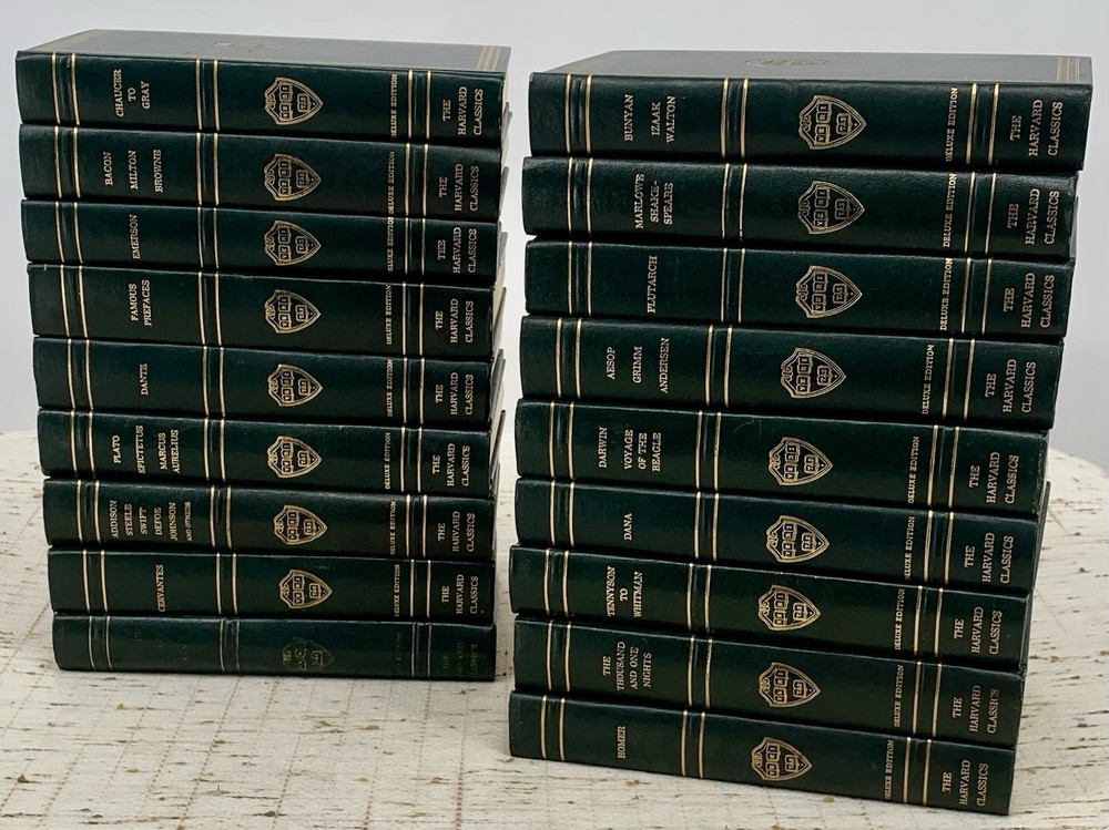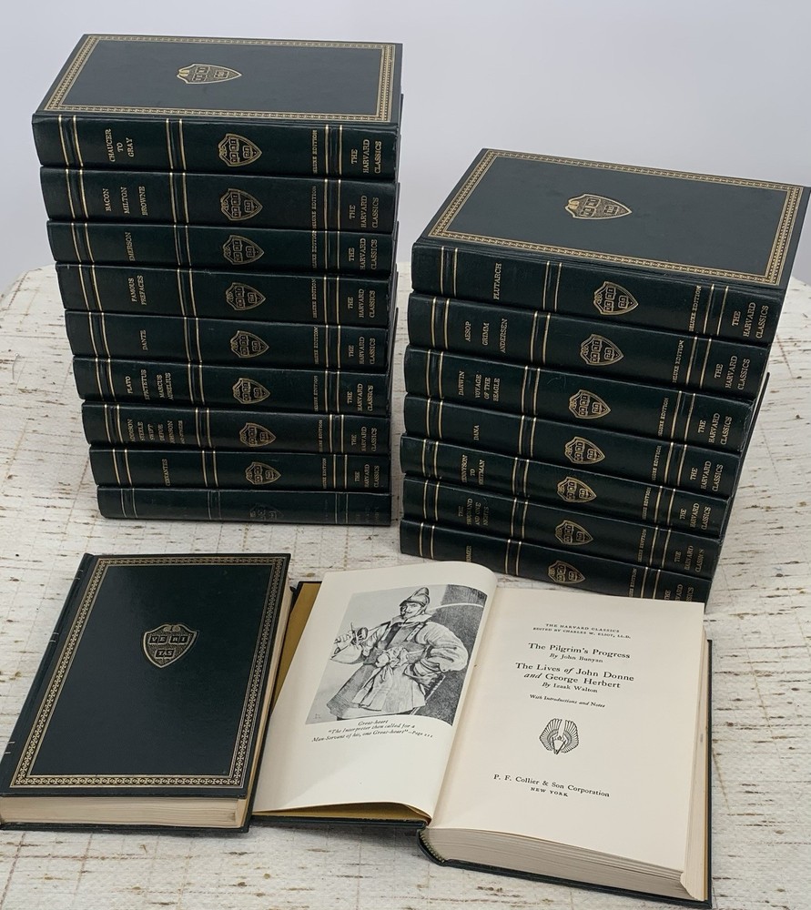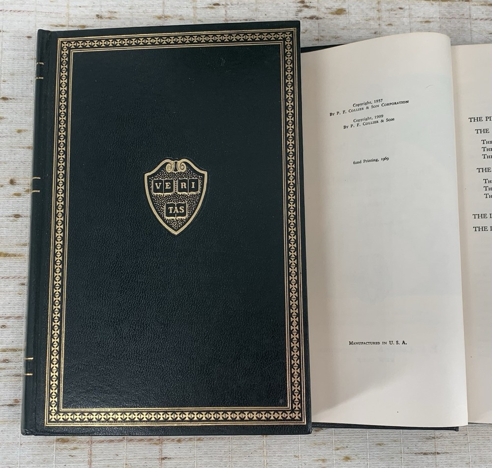 Set of 18 antique leather-bound books from "The Harvard Classics Deluxe Registered Edition" published in 1969 by P.F. Collier & Son Corporation. These classic literature books are in English and come in hardcover. The author is multiple, and the set is part of a collection of classics. Excellent condition. ( 1 book the autobiography of Benjamin Franklin Cover faded. Please refer to last photo I photographed 2 flaws) I thank you .