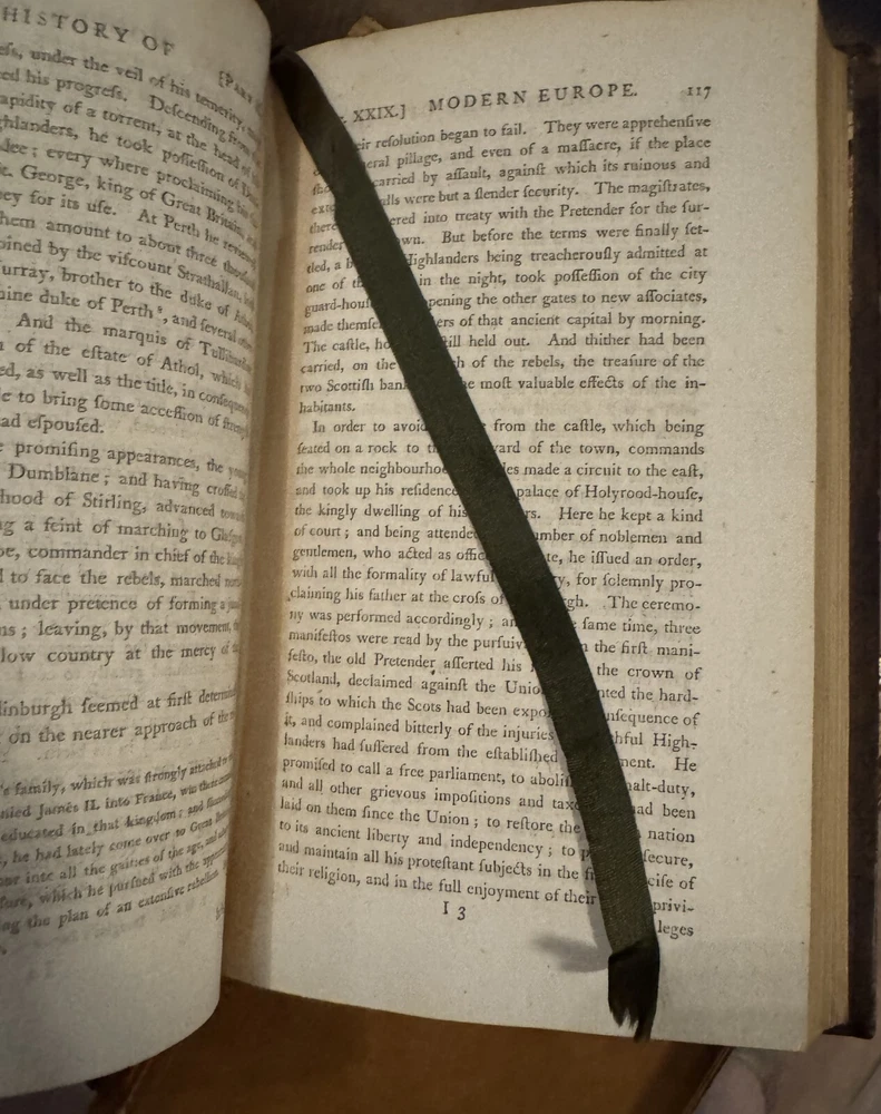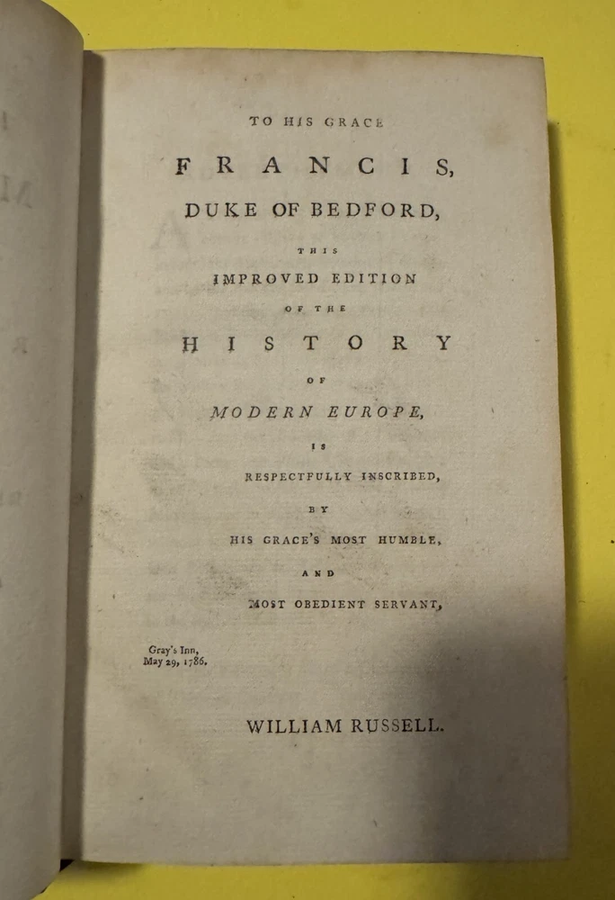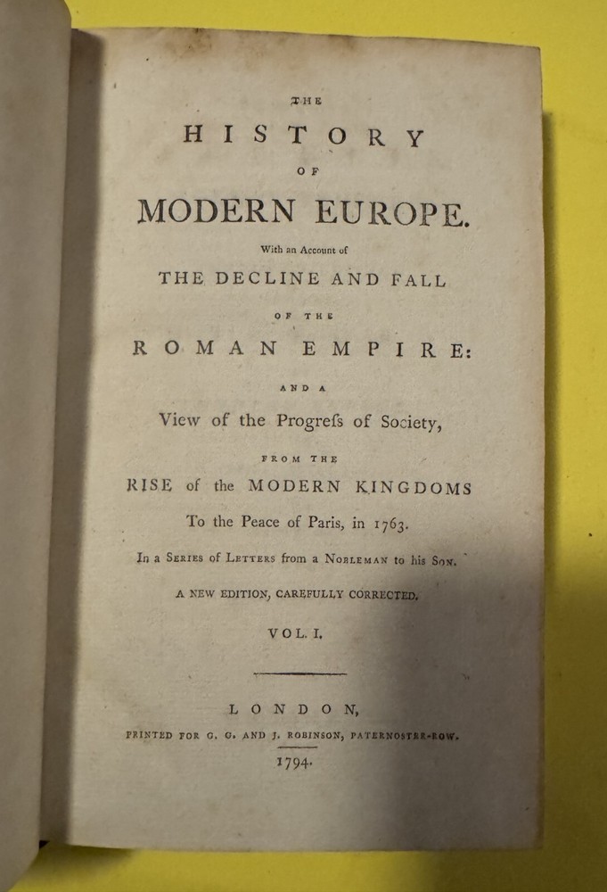 Title : The History Of Modern Europe by William Russell - 5 volume set Description: Published in 1794. Bindings are tight, no torn or missing pages, no markings on the pages. The leather spines are in good condition. Each book has an attached bookmark. There is some discoloration on the pages where the bookmarks laid in the books. Please see the photos. B(4/28/25) - kt