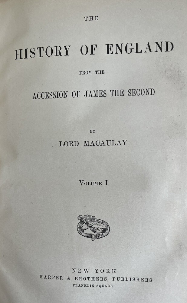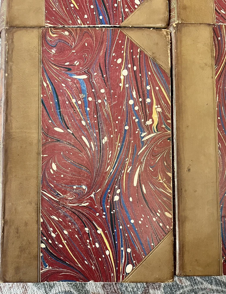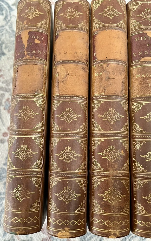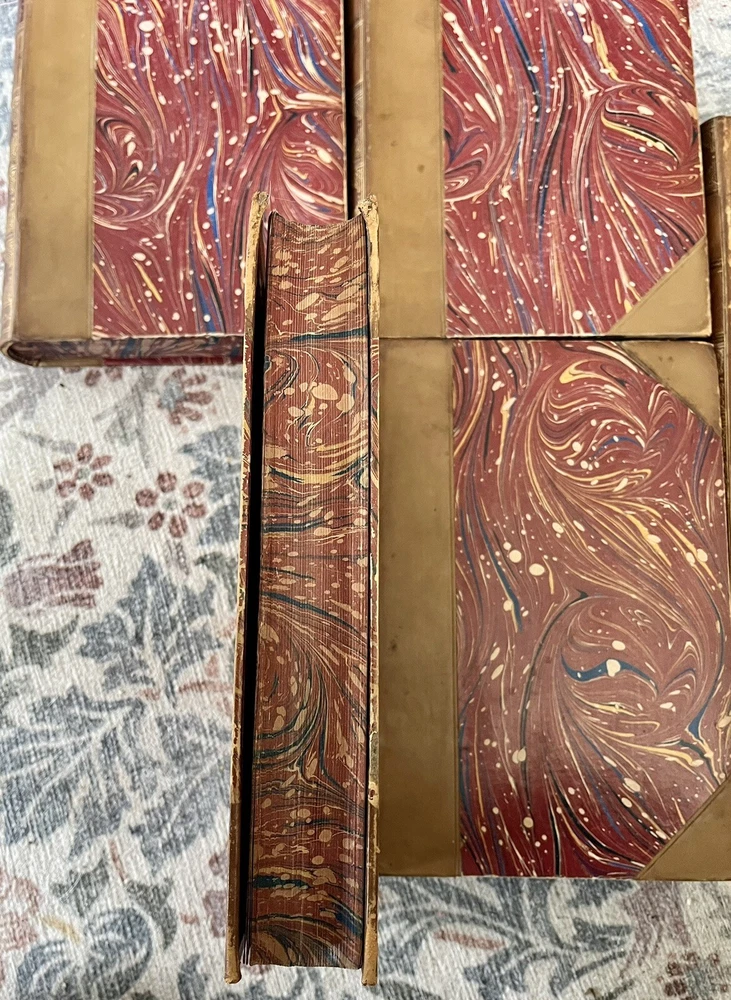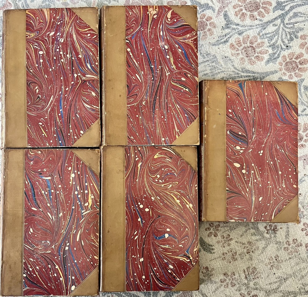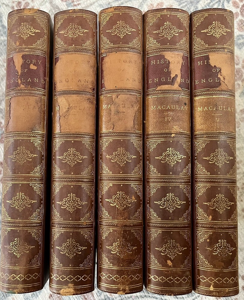 The History of England from the Accession of James the Second. By Lord Macaulay [Thomas Babington Macaulay, 1st Baron Macaulay.] New York: Harper & Brothers, Publishers, 1879. Complete set in 5 volumes, uniformly bound in three-quarter leather over marbled boards. Edges and endpapers in lovely marbled paper. The spine labels have largely chipped away, as shown in photos. However all of the bindings are sound with all boards firmly attached. Contents in excellent condition, quite clean and bright. NOT an ex-library set. Volumes measure 6” x 8.75.”