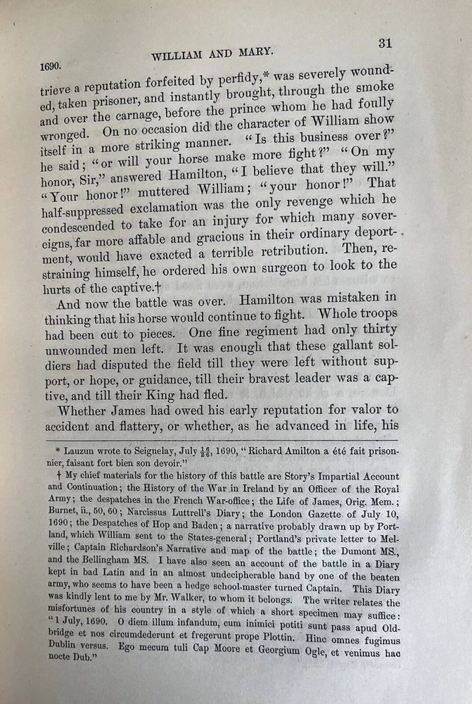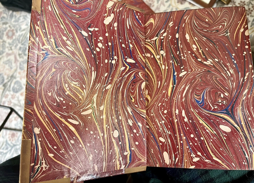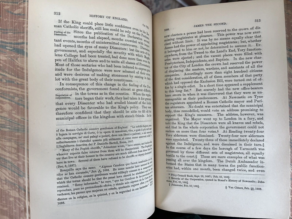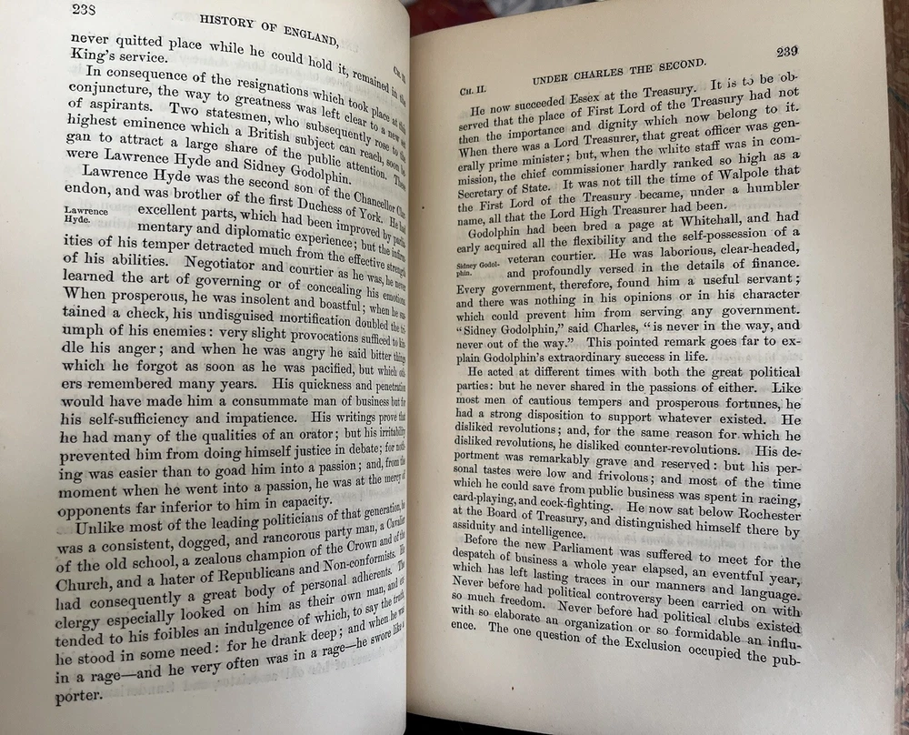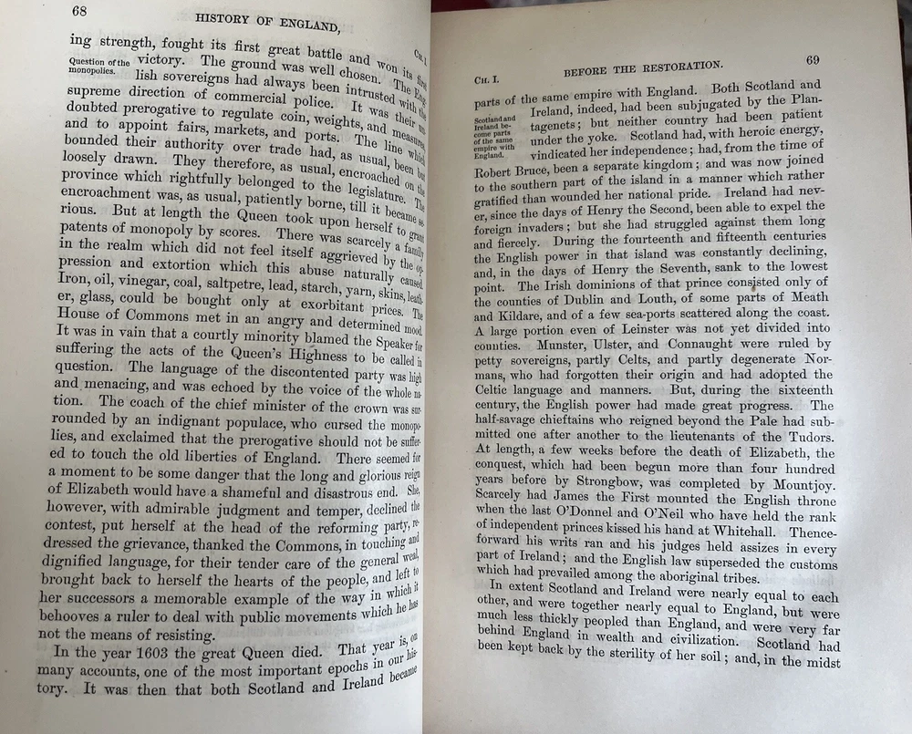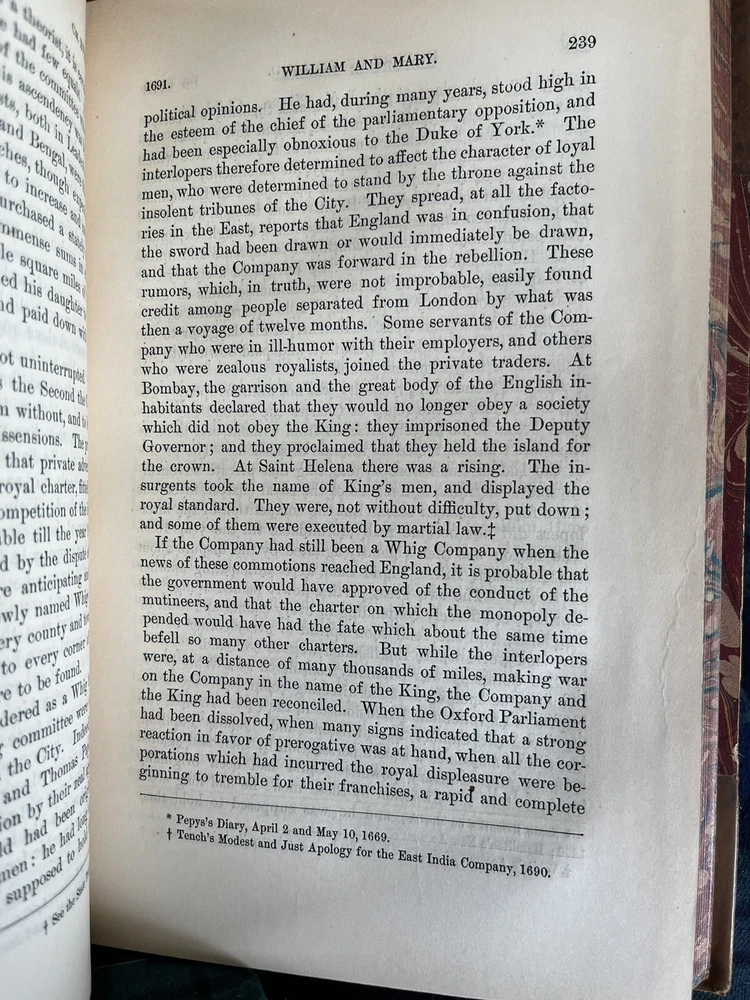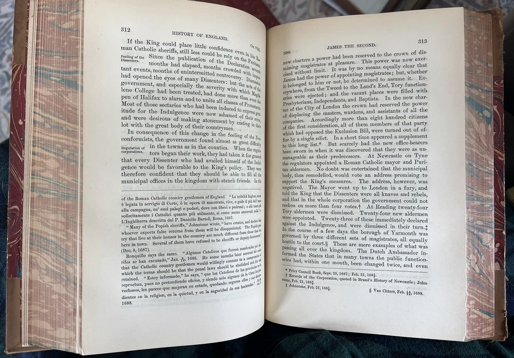 The History of England from the Accession of James the Second. By Lord Macaulay [Thomas Babington Macaulay, 1st Baron Macaulay.] New York: Harper & Brothers, Publishers, 1879. Complete set in 5 volumes, uniformly bound in three-quarter leather over marbled boards. Edges and endpapers in lovely marbled paper. The spine labels have largely chipped away, as shown in photos. However all of the bindings are sound with all boards firmly attached. Contents in excellent condition, quite clean and bright. NOT an ex-library set. Volumes measure 6” x 8.75.”