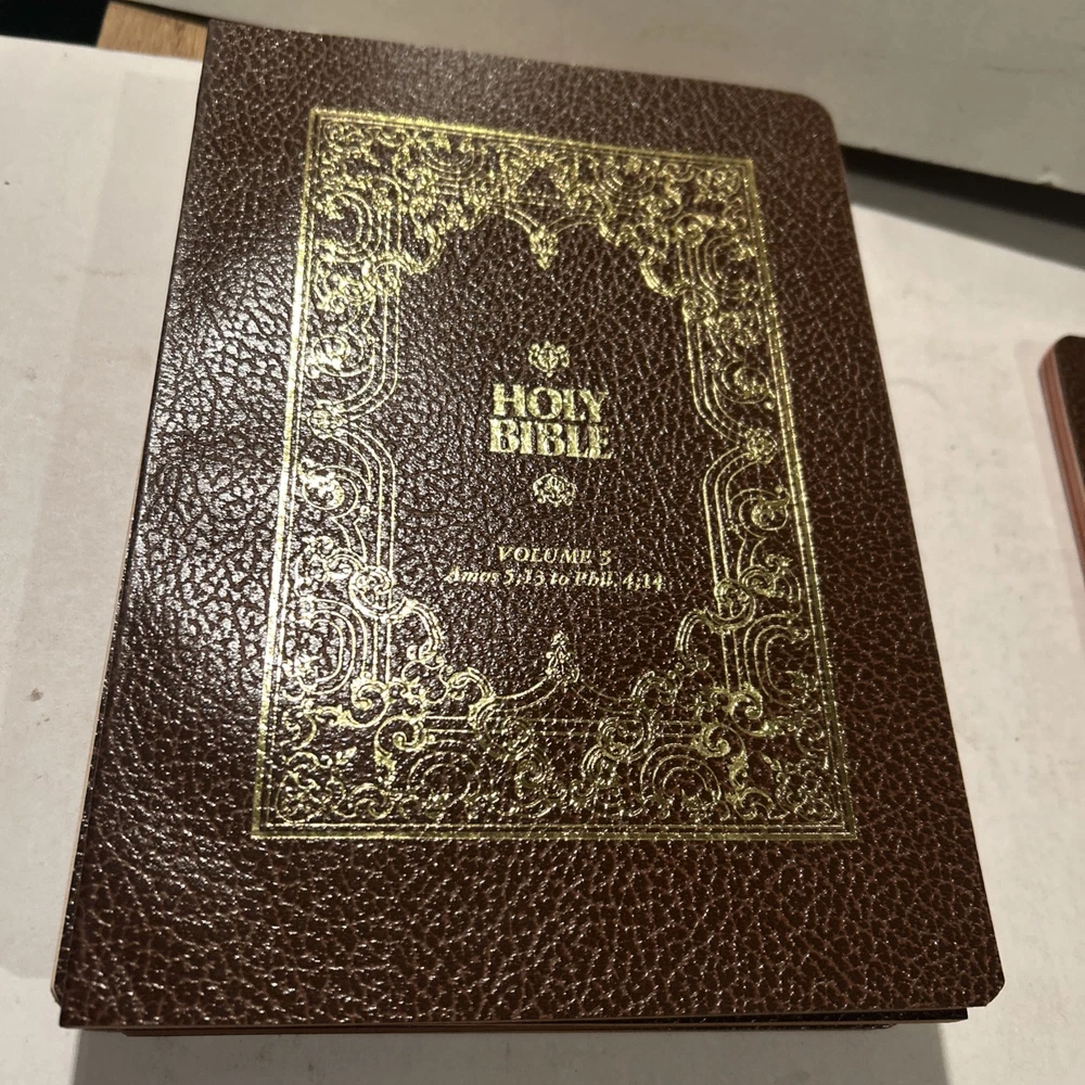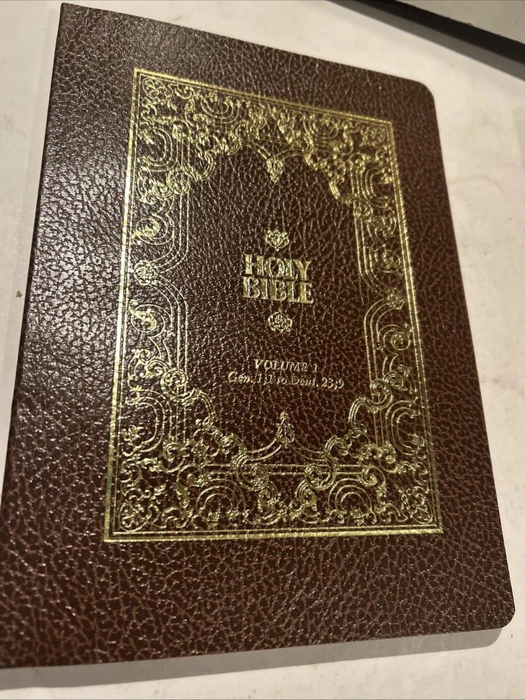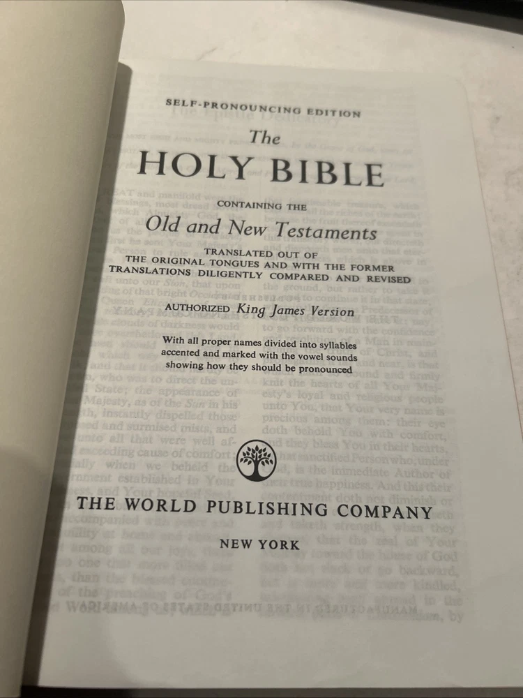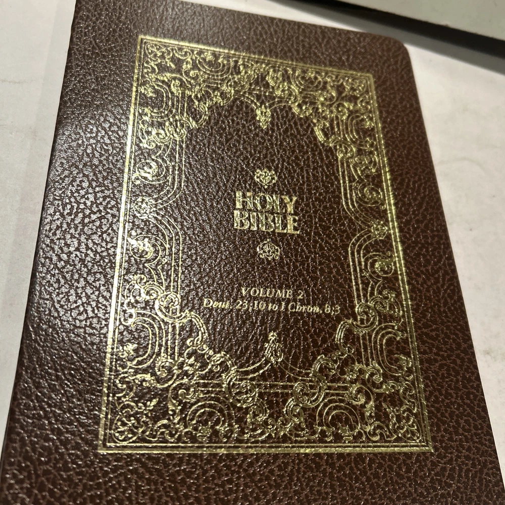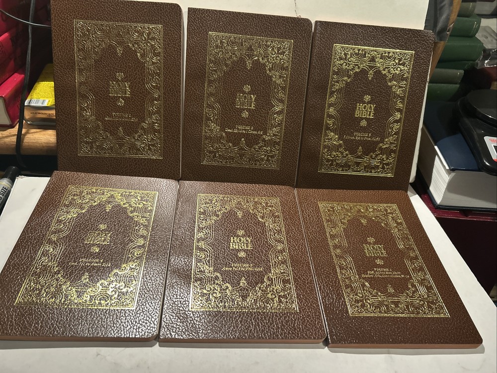 For your careful consideration: The Holy Bible King James Version Self Pronouncing Edition published in six individual volumes with matching slipcase. It features are bold large print font and the words of Christ are in bright red. COVER MEASUREMENTS: Each Volume is 9" H x 6.5" W x .3" T Dive into the timeless wisdom of "The Holy Bible King James Version Self Pronouncing Edition Volumes 1-6," thoughtfully presented in a luxurious leather-bound collector's set. This elegant slipcase edition, published by The World Publishing Company, offers a classic reading experience for both young adults and adults interested in religious and spiritual genres. Each volume is crafted in English, allowing readers to explore the rich tapestry of Christianity through a narrative that has stood the test of time. The Bible's teachings are beautifully illustrated, enhancing the understanding and appreciation of its profound messages. This set is a treasure for any reader seeking inspiration and enlightenment. ITEM CONDITION NOTES: The set is in like new condition with clean and unmarked texts. PLEASE SEE ALL PHOTOS BEFORE BUYING.