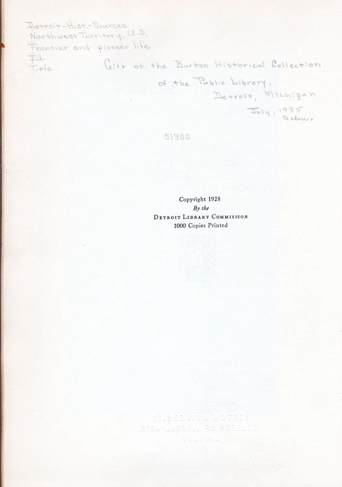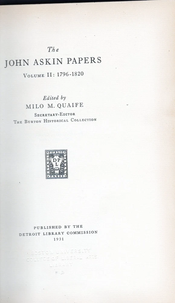 2 volume set, complete. Volume 1: 657 pages including index, frontis., illustrations listed before page 1; Volume 2: 829 pages including index, frontis., illus. listed before p. 1. This is the published account, compiled from the original manuscripts in the archives of fur trader and family on the Detroit River contained in the Burton Historical Collection at the Detroit Public Library. The editor (Milo Milton Quaife) is a Michigan author. Michigania, Biography, Fur Trade, Old Northwest.