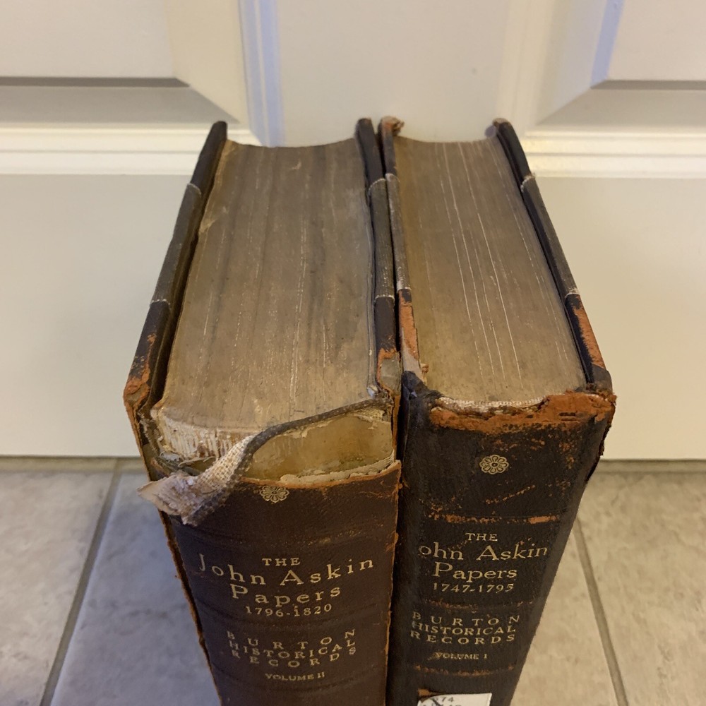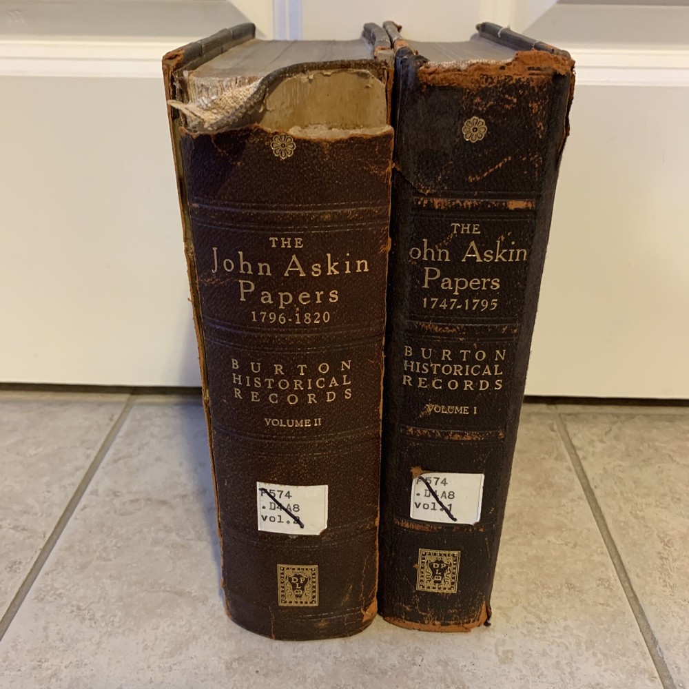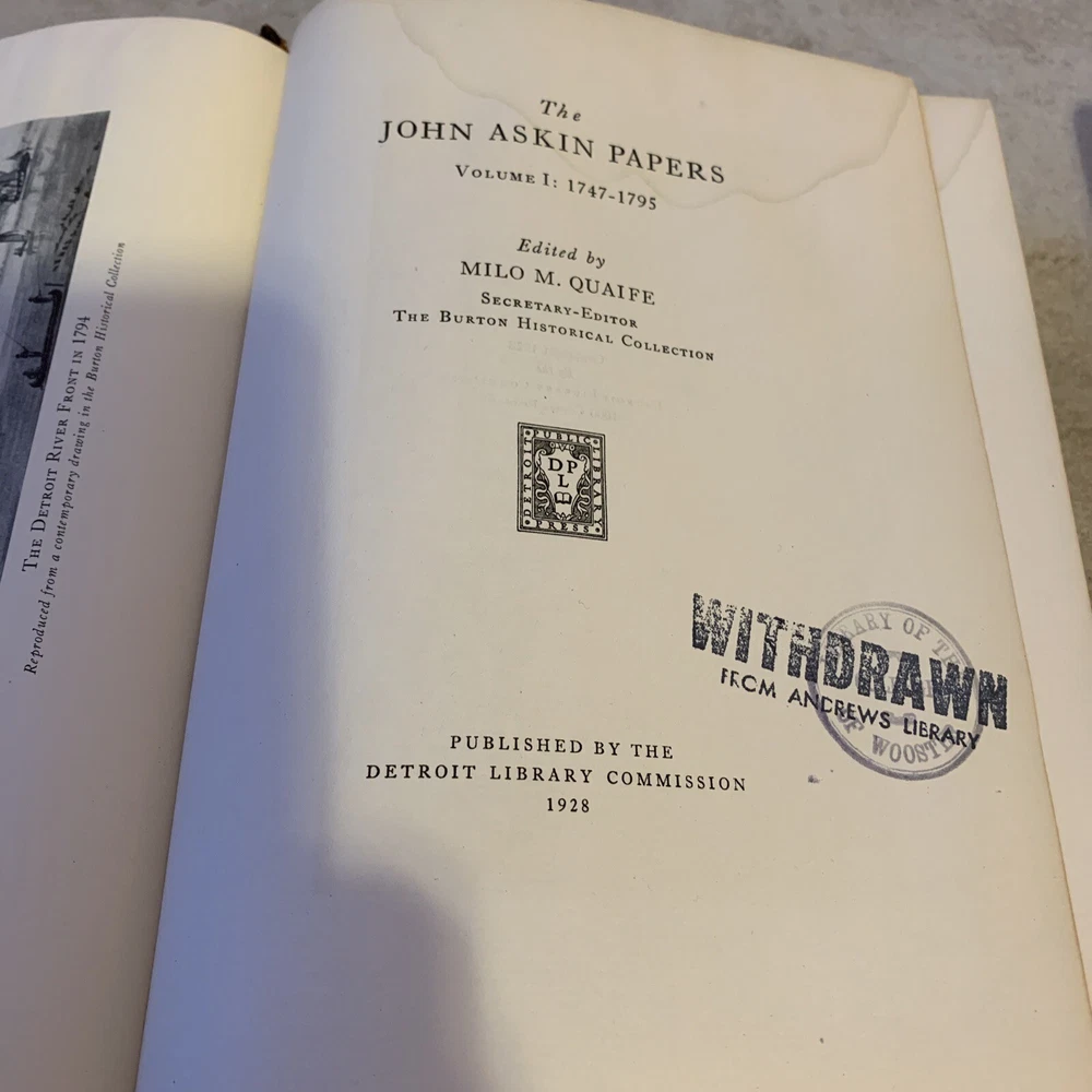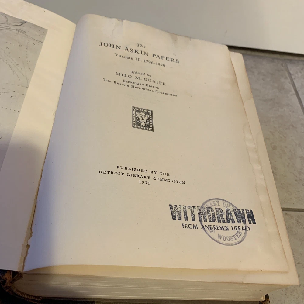 Very Rare and Scarce original Limited Edition of 1000 copies of this two volumes set leather bound . Burton Historical Records Volume 1 : 1747-1795 published by Detroit Library Commission in 1928 Volume 2: 1796-1820 published by Detroit Library Commission in 1931. The personal and family papers of John Askin brings light to the history of Detroit and mackinaw and the surrounding areas. John Askin (1762-1815) was born in Ottawa Canada. Detroit has been under British rule for a generation. Askin loyalty was to the British flag. These two volumes have been withdrawn from the Library of the College of Wooster. Overall they are in acceptable condition with wear at the spine corners and bumper corners and some water damage to the first pages of both volumes . Ex-Library markings and stickers on the spine and inside the covers.