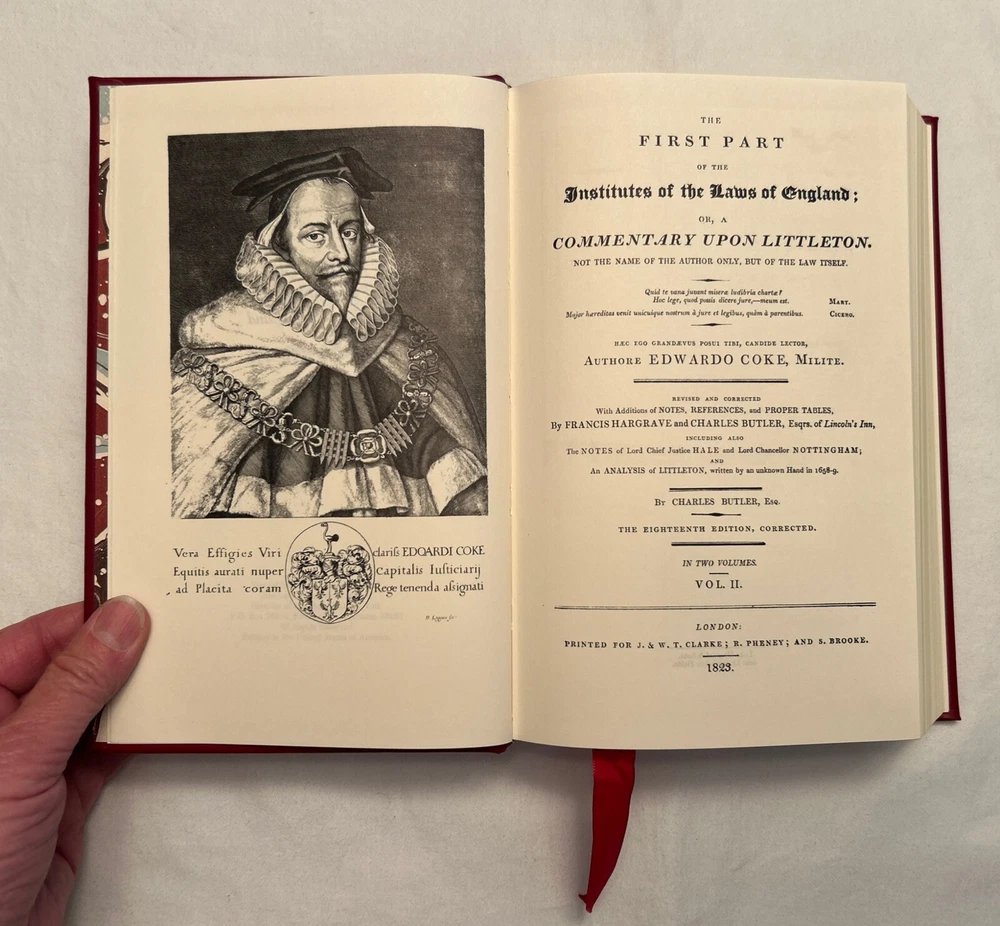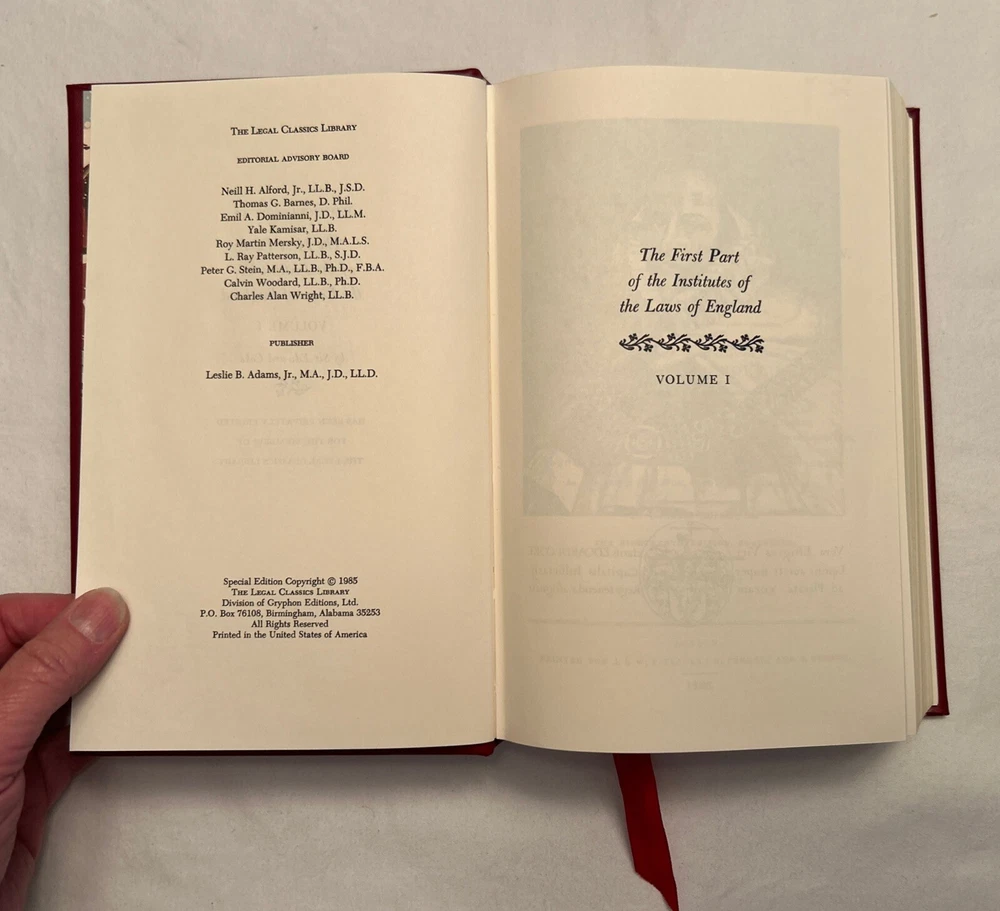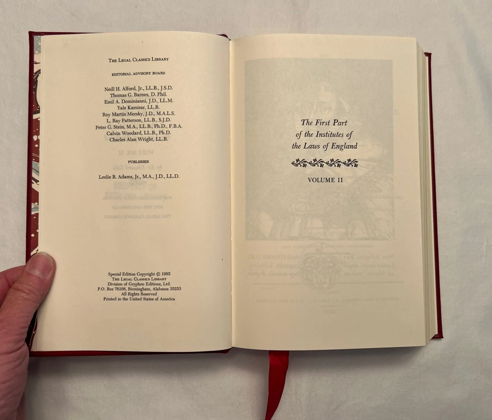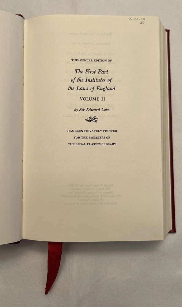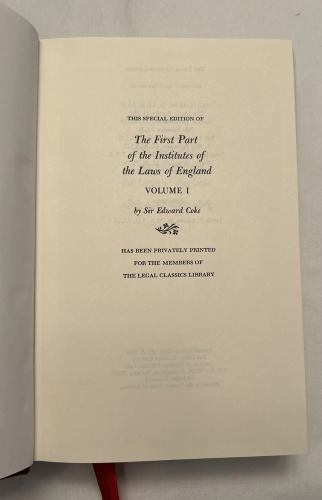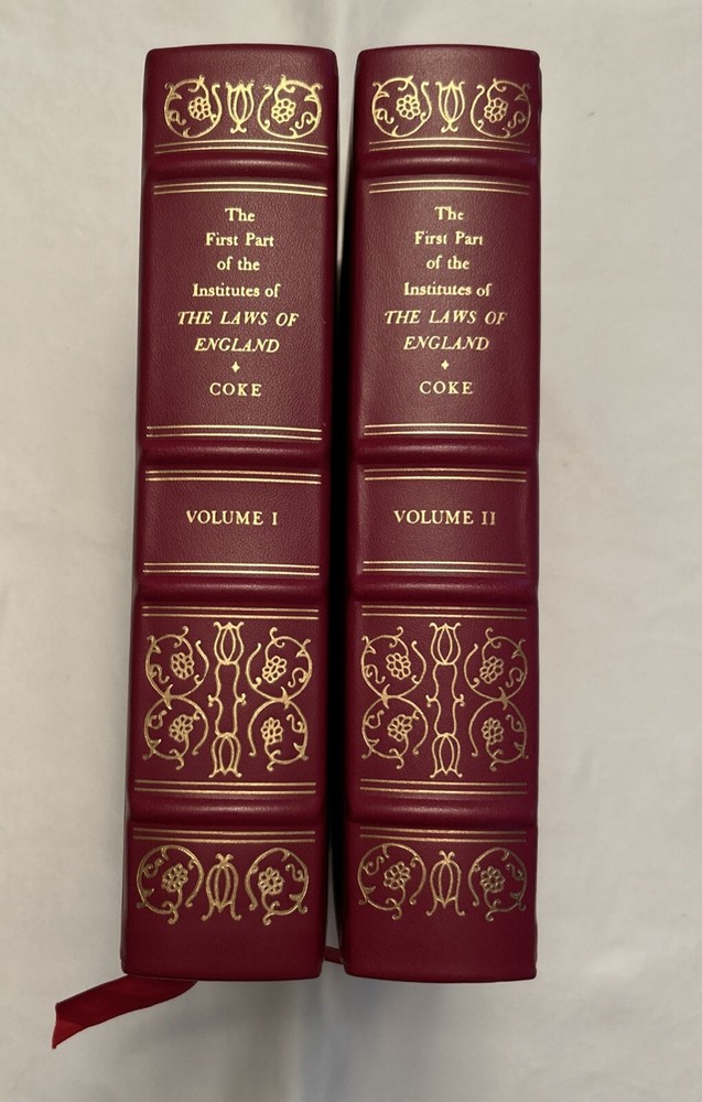 The Laws Of England Edward Coke Two Volume Hardcover Set in Ornate Red Leather with Gold Lettering, Gold Edged Pages Published by the Legal Classics Library 1985 Excellent Condition -Please See Photos to Confirm Condition Bears stamp from the local State Appellate Court which eliminated its library many years ago Shipped Fully Insured, Media Mail with USPS Tracking