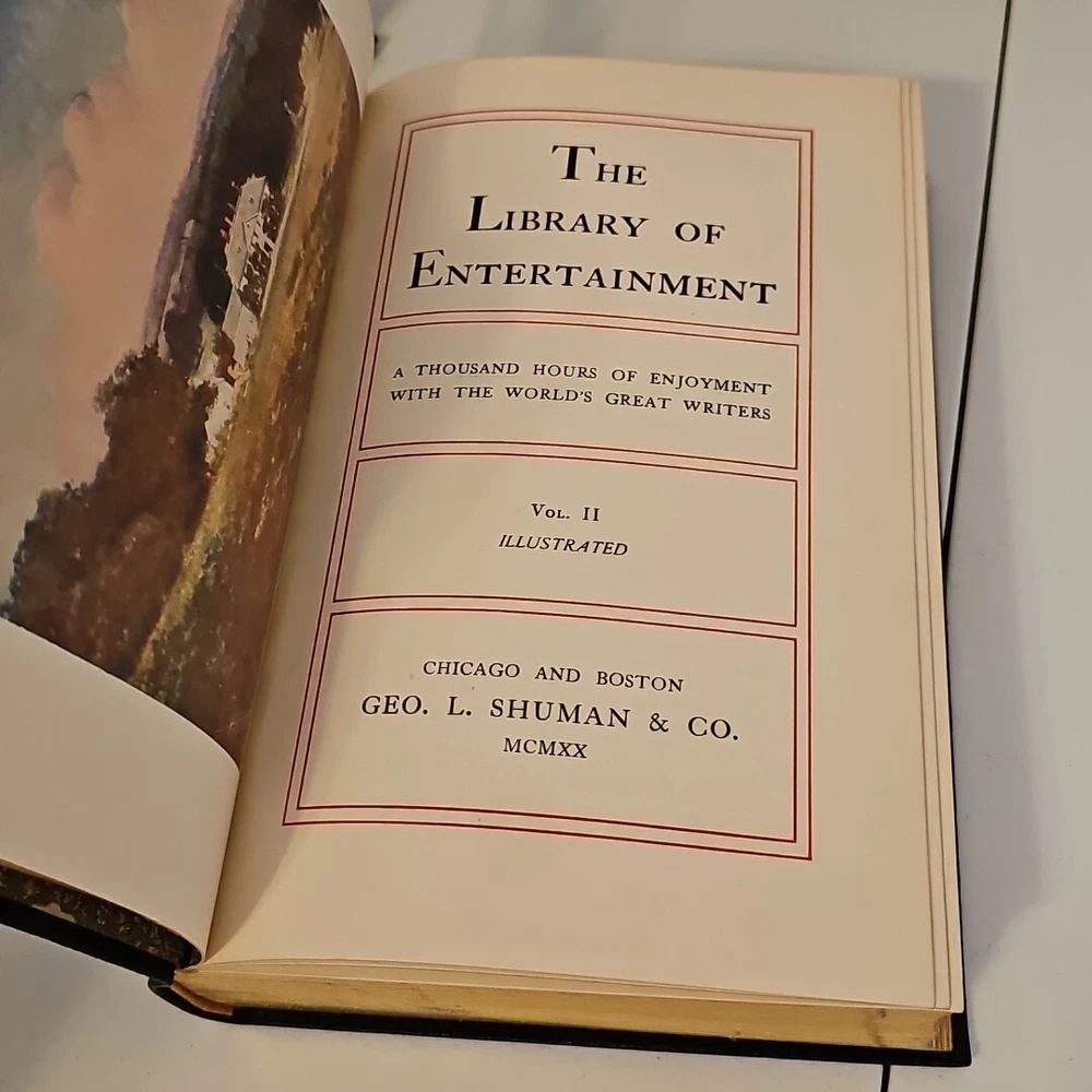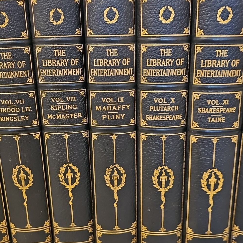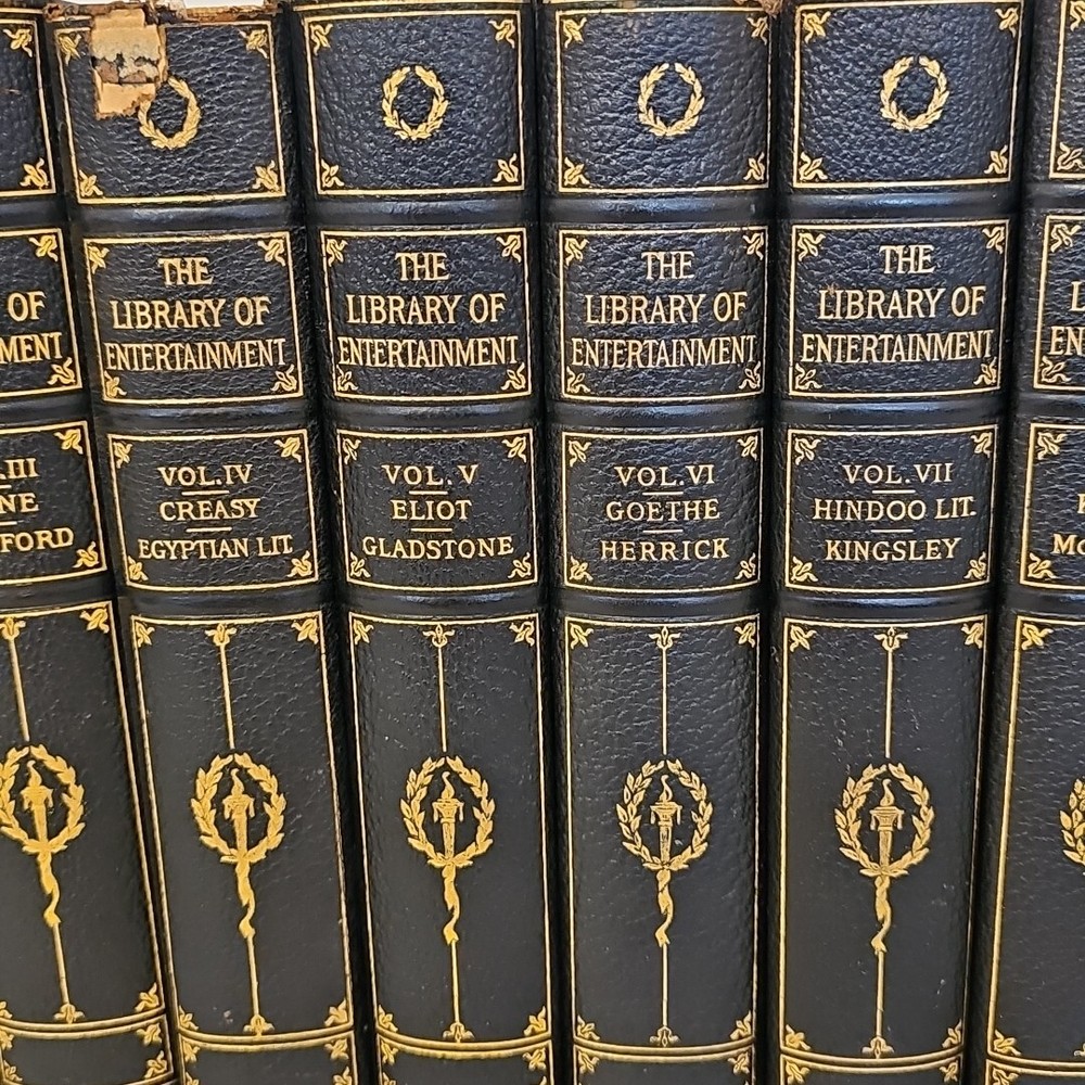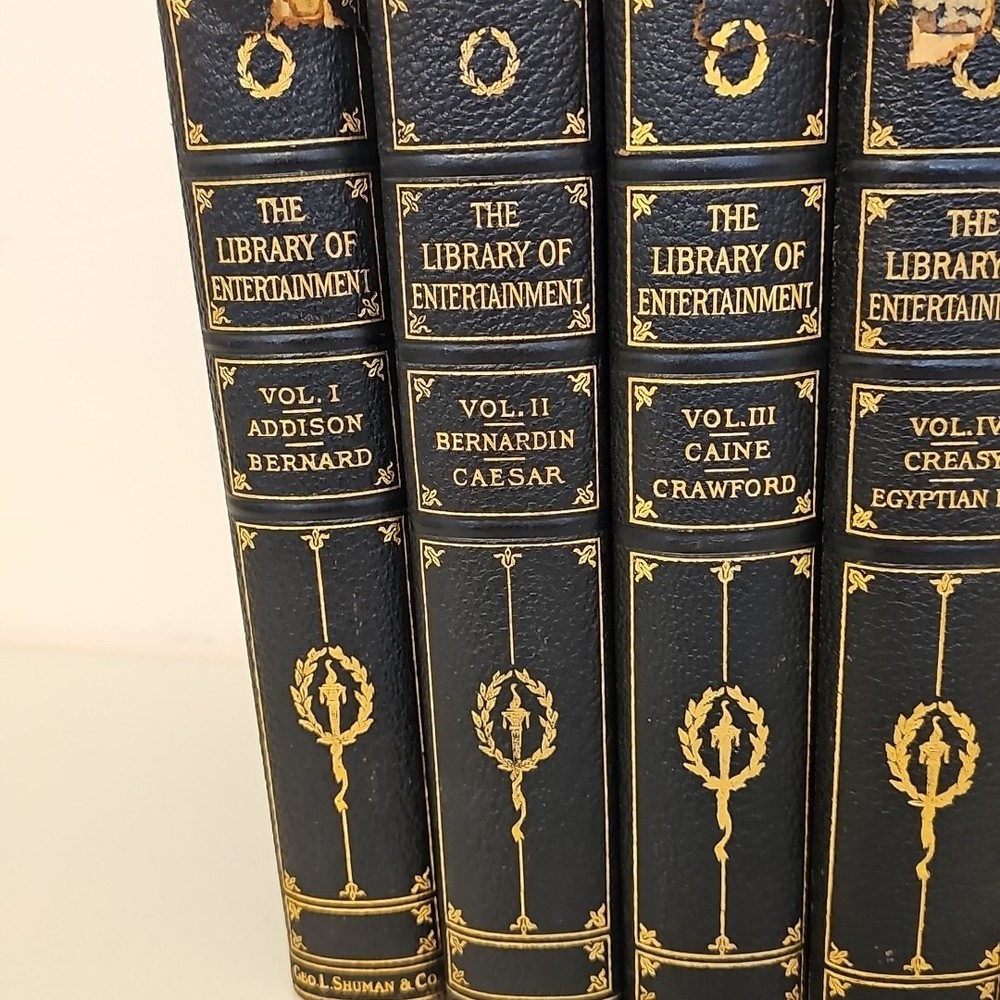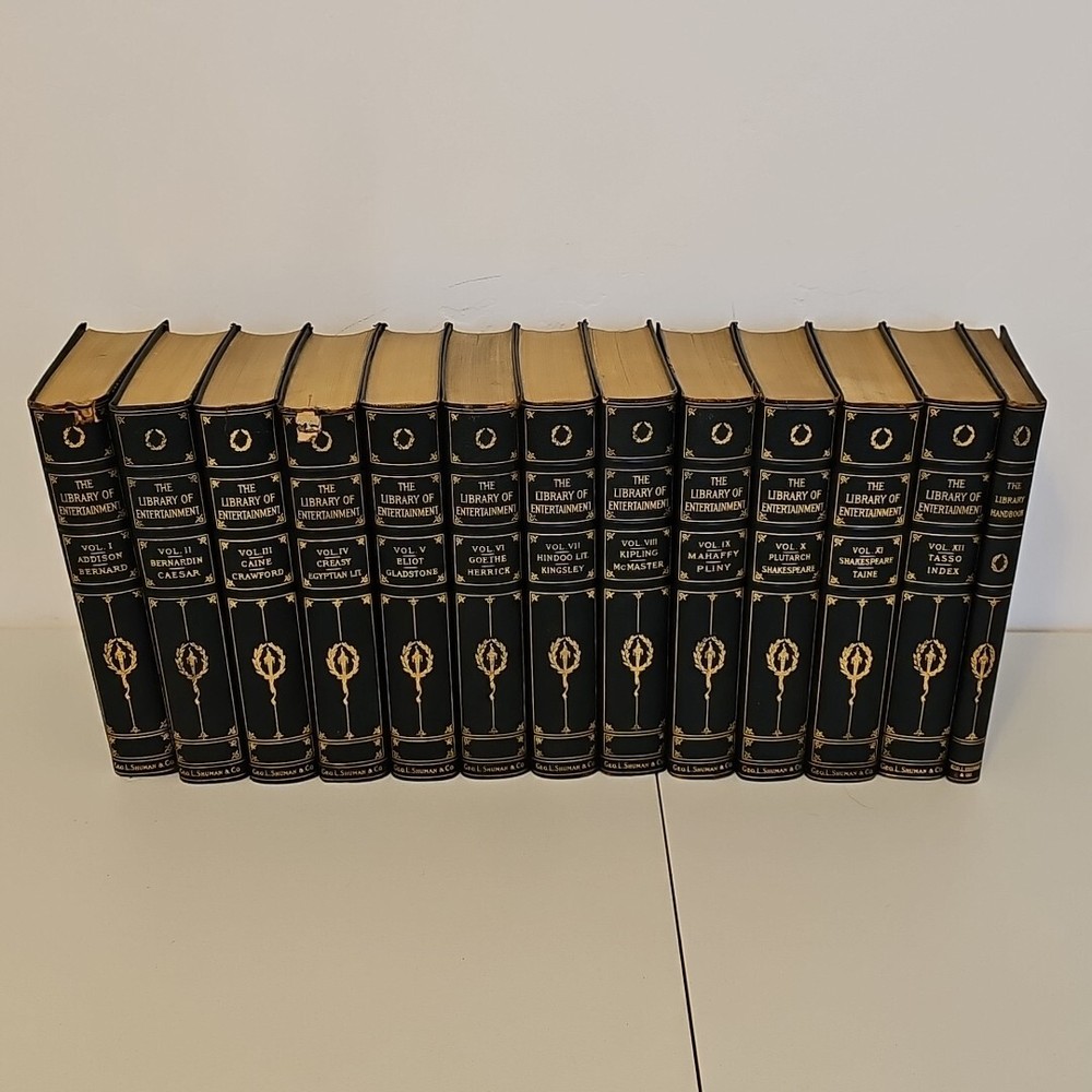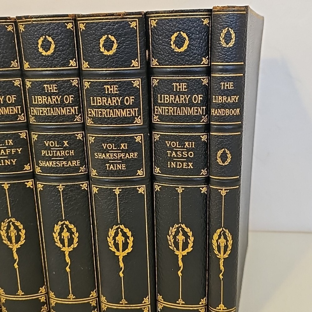 Very nice set of The Library of Entertainment. Complete with rare handbook. 13 books total. Leather or leatherette. All in very good condition, however, 4 have chipping at the top of the spine.