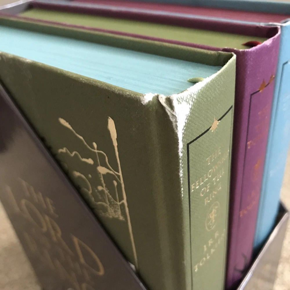 There's slight damage to two of the books (as seen). Besides that, the books are very nice. Very slight damage to the case,