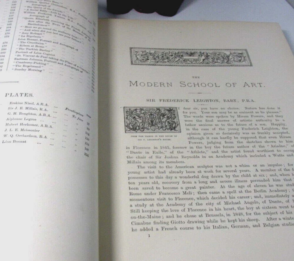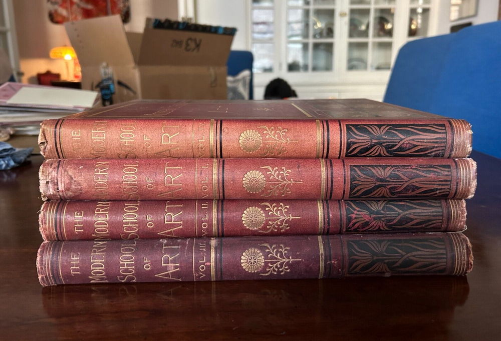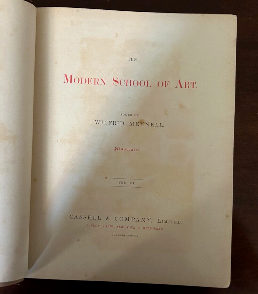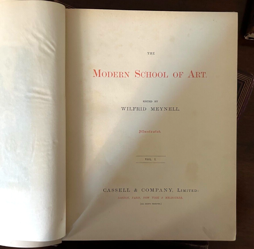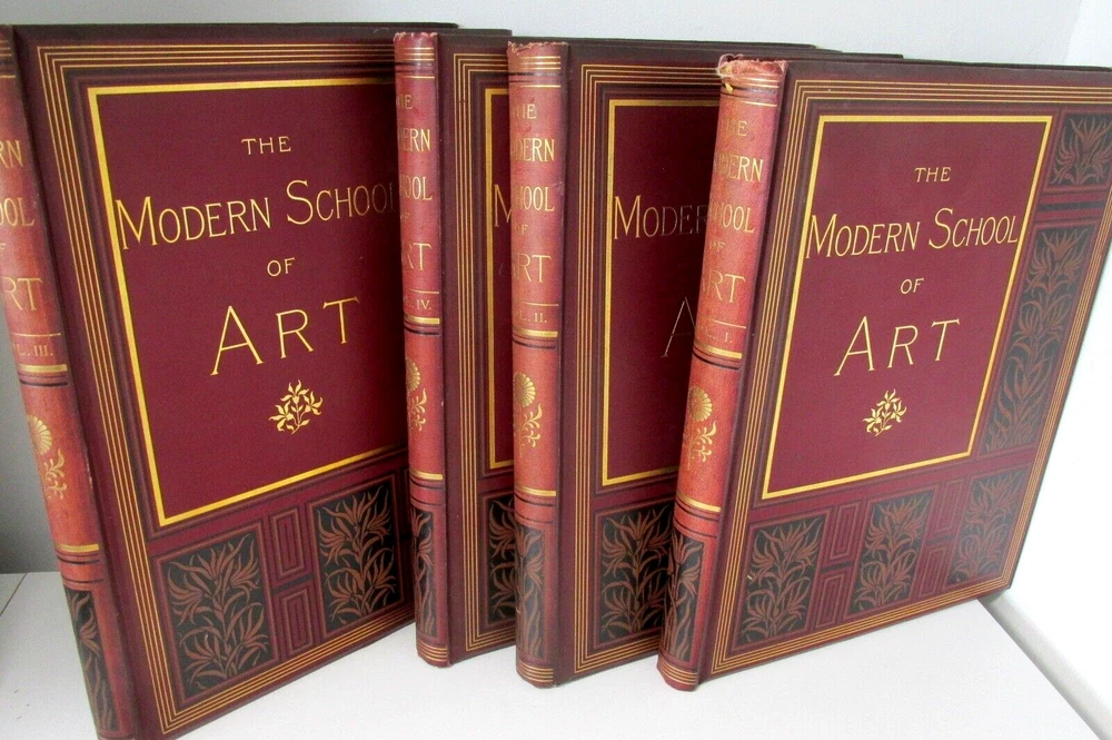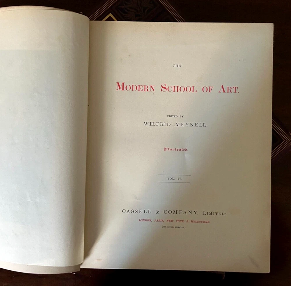 The Modern School of Art, Edited by Wilfrid Meynell. The most comprehensive and authoritative 19th century work of classic art history and scholarship. This is the extremely rare complete four volume set of the first edition Publisher: Cassell and Company Ltd., London. Publication date: not stated, circa 1885-7. Binding: decorative embossed leather with gilt tinted page ends. Extensively illustrated. A majestic and beautiful work of art in its own right. Very large (13" x 10" elephant folio) and heavy (8.1kg) set. Condition: all volumes VG; pages clean of marks, all illustrations present and intact; with age foxing throughout, some edge/shelf wear to boards with minor rubbing to spine edges; some sun fading to covers. There can be no finer gift for the serious collector or student of art. If you wish to buy on behalf of an educational institution or other non-profit, please message us before bidding.