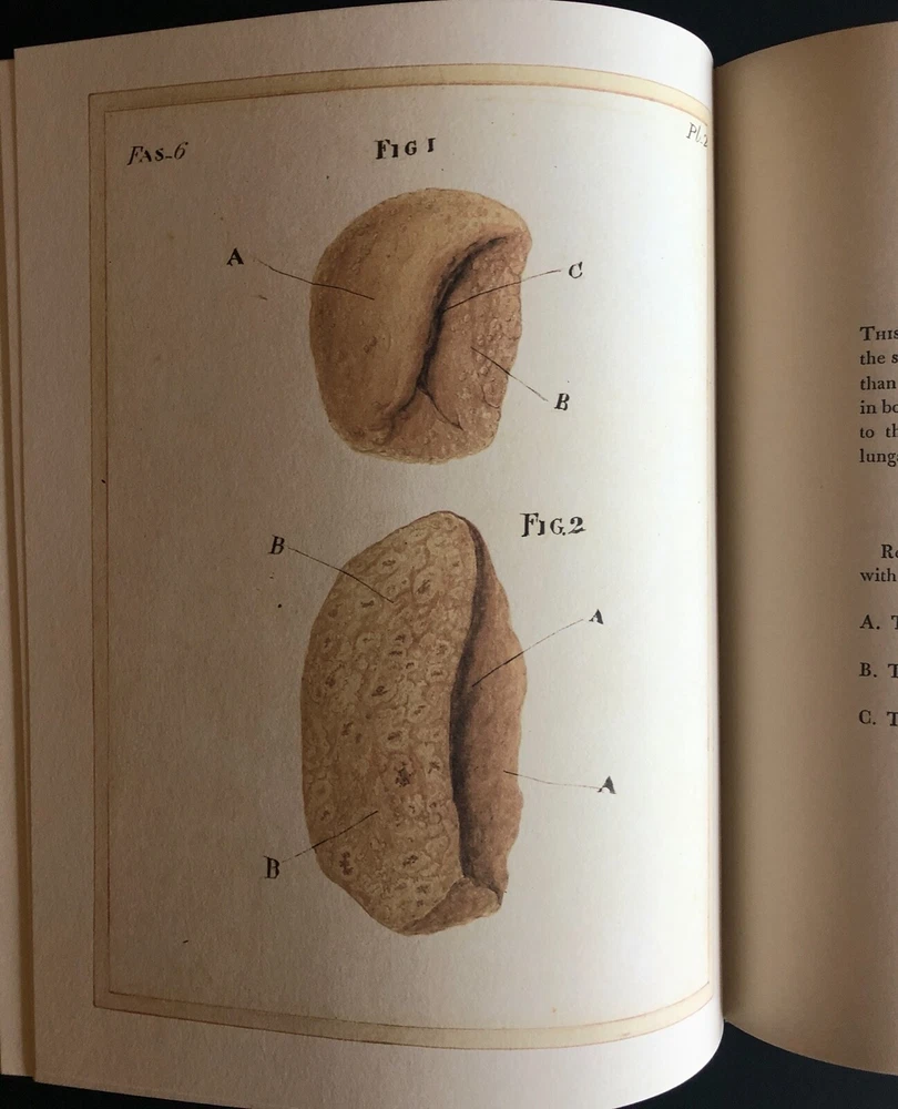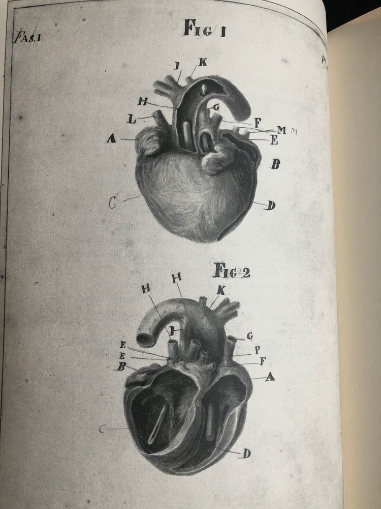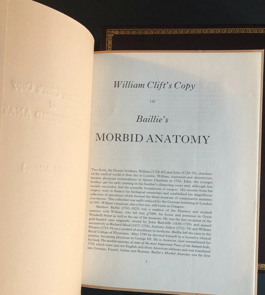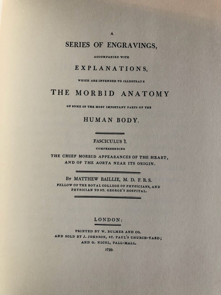 A SERIES OF ENGRAVINGS, ACCOMPANIED WITH EXPLANATIONS, WHICH ARE INTENDED TO ILLUSTRATE THE MORBID ANATOMY OF SOME OF THE MOST IMPORTANT PARTS OF THE HUMAN BODY. FASCICULUS 1 COMPREHENDING THE CHIEF MORBID APPEARANCES OF THE HEART, AND OF THE AORTA NEAR ITS ORIGIN . BY Matthew Baillie, M. D. F.R.S. FELLOW OF THE ROYAL COLLEGE OF PHYSICIANS, AND PHYSICIAN TO ST. GEORGE'S HOSPITAL ________________________________ Book Title The Morbid Anatomy of the Human Body Publication Details Published by Melbourne University Press Place: Carlton, Victoria Date: 1985 Edition: Facsimile of the 1799 edition Language: English Physical Dimensions Format: Hardcover Dimensions: 26.2cm x 33.8cm x 6.2mm Pages: ii, 236 About this Book Condition : Full leather, gilt title on spine, five raised bands with gilt embellishment (tiny nick on bottom raised band); burgundy velvet slip-case. Minor stains on outside edge. A very good copy. Please see photos and feel free to contact me with any queries! H3