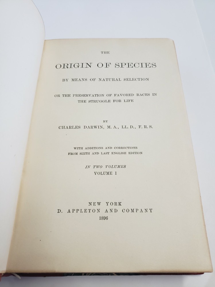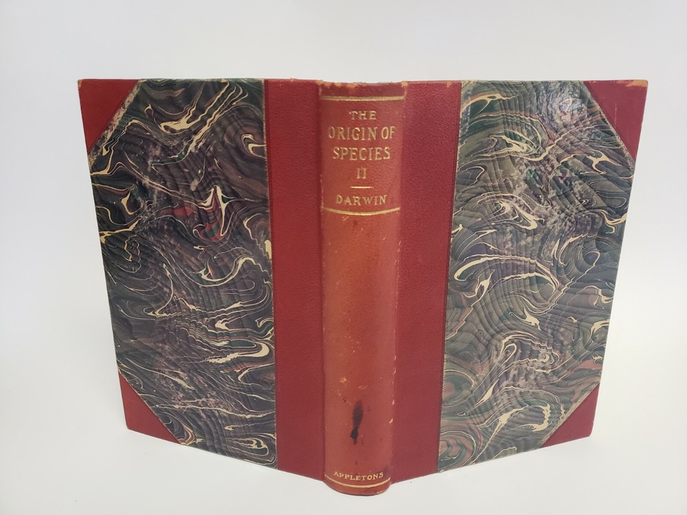 The Origin of Species by Means of Natural Selection or the Preservation of Favored Races in the Struggle for Life ( Two Volume Set) By Charles Darwin Volume I - New York: D. Appleton & Company, 1896. Leather and marbled boards. 5 x 8”. 365 pp. Good. Rubbing and soiling to the boards. The text appears unmarked. The binding is slightly shaken, but still intact. Volume II - New York: D. Appleton & Company, 1896. Leather and marbled boards. 5 x 8”. 339 pp. Good. Rubbing and soiling to the boards. The text appears unmarked. The binding is solid. Please feel free to ask any questions. Be sure to take a look at my store for similar items. Good Luck!!! Payment is requested as soon as possible. Shipment is made when payment has cleared. We will gladly combine shipping on multiple items to save on shipping costs. 100% Satisfaction Guaranteed - If you are not satisfied with your purchase, please contact us within 30 days of receiving the item. We consider a sale final after 30 days. All items must be returned with their original materials to receive a refund. Shipping is non-refundable.