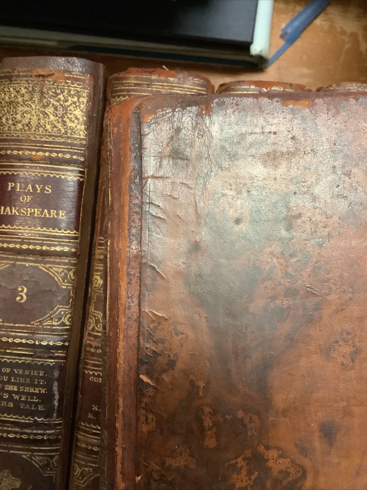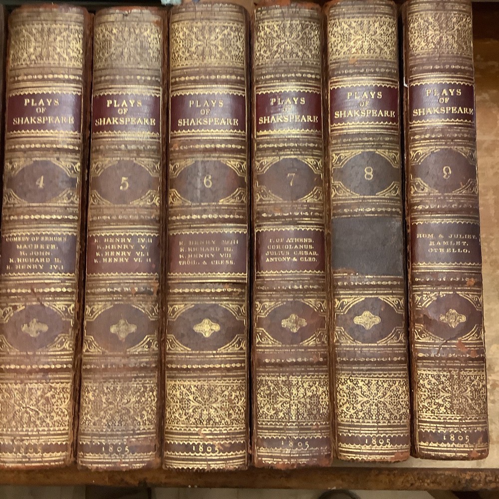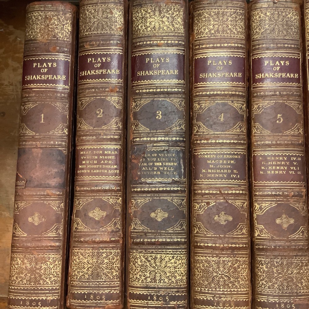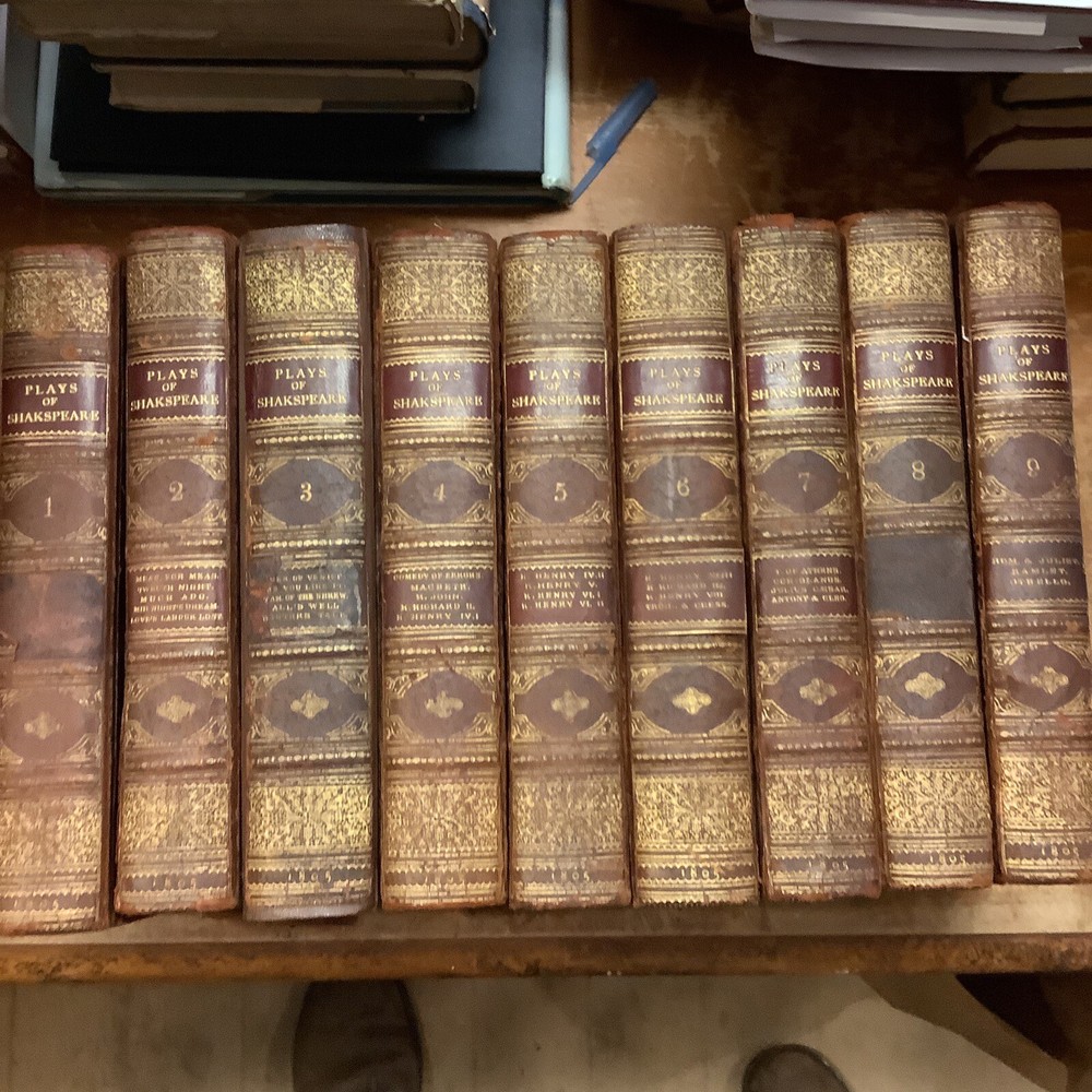 The Plays of William Shakspeare (Shakespeare). 9 volumes. Complete. Full leather bindings. Seemingly rebound with new spines. General wear to bindings, some spine labels missing. Gift inscription on the title page of every volume. Black-and-white illustrations.