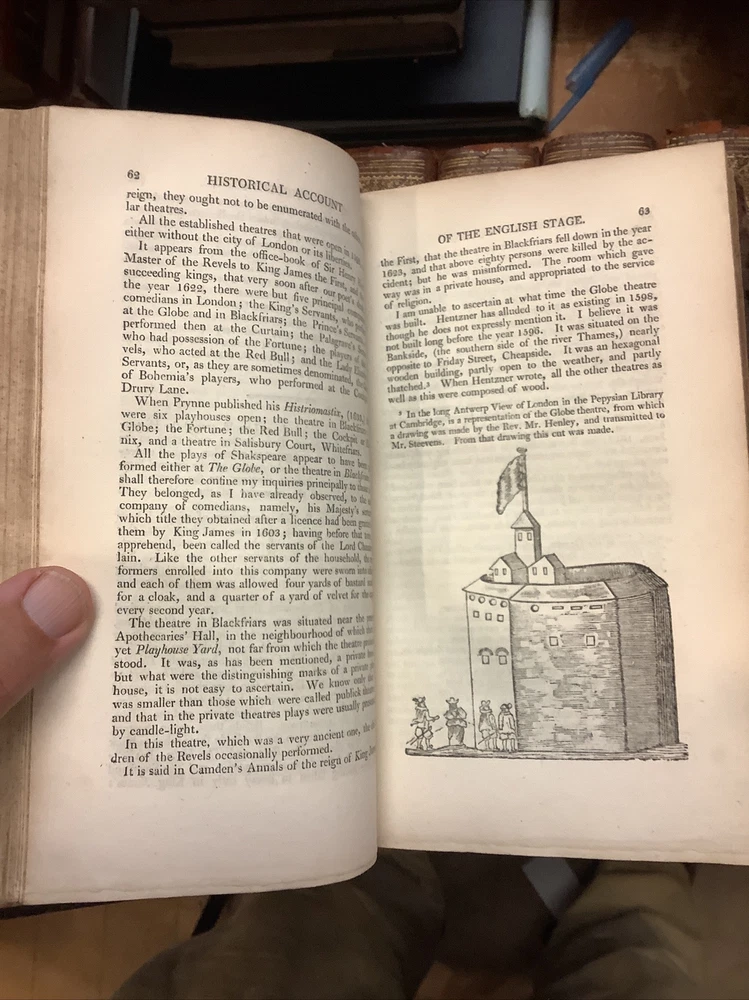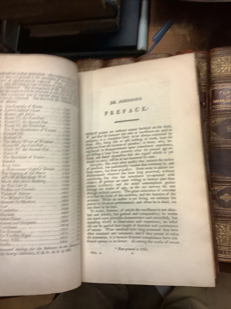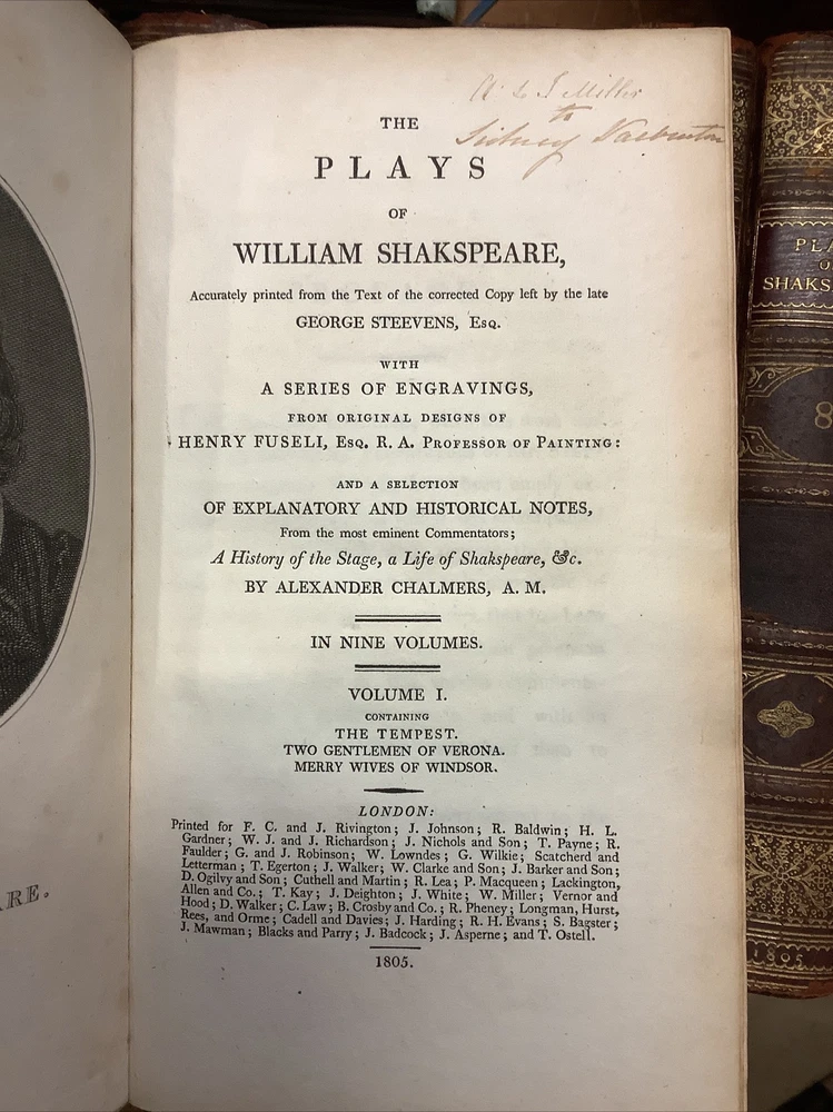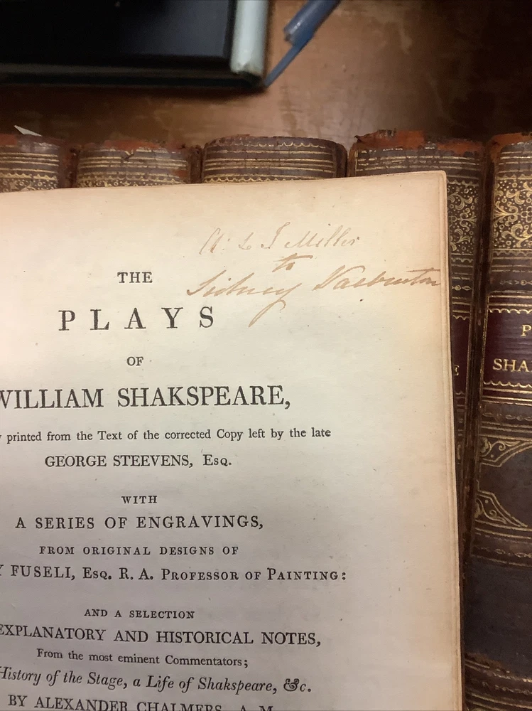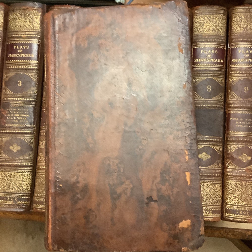 The Plays of William Shakspeare (Shakespeare). 9 volumes. Complete. Full leather bindings. Seemingly rebound with new spines. General wear to bindings, some spine labels missing. Gift inscription on the title page of every volume. Black-and-white illustrations.
