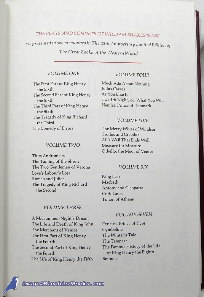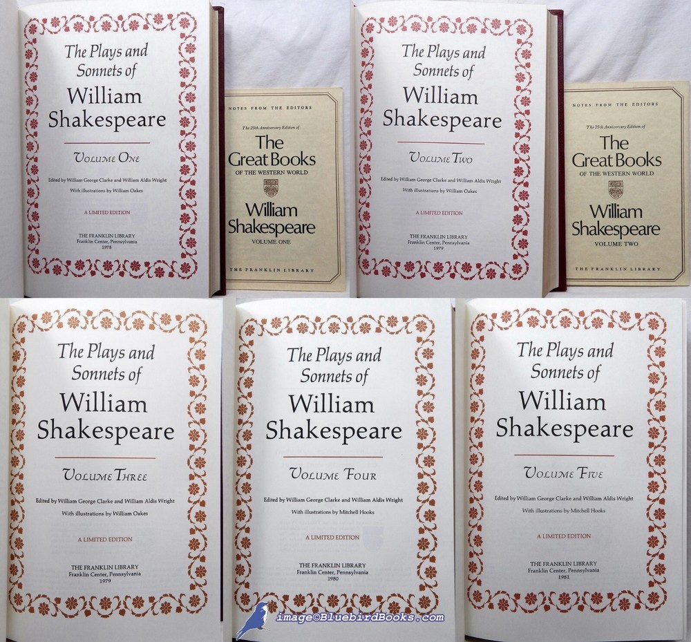 Available from Bluebird Books : The Plays and Sonnets of William Shakespeare five volume set (of the original seven) in deluxe Franklin Library leatherbound volumes Description: Volumes one through five of the original seven-volume set. Many of the plays of William Shakespeare are presented in a deluxe leatherbound reprint set by the Franklin Library. Edited by William George Clarke and William Aldis Wright. With illustrations by William Oakes. Missing are volumes 6 & 7, which contained King Lear, Macbeth, Antony and Cleopatra, The Tempest (among others), as well as Shakespeare's Sonnets. Issued as part of the publisher's collection, the 25th Anniversary Limited Edition of the Great Books of the Western World. One of an unspecified number in this limited edition. Publisher's "Notes from the Editors" booklet is included with volumes 1 and 2 only. Bound in full dark red bonded leather covers with four raised bands on each spine. Spine titling, elaborate decorations to covers and spines, and textblock edges all in bright gilt. Interior leaves printed on high-quality papers. Deep red silk moire endpapers, with matching sewn-in satin ribbon placemarkers. Volumes lack dust jackets (as issued). About-Fine copies: bright and apparent damages or evidence of having been read. Book Condition*: Fine Dust jacket condition*: none City: Franklin Center, Pennsylvania Publisher: The Franklin Library Size: Tall Octavo - 9 to 10 in. tall Publication Date: 1978-1981 Binding: leatherbound hardcover About Bluebird Books: YOUR EXPECTATIONS AND MY PROMISE: Bluebird Books is an independent, internet-based bookseller in metro Denver, Colorado (USA) and operated by me, Eric Mayer. I am proud to be a member of both the Rocky Mountain Antiquarian Booksellers Association (RMABA) and the Independent Online Booksellers Association (IOBA). I imagine that you expect to be getting a quality item which has been accurately described, carefully packed, and promptly shipped to you. That is also my promise to you. SPECIALTIES: My specialties include 19th and 20th Century Classic Fiction and Literature; Fine Bindings; Illustrated Classics; Books about Birds, Wildlife and Natural History; Biography and Autobiography; History; as well as a wide variety of books on other subjects. I feature works published by the Modern Library, Everyman's Library, Limited Editions Club and other fine publishers. I am always on the lookout to buy similar items. PAYMENT TERMS: I expect payment at the time the item is ordered. Payment may be made through PayPal or with major credit cards. SHIPPING: I ship my books promptly (almost always on the next business day after order or sooner) from my base in Colorado in well-wrapped, crush- and moisture- resistant protective packaging. US shipments include Delivery Confirmation bar coding, so you can track the progress of your shipment. RETURNS: All items are sold on a satisfaction guaranteed basis. I guarantee the condition of every item as described. If you are dissatisfied with your purchase because it is not as described, I will refund the price of the item plus shipping costs both ways. If you've changed your mind about an item, or you just want to return it, I will ask that you pay for the shipping and I'll cheerfully refund the price of the book. In either case, items must be returned within 30 days of the date of receipt. *A NOTE ABOUT USED BOOKS AND CONDITION VALUES: I rate books and dust jackets on a scale from AS NEW to POOR, as follows: AS NEW - Used when the book or dust jacket is in the same immaculate condition as when it was published, with no defects. FINE - Approaches the condition of AS NEW, but lacking the crispness of a new book. These books or dust jackets should have no defects. NEAR FINE - Approaching FINE but with slight flaws. VERY GOOD - Describes a book or dust jacket that does show some small signs of wear or slight damage. GOOD - Describes the average used worn book or jacket that has flaws and/or damages. (An old bookseller said it best, "In rare books, Good ain't good".) FAIR - Worn book or jacket that is stained, has loose pages, tears, or otherwise has some sort of significant damage or other issue. POOR - Describes a book that is worn, damaged, stained or otherwise beat-up, making it useful as a reading copy but possibly not a collector copy. A POOR dust jacket is likely heavily torn, chipped or otherwise damaged. (A ' + ' or a ' - ' can indicate a shading of these values...either a nudge up, or a nudge down.)
