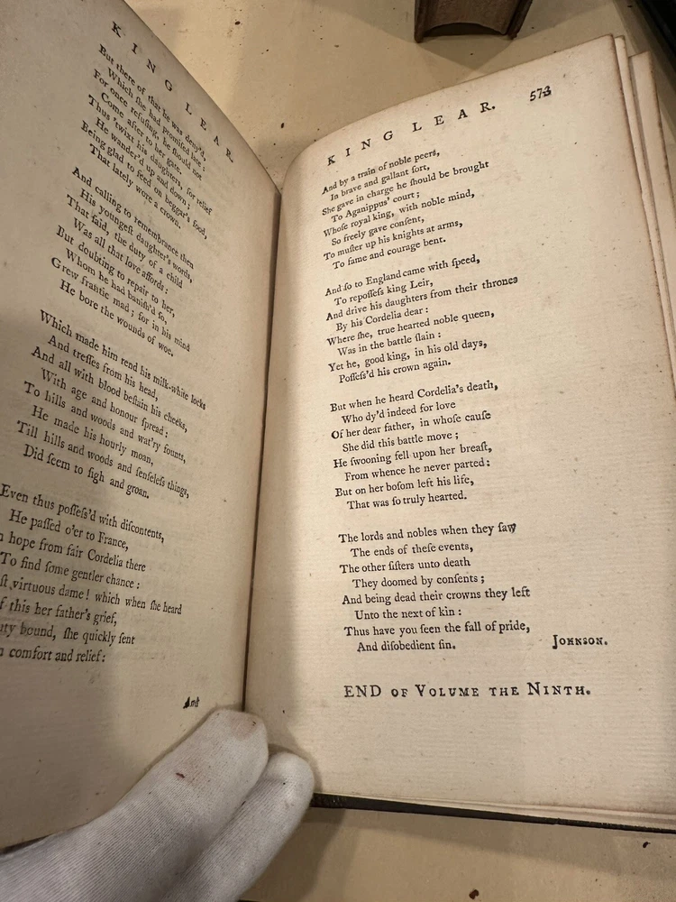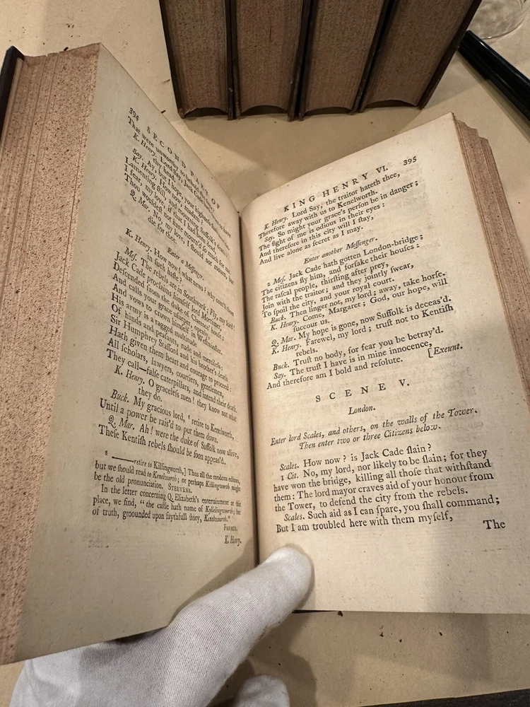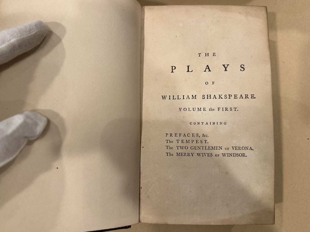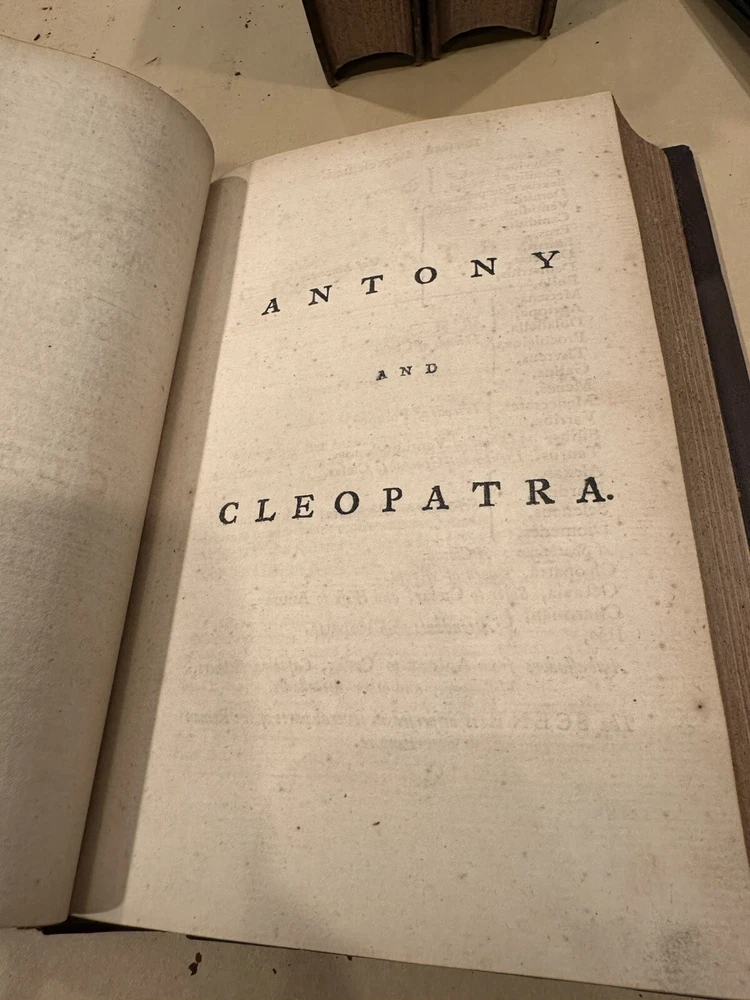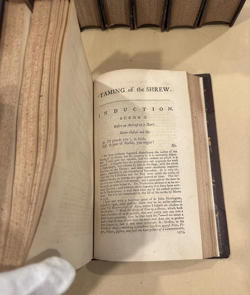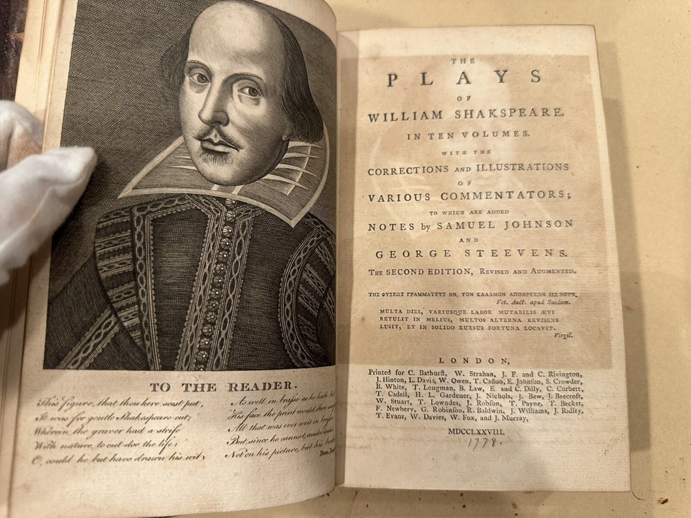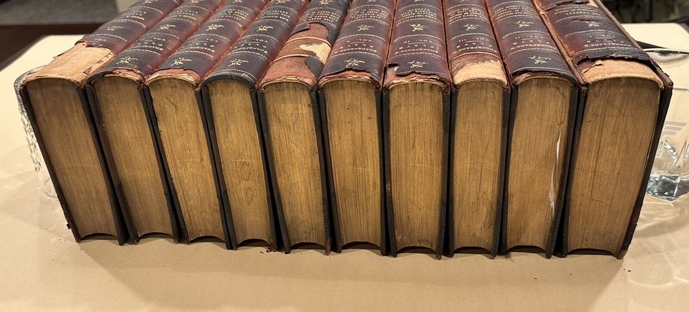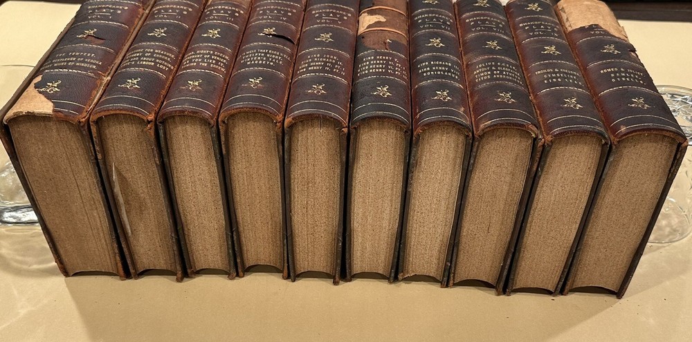 Printed in 1778 this is the second edition of William Shakespear’s plays complete in 10 volumes with corrections and illustrations of various commenters to which are added notes by Samuel Johnson and George Steevens. Included is volumes 1,2,3,4,5,6,7,8,9 & 10. The books are bound in original brown leather. The pages throughout the set are yellowed and have some discolourations however they are all in tact and it does not appear to have any missing pages at all. There are a few pencil markings/notations The spines are strong and the pages still tightly bound. The ink is dark and the pages very readable. The most defects will be to the brittle exterior leather . Some of the volumes covers are still attached and there are a few that the either the front or back cover has come off. There is also some missing pieces of leather along the spine as photographed. Some of them still have gold trim. This is a great collection for any literary connoisseur!