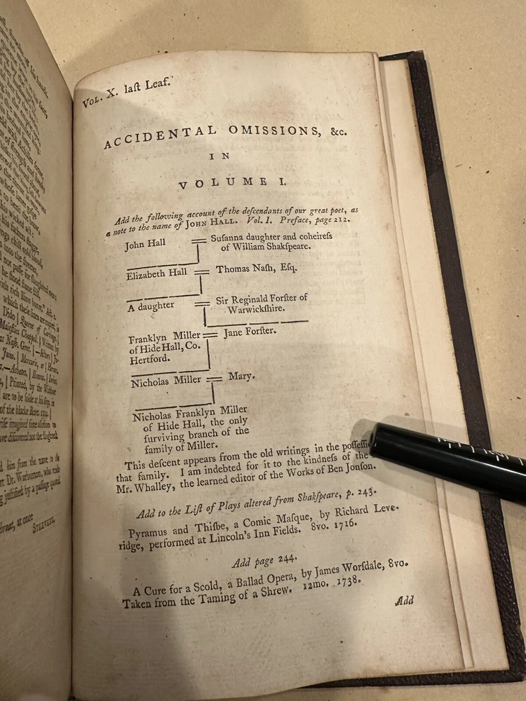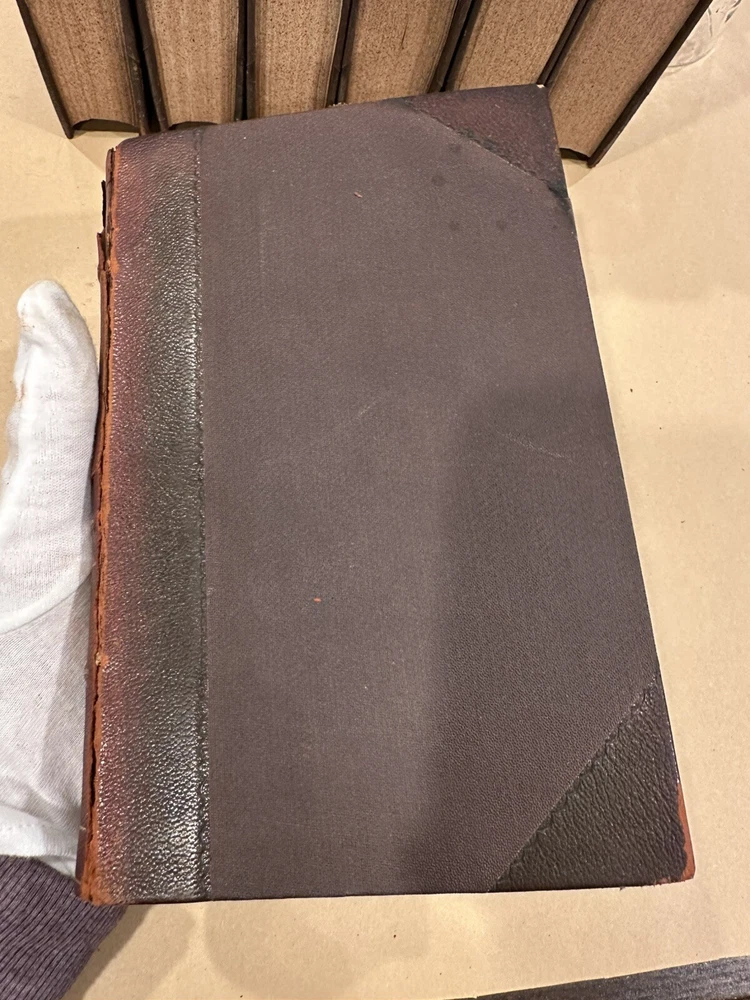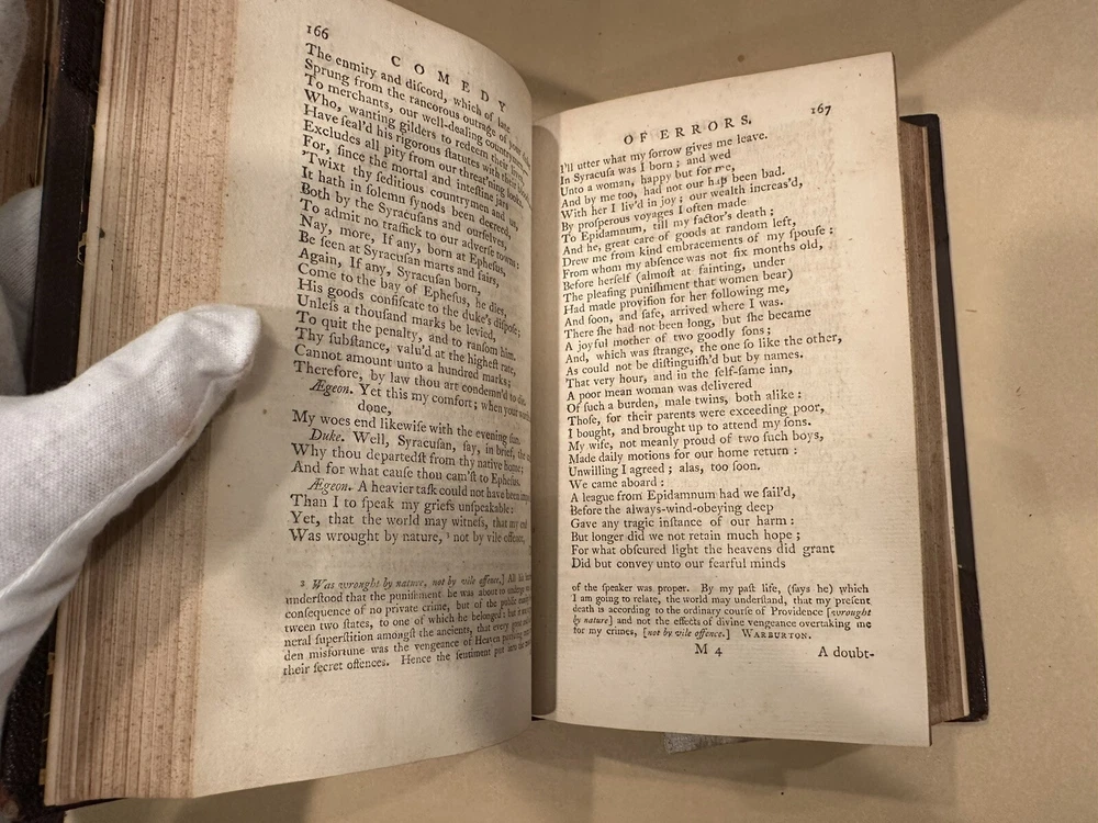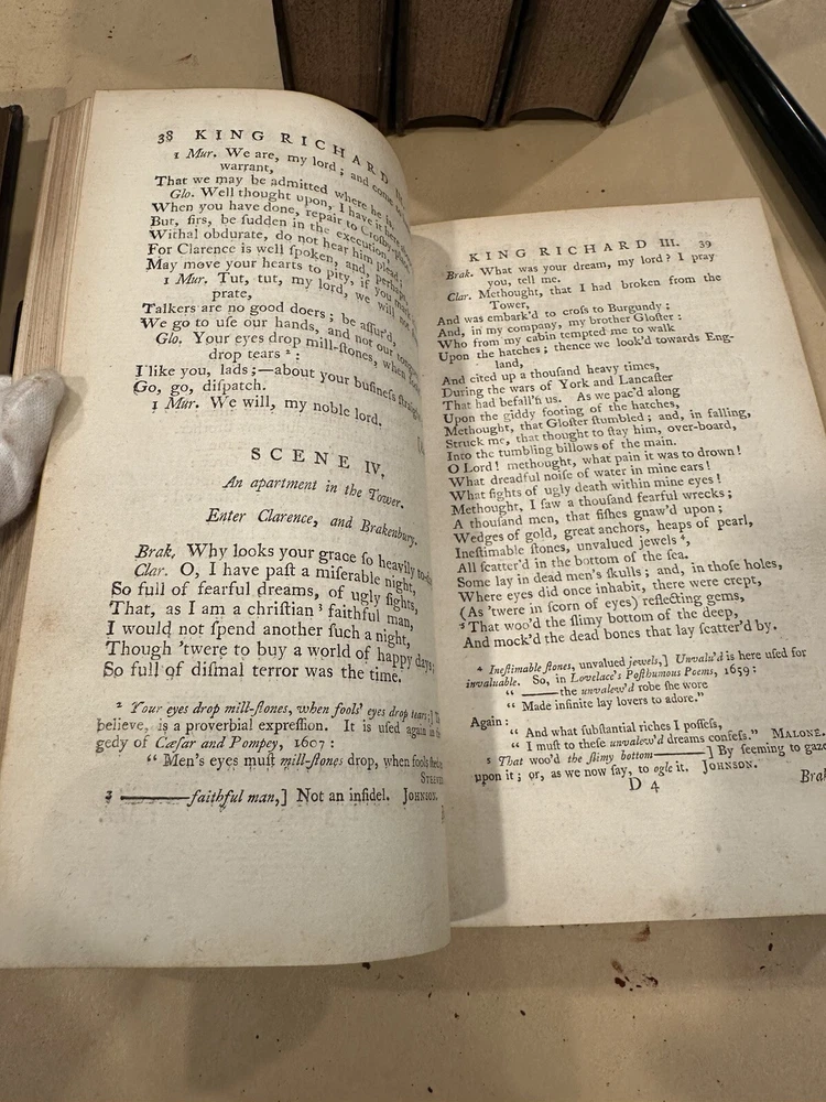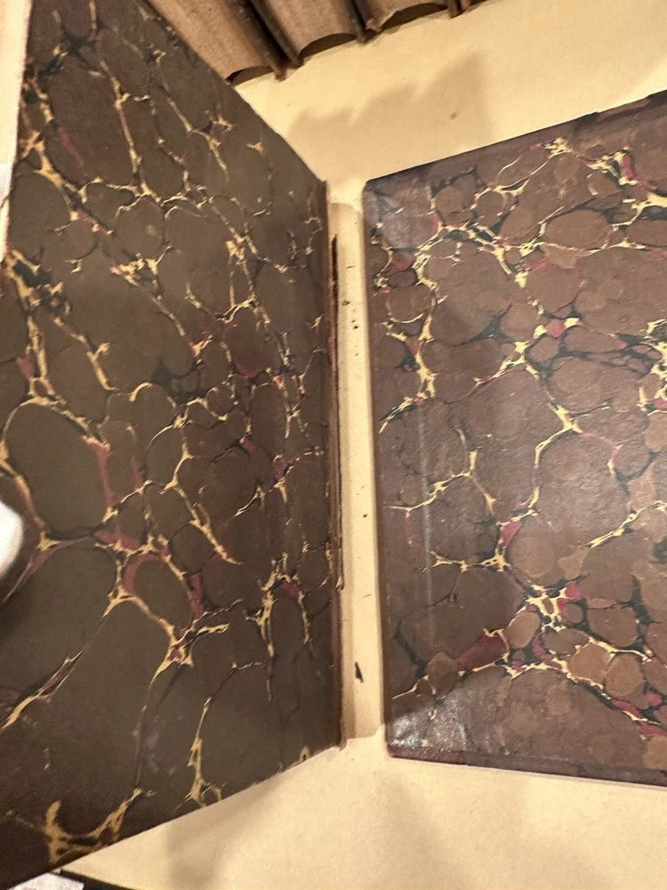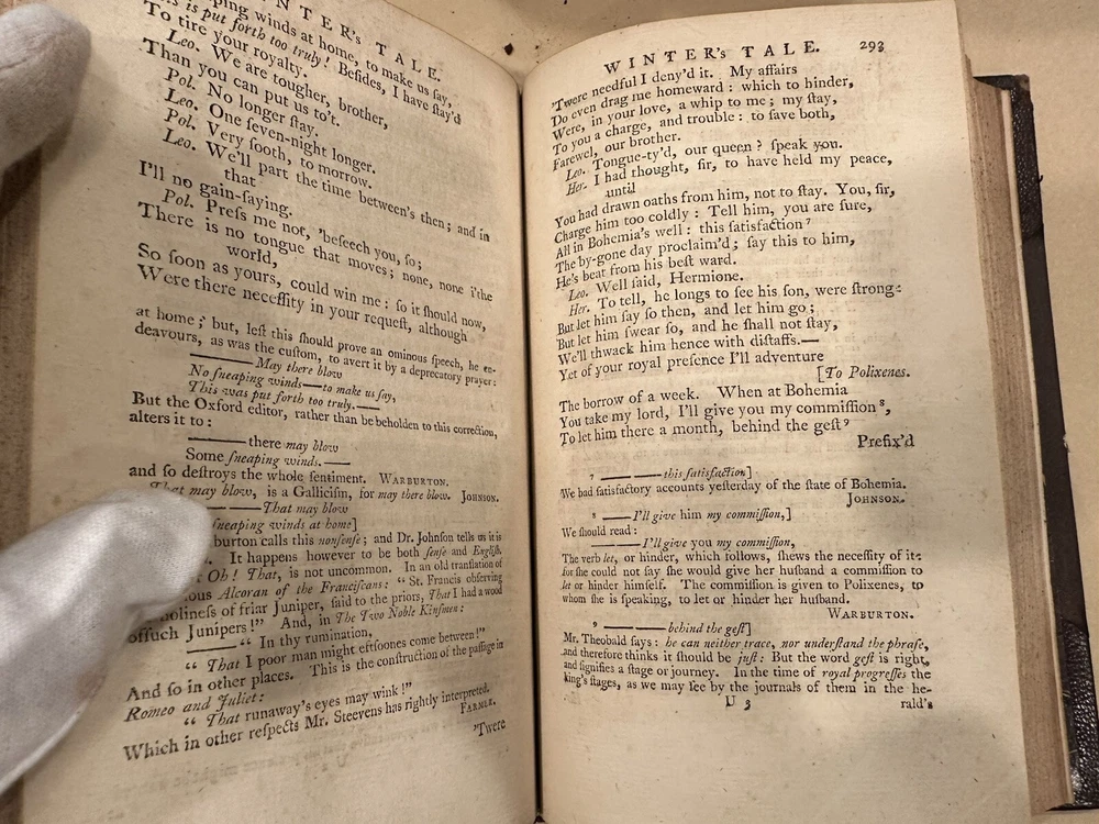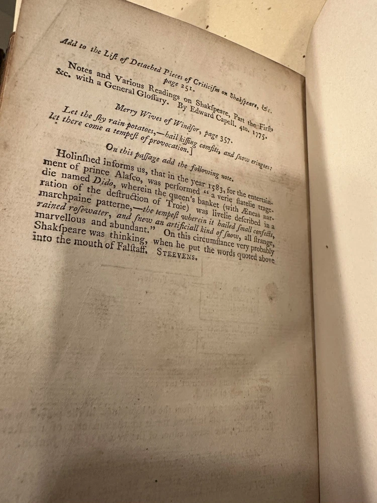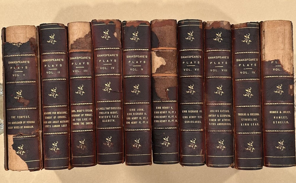 Printed in 1778 this is the second edition of William Shakespear’s plays complete in 10 volumes with corrections and illustrations of various commenters to which are added notes by Samuel Johnson and George Steevens. Included is volumes 1,2,3,4,5,6,7,8,9 & 10. The books are bound in original brown leather. The pages throughout the set are yellowed and have some discolourations however they are all in tact and it does not appear to have any missing pages at all. There are a few pencil markings/notations The spines are strong and the pages still tightly bound. The ink is dark and the pages very readable. The most defects will be to the brittle exterior leather . Some of the volumes covers are still attached and there are a few that the either the front or back cover has come off. There is also some missing pieces of leather along the spine as photographed. Some of them still have gold trim. This is a great collection for any literary connoisseur!